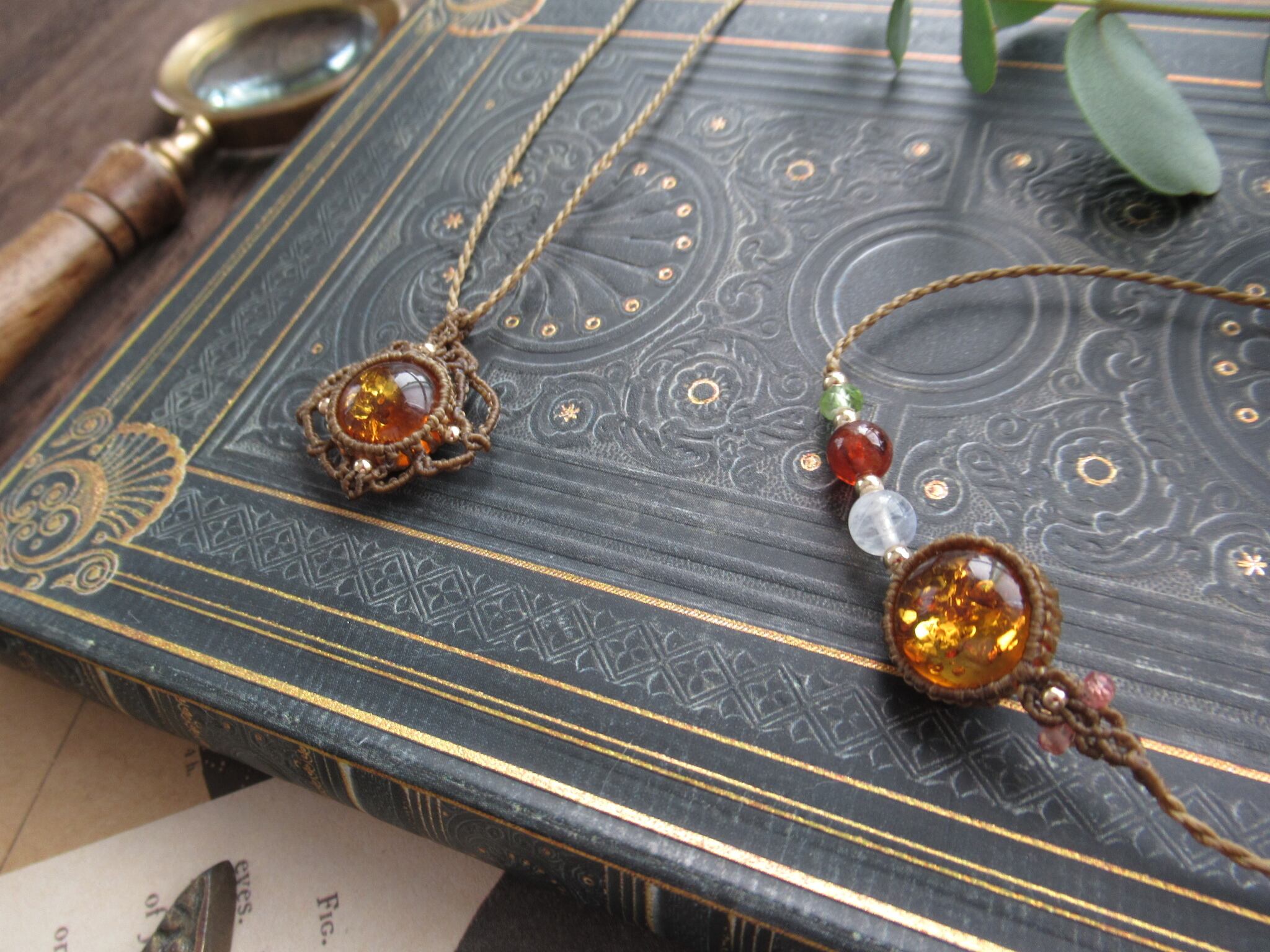 アンバーは内包のクラックにより、光が入る角度によって夕陽のようなキラキラとした輝きがご覧いただけます。糸色はチョコレートブラウンで、カジュアルに使いやすくアンバーを美しく引き立てるお色で、日本人の肌色に合いやすいすっきりとした色合いが特徴です。
