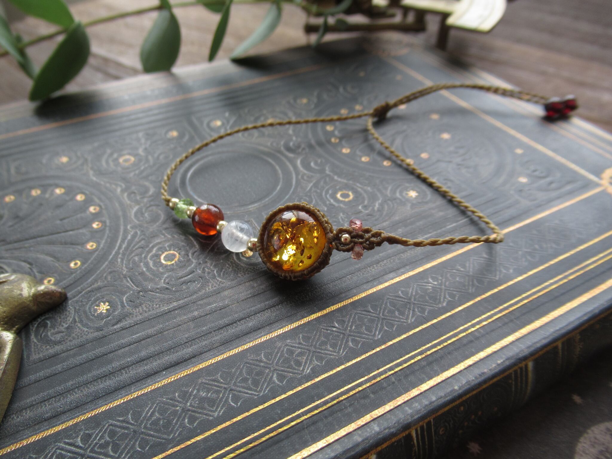 アンバーの隣の3粒の天然石は、ブルーのシラーが美しいホワイトラブラドライト、ヘソナイトガーネット、宝石質のペリドットを組み合わせました。メリハリのあるパッと目を引く印象的な色合いなので、落ち着きすぎず派手すぎない色合いです。編み込みには小さいですが、宝石質のオレンジピンクのサファイアをあしらいました。結び石はガーネットです。