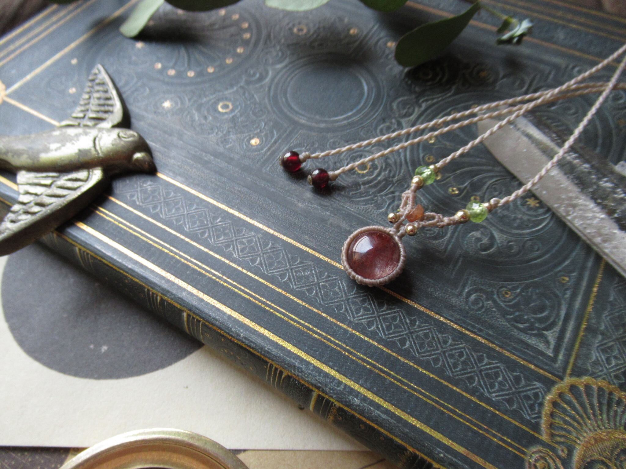 編み込みのアクセントには中央にサンストーン、左右にペリドットをあしらっています。結び石はガーネットをあしらいました。