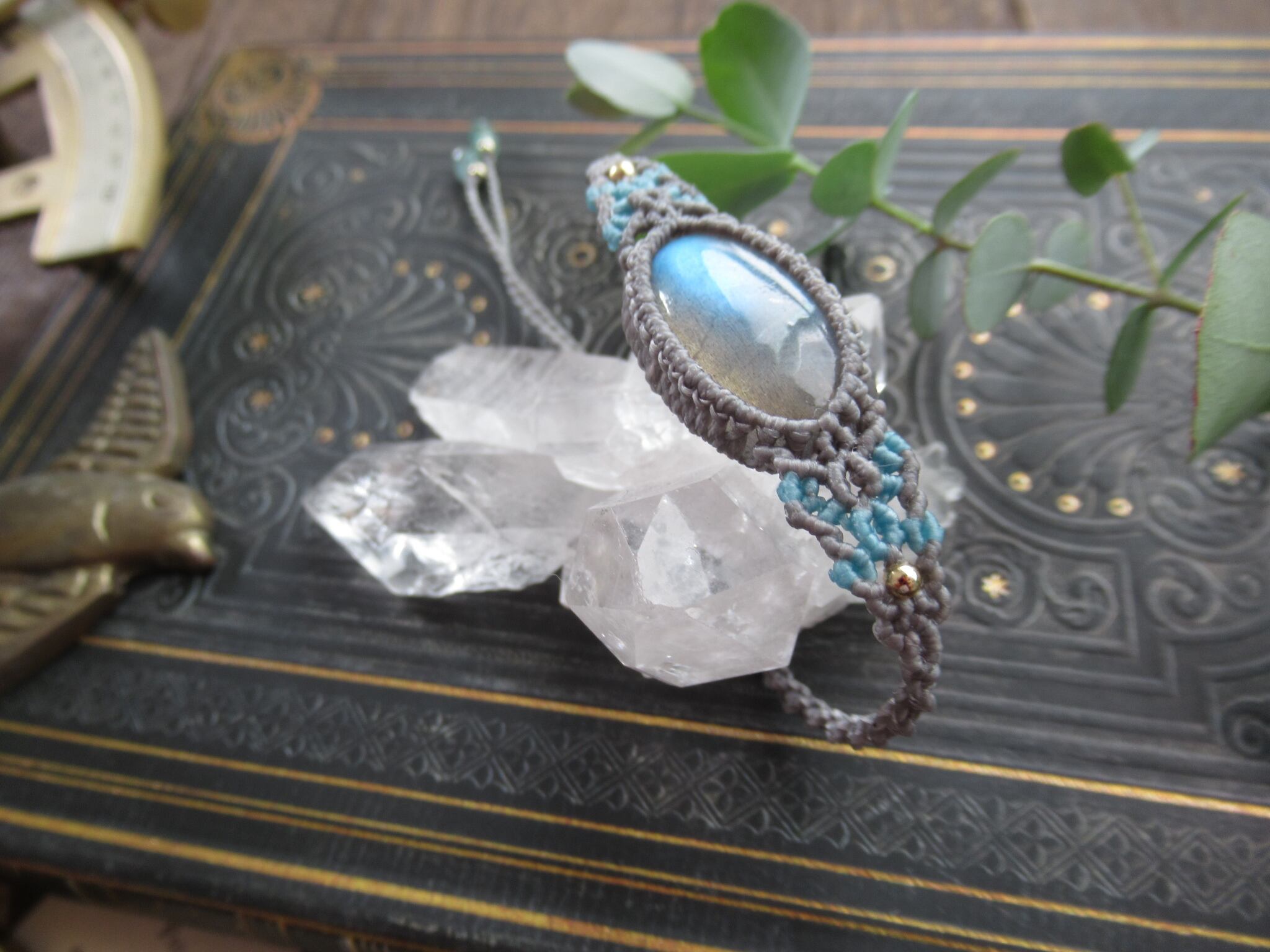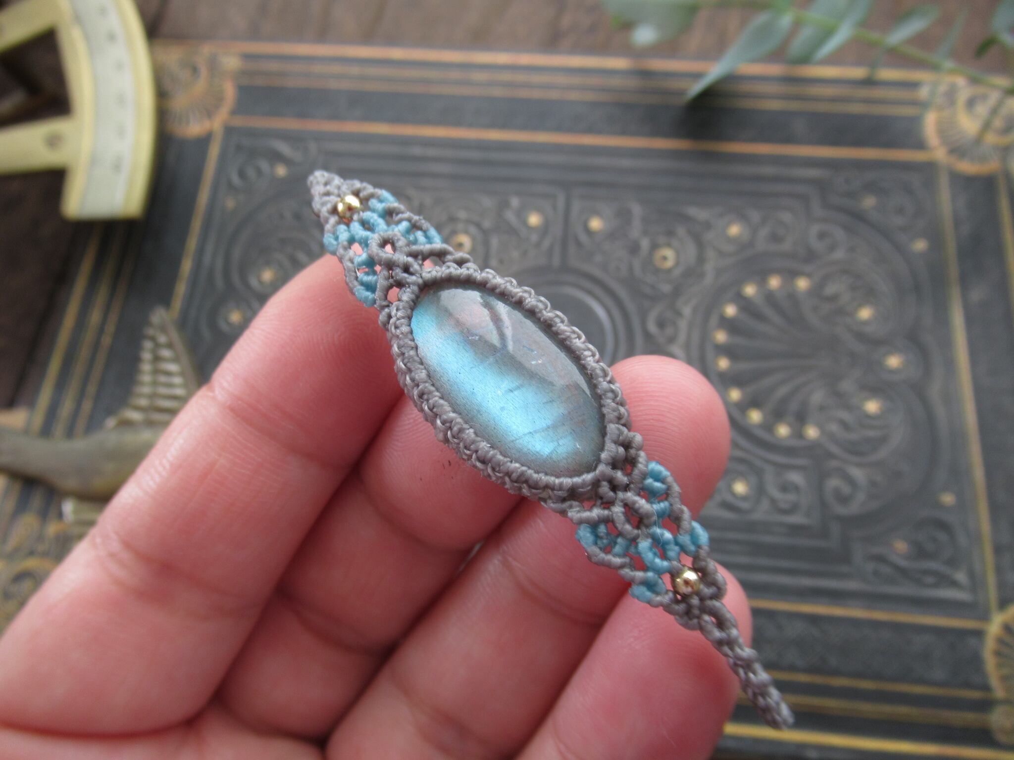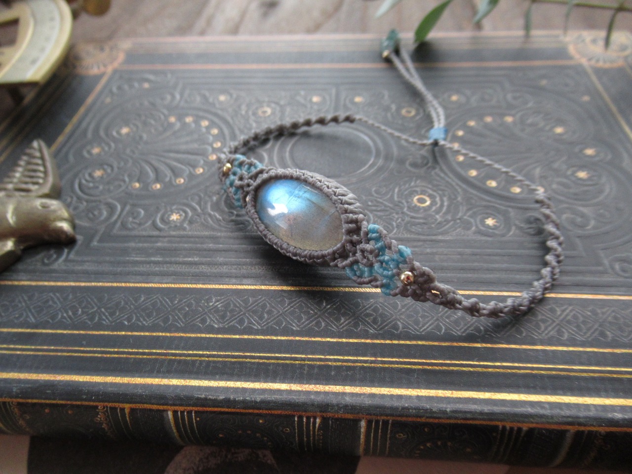 大粒ライトブルーラブラドライトのマクラメブレスレット
