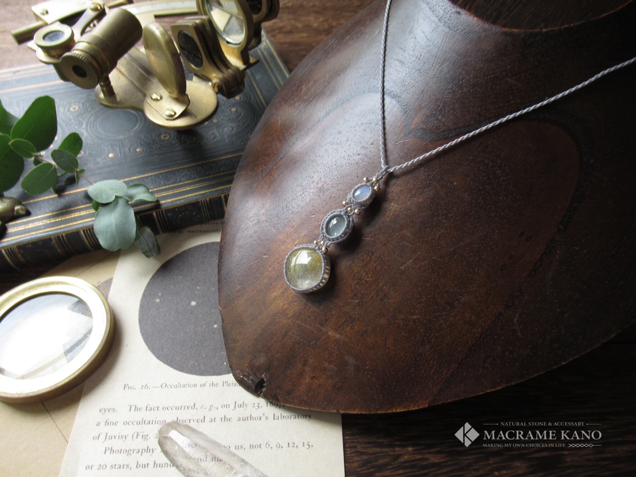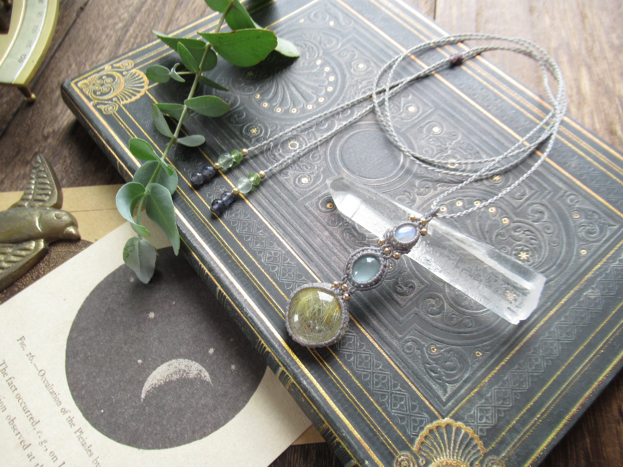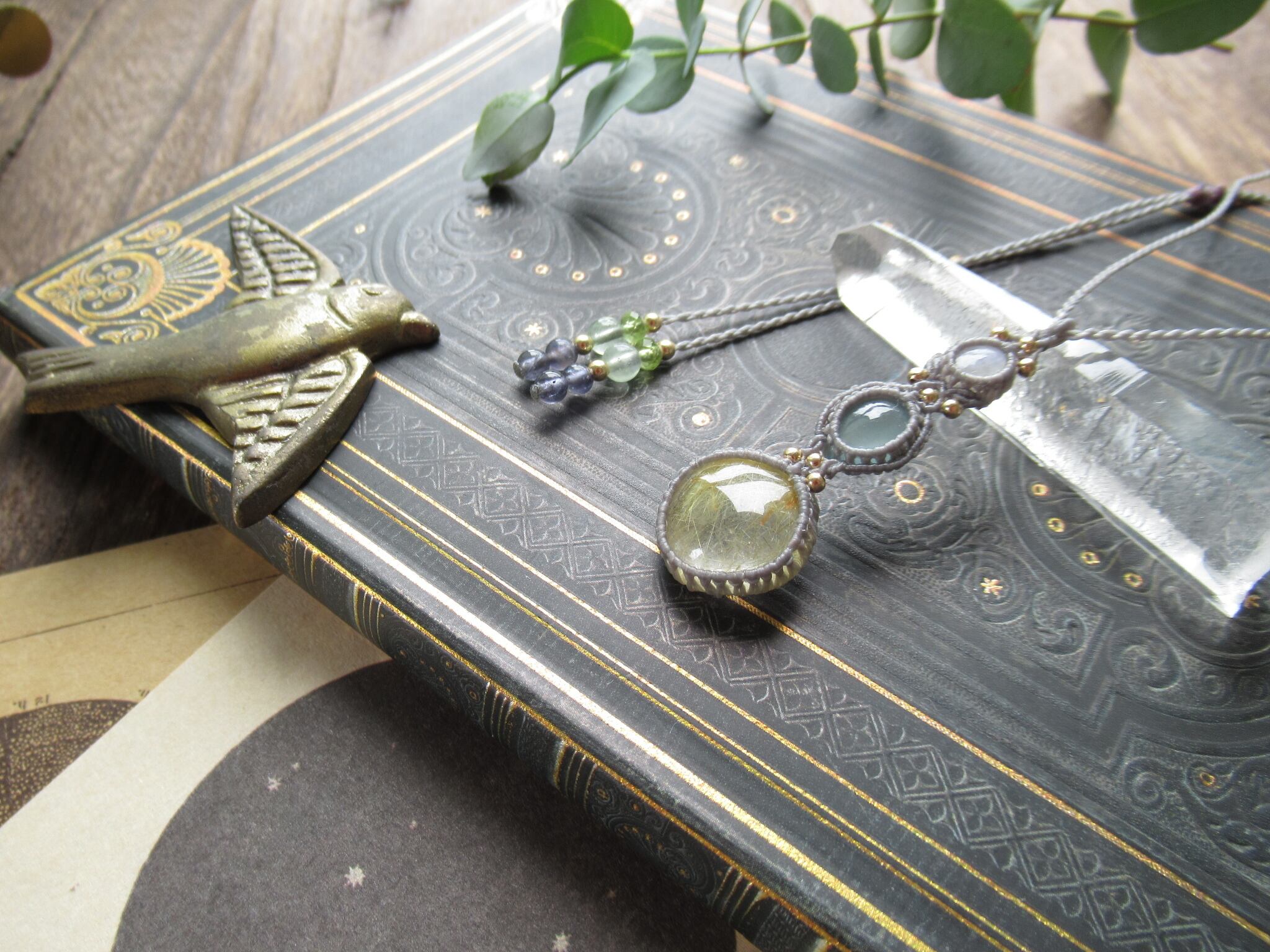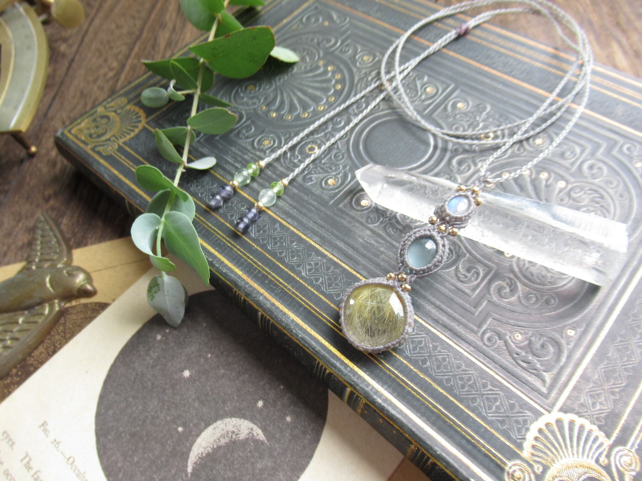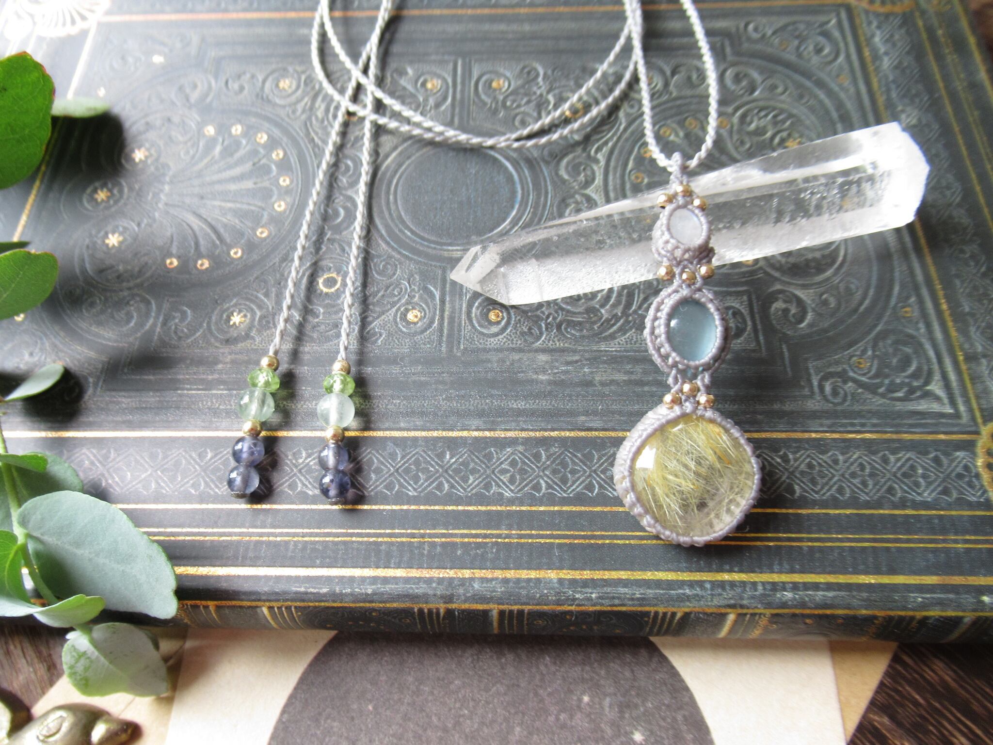 ルチルクォーツ×キャッツアイアクアマリン×ホワイトラブラドライトのマクラメペンダント /0.25mm仕上げ