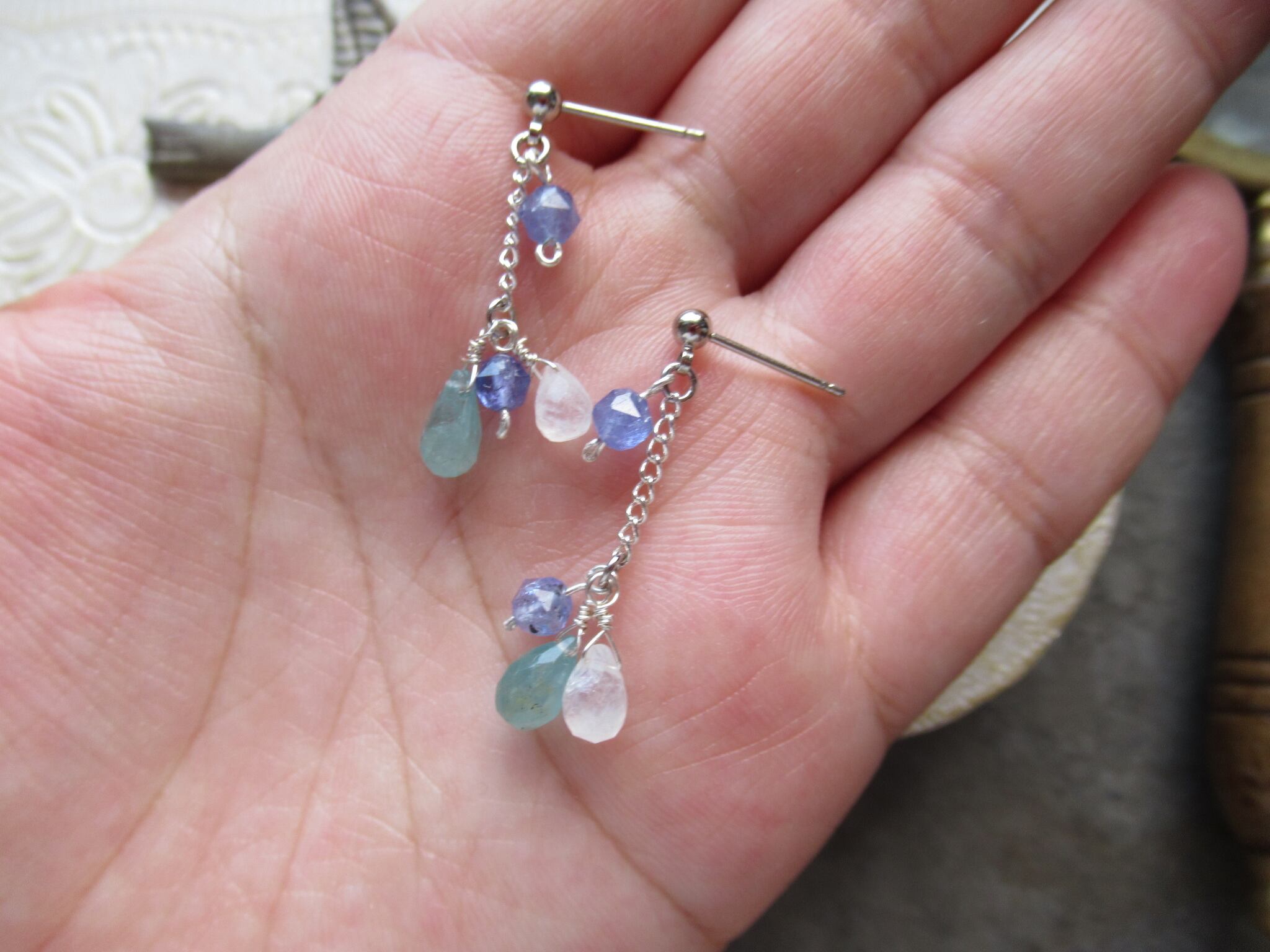 こちらは雫型の宝石質ホワイトラブラドライト、宝石質タンザナイト、宝石質のグランディディエライトをセレクト致しました。チェーンの先に3粒の色違いの天然石がしゃらりしゃらりと歩く度に揺れるデザインにしています。