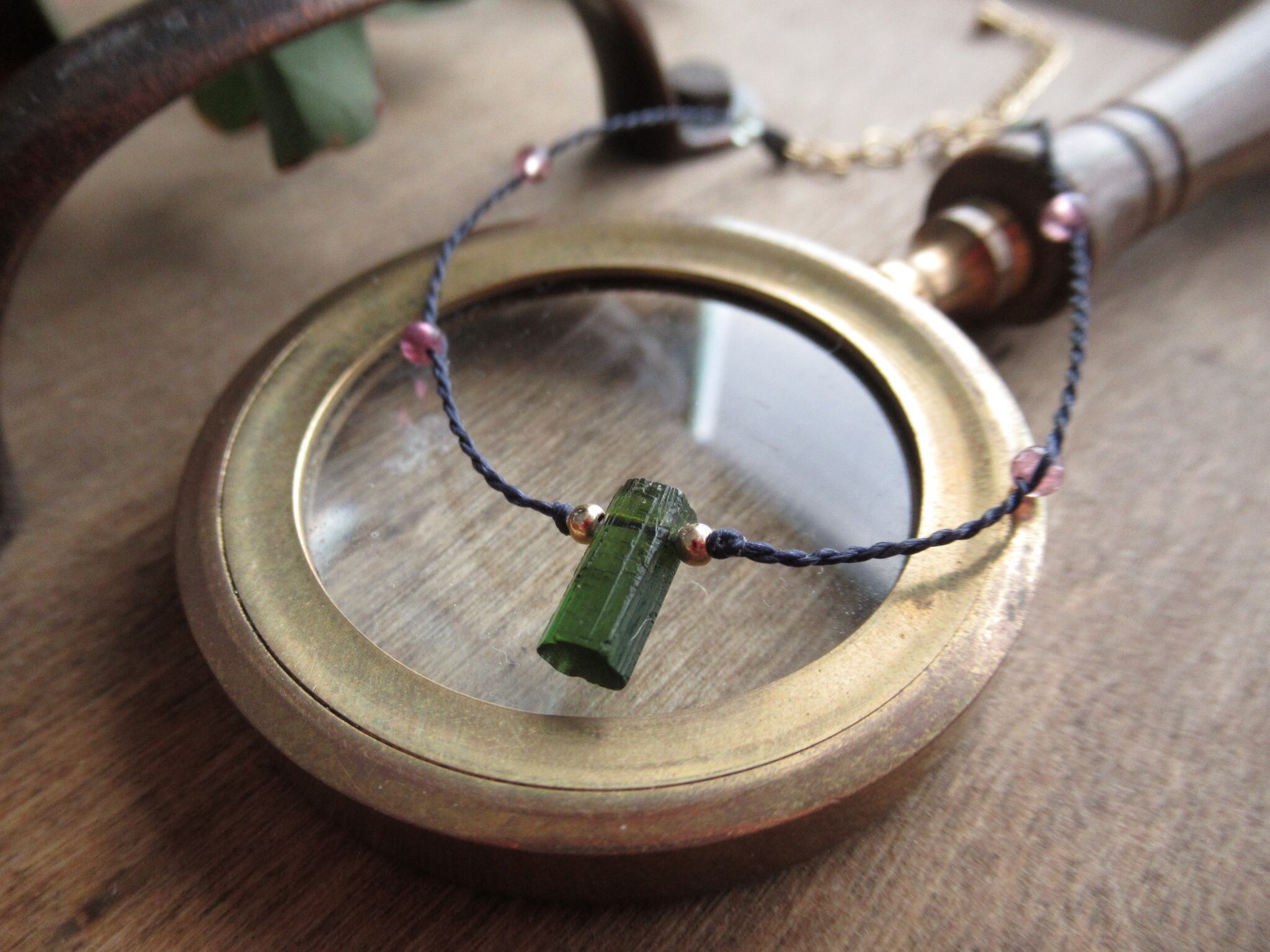 極細でとても軽く丈夫なマクラメコードを使用し、小さくも透明感のあるトルマリンのビーズをちりばめて仕上げております。