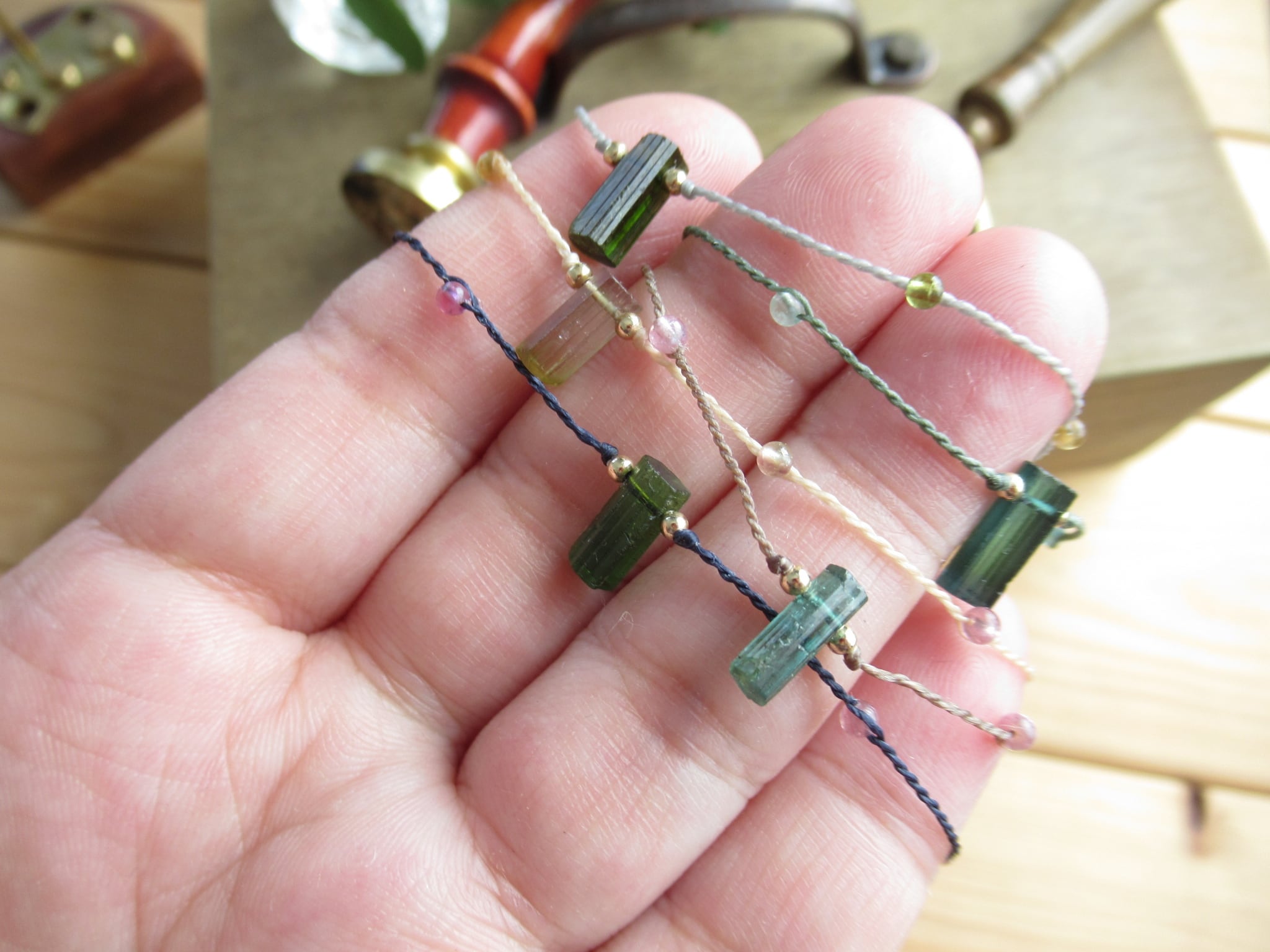 極細でとても軽く丈夫なマクラメコードを使用し、小さくも透明感のあるトルマリンのビーズをちりばめて仕上げております。