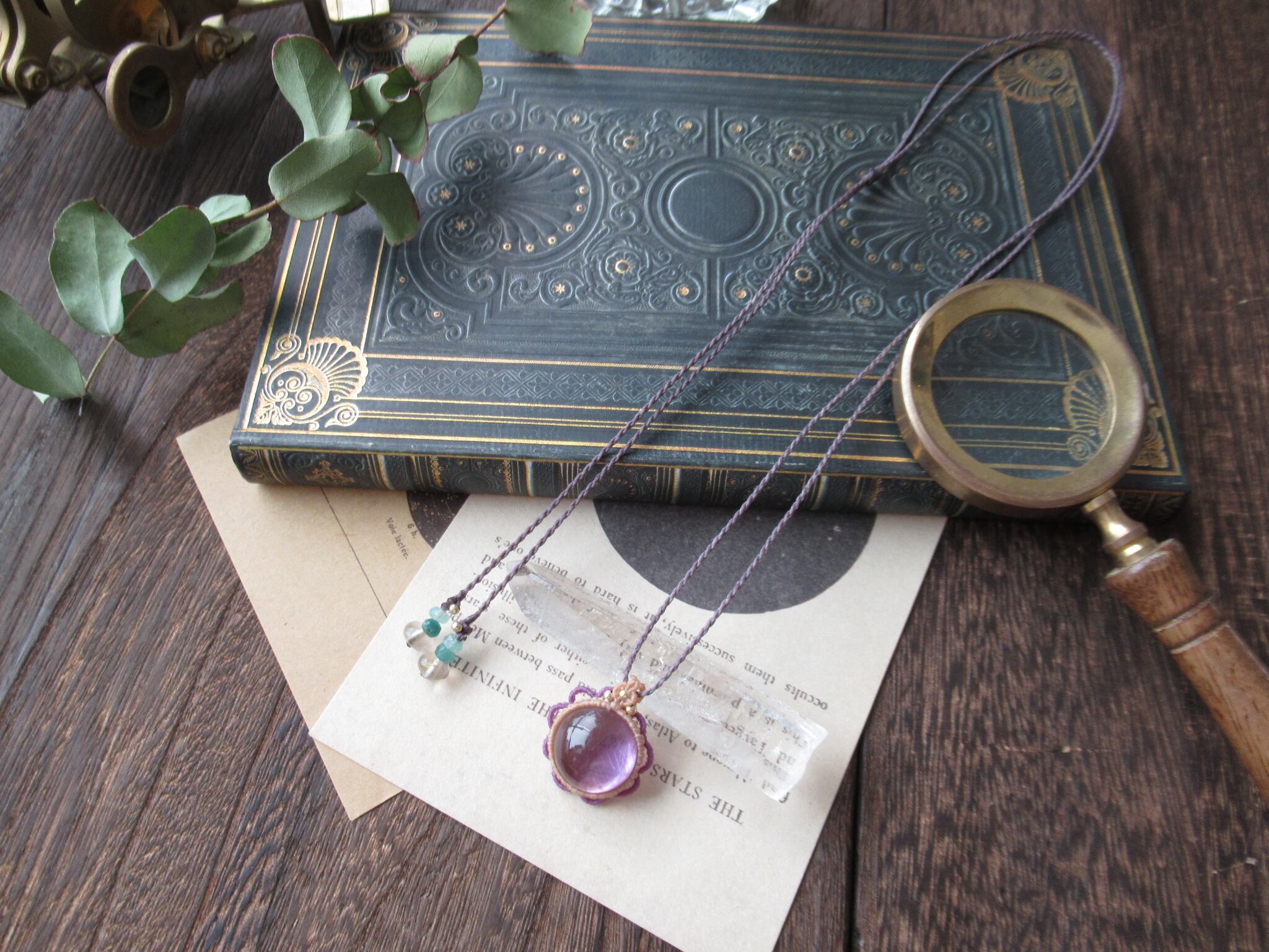 ぷっくりとした光沢感のある美しいルースで、光に透かすと山の形をした模様がご覧いただける愛らしく可愛らしいアメジストです。0.25㎜の糸で丁寧に編み込み丁寧に編み上げました。