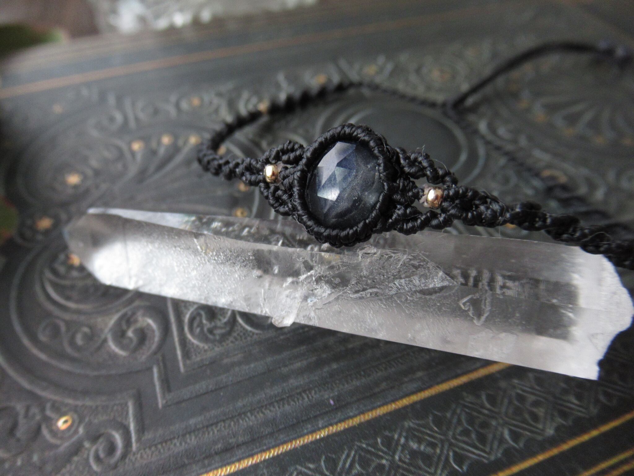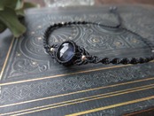 楕円形の複雑な輝きを持つオニキス×ラブラドライトとクリスタルのダブレッドストーンでマクラメブレスレットを製作いたしました。