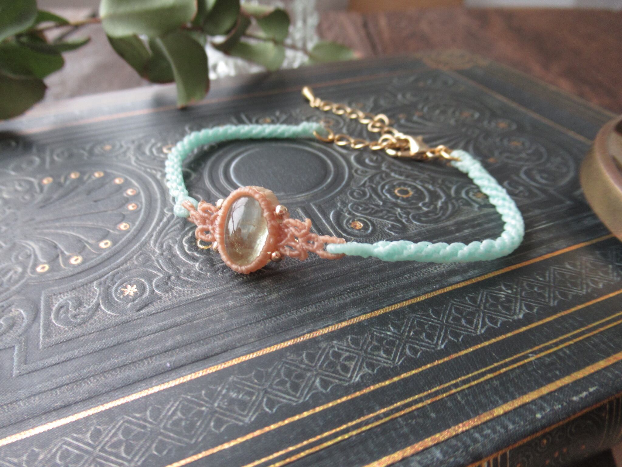 宝石質グリーンベリルのマクラメと真鍮金具のブレスレット / 0.25mm仕上げ