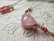 明るく桜色を少し濃くした色合いのモルガナイトをメインに、モザンビーク産ガーネットを左右のアクセントにあしらいました。0.25㎜の糸で丁寧に編み込み丁寧に編み上げています。連結部分を別々の工程で製作し組み上げておりますので、ペンダントトップの経年使用による摩耗が少し軽減される仕様です。