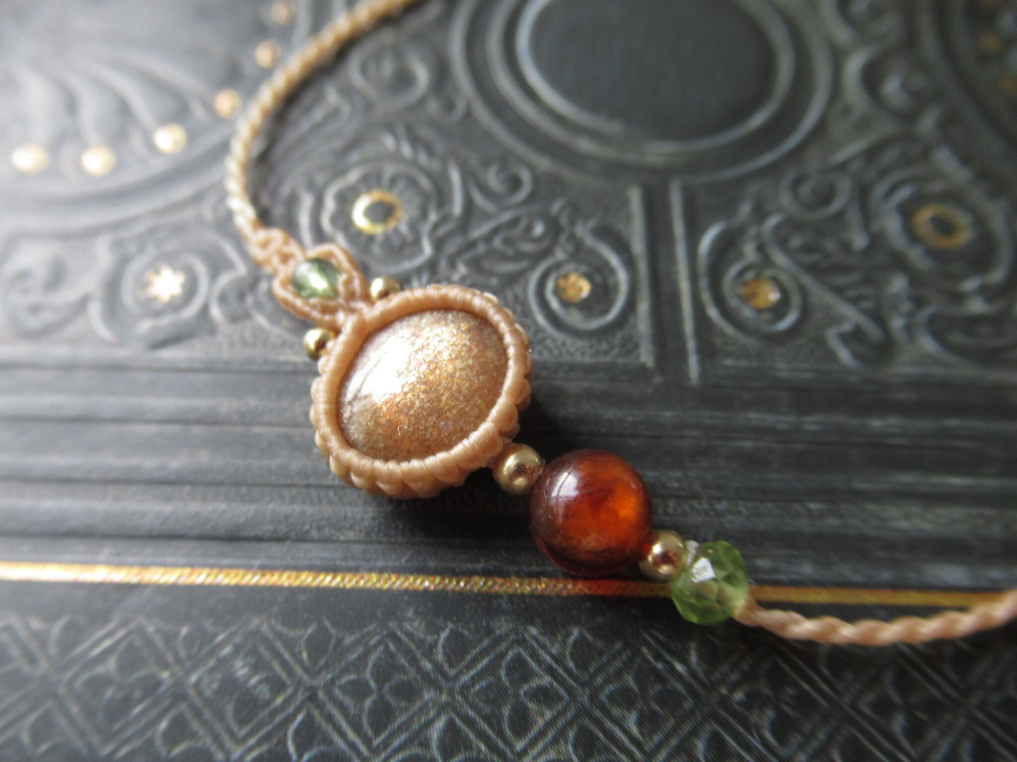 スターサンストーンは少し茶色みの濃い地色に細やかなオレンジ色のレッセンスが浮かび上がる美しいルースです。室内蛍光灯の下では十字の光というより、前面に滑らかに光沢が走るという印象です。ペンライトなど極強い光を当てると十字のような輝きがご覧いただけます。編み込みには宝石質のグリーントルマリンをあしらっています。