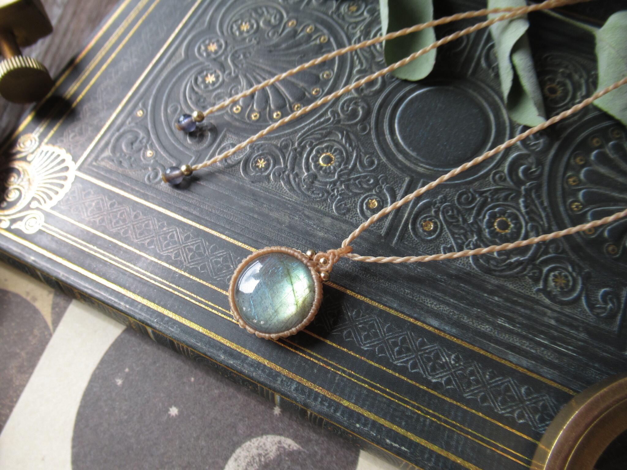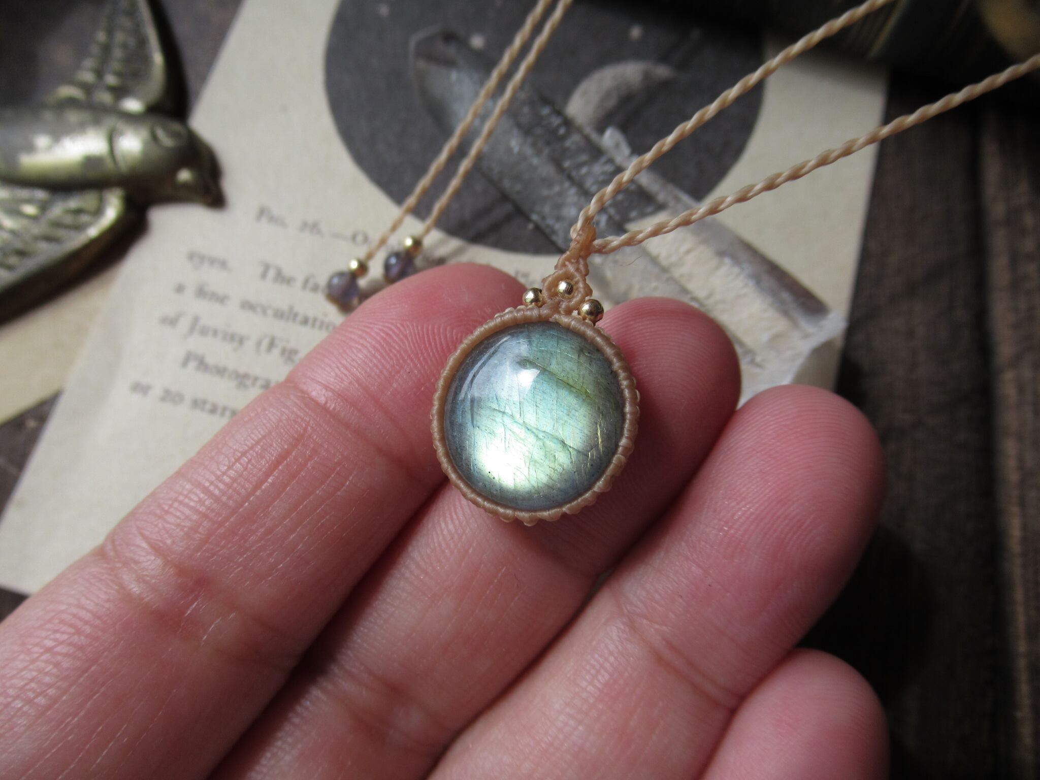 うるつやで円形のころん、としたかわいらしいライムグリーンラブラドライトでマクラメペンダントを製作いたしました。