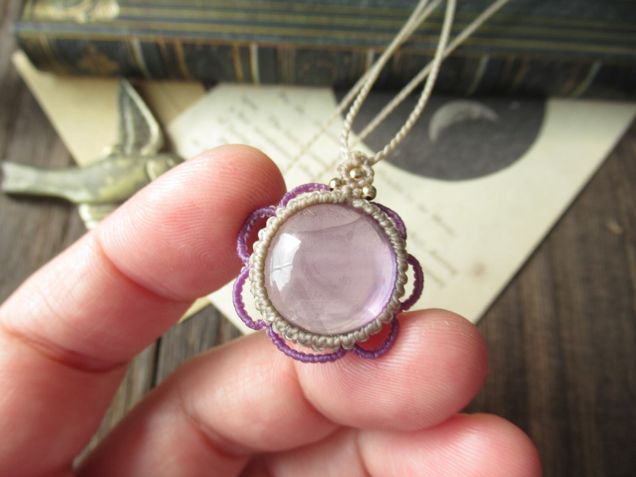 少し大きめのライトカラーパープルのブラジル産アメジストでマクラメペンダントを製作いたしました。