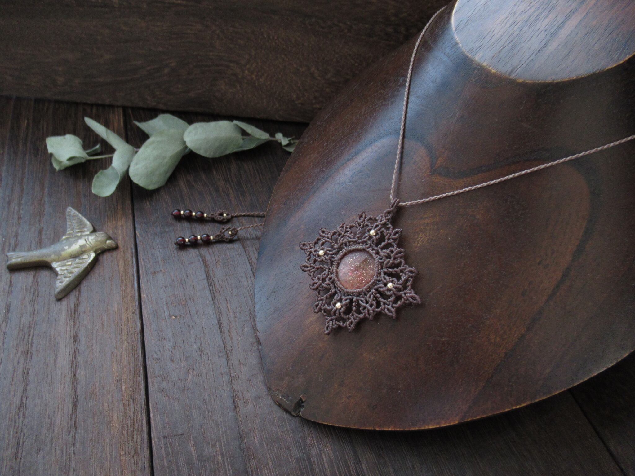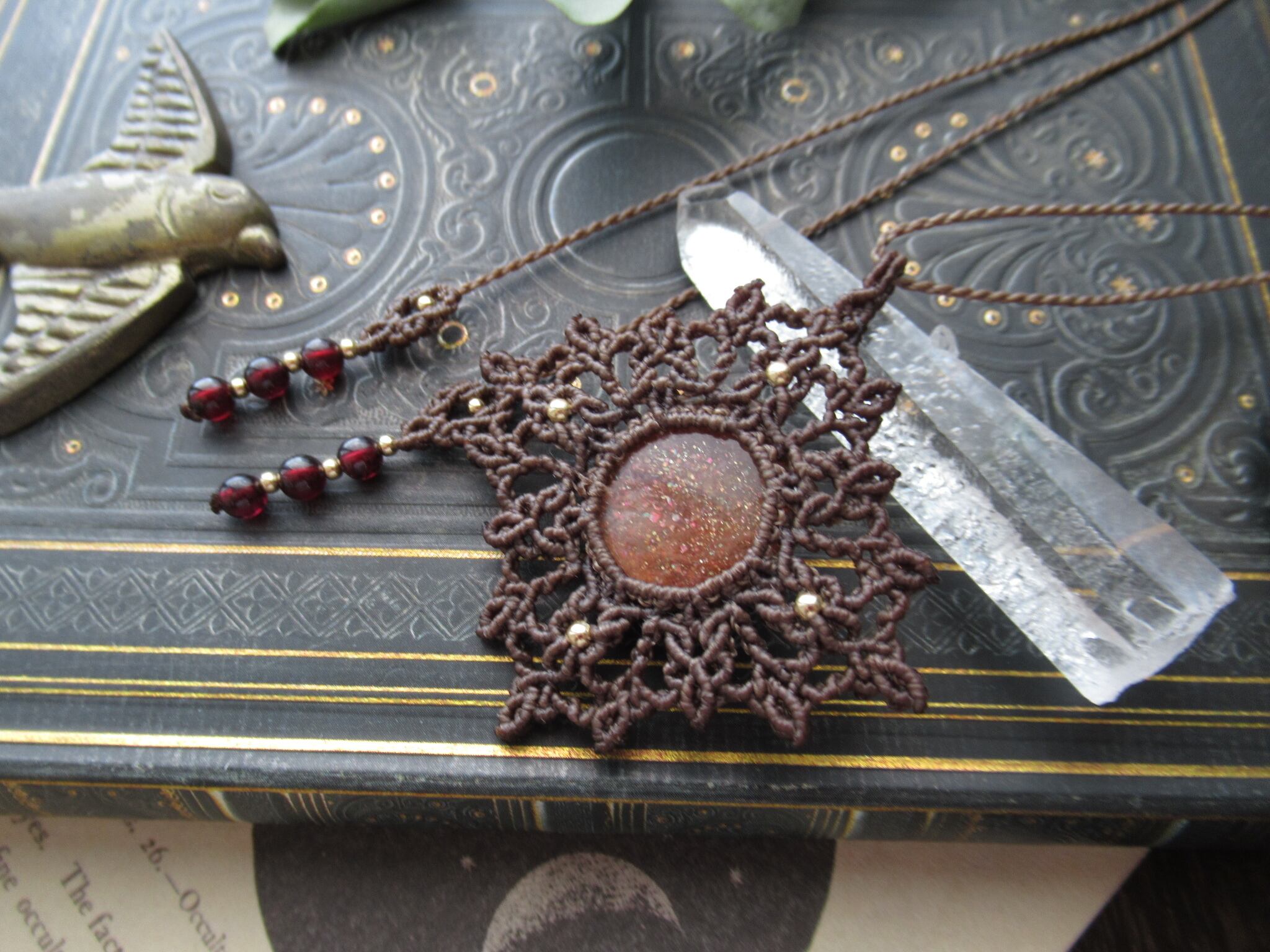 インド産虹色サンストーンのマクラメ曼荼羅ペンダント /0.5㎜仕上げ