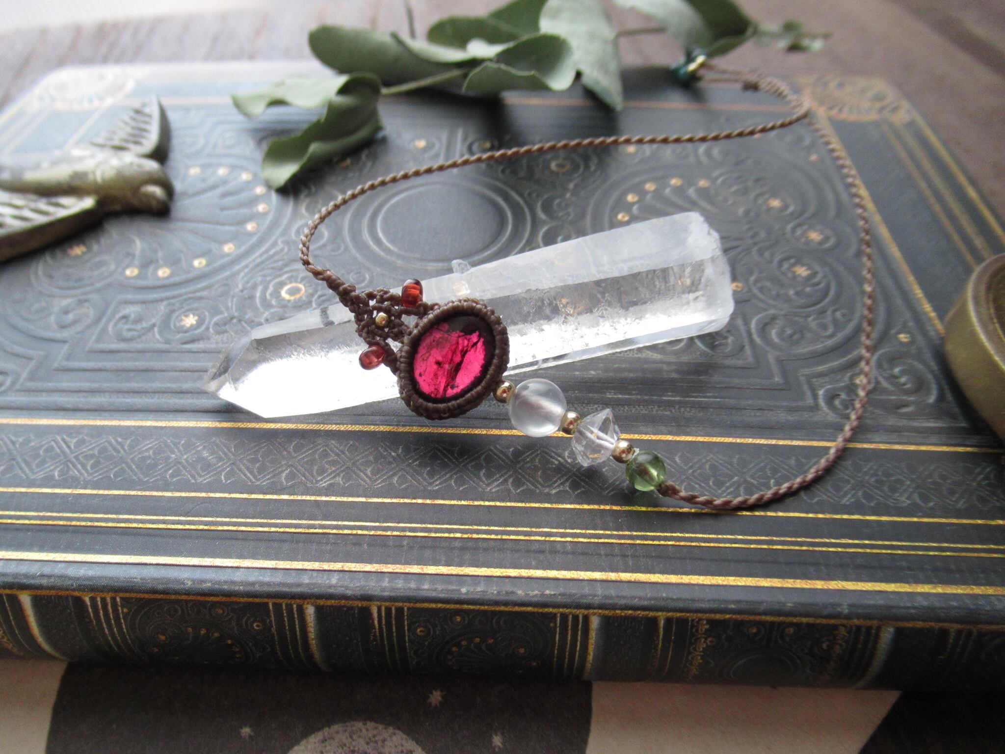 ガーネットはインクルージョンや内包クラックなど見られますが、ローズカラーを帯びた美しい美しい色合いです。編み込みにはモザンビーク産のガーネットをあしらっています。