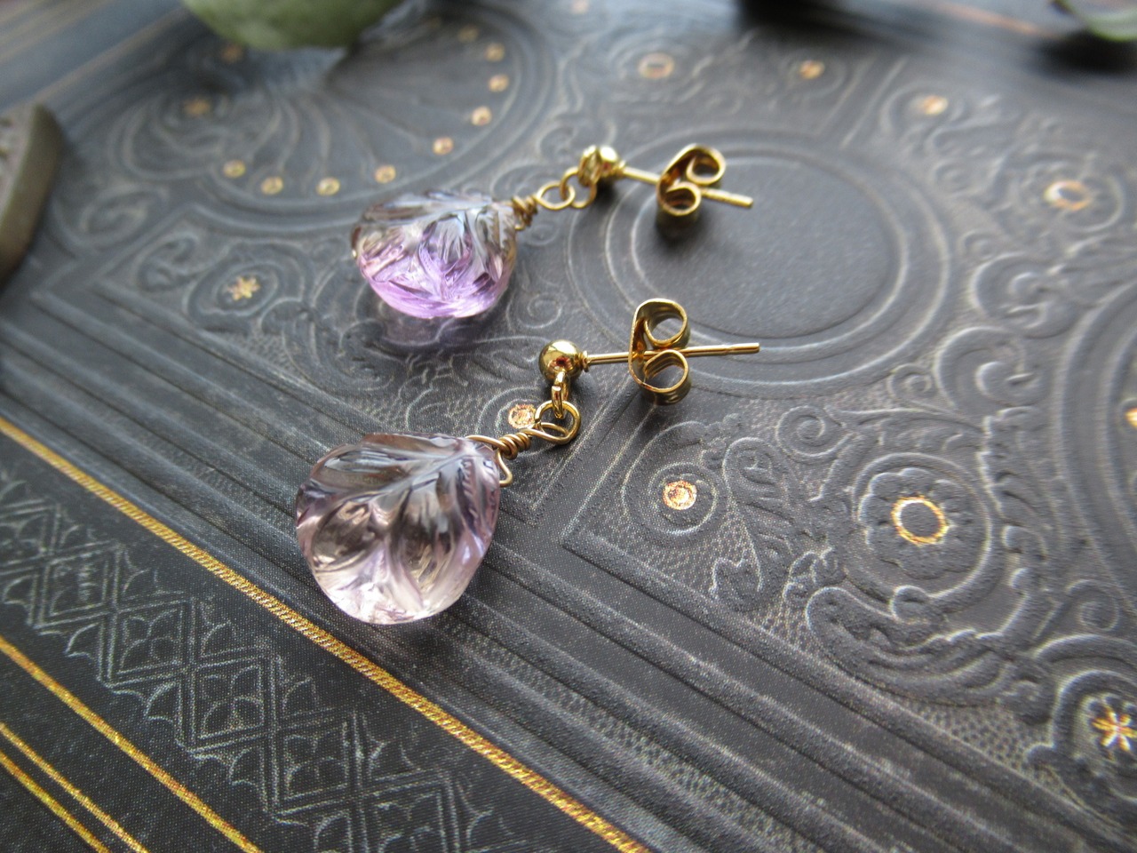 ビーズの表裏には葉っぱの模様が丁寧に彫り込まれているカービングタイプです。天然石も内包クラックや濁りなどがほとんど見受けられず、透明感のあるアメトリンらしいツートンの色合いがご覧いただけます。