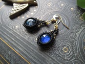 ブラックの糸で丁寧に編み上げた耳飾りで、グリーンみの強い色合いとブルーの色合いの強い色合いのルースをセレクト致しました。表面はローズカットされており、光が当たる角度によって美しいシラーと相まって表面がキラキラと輝きます。