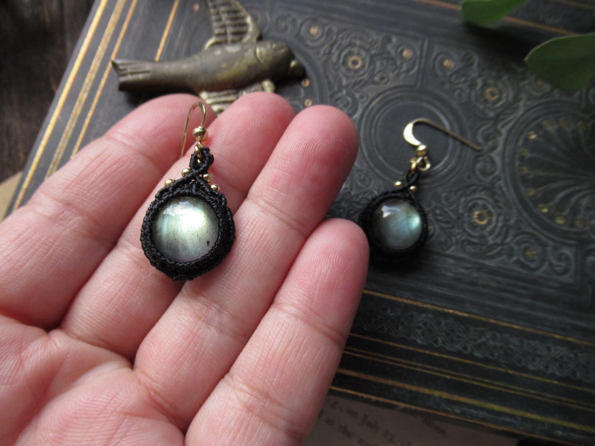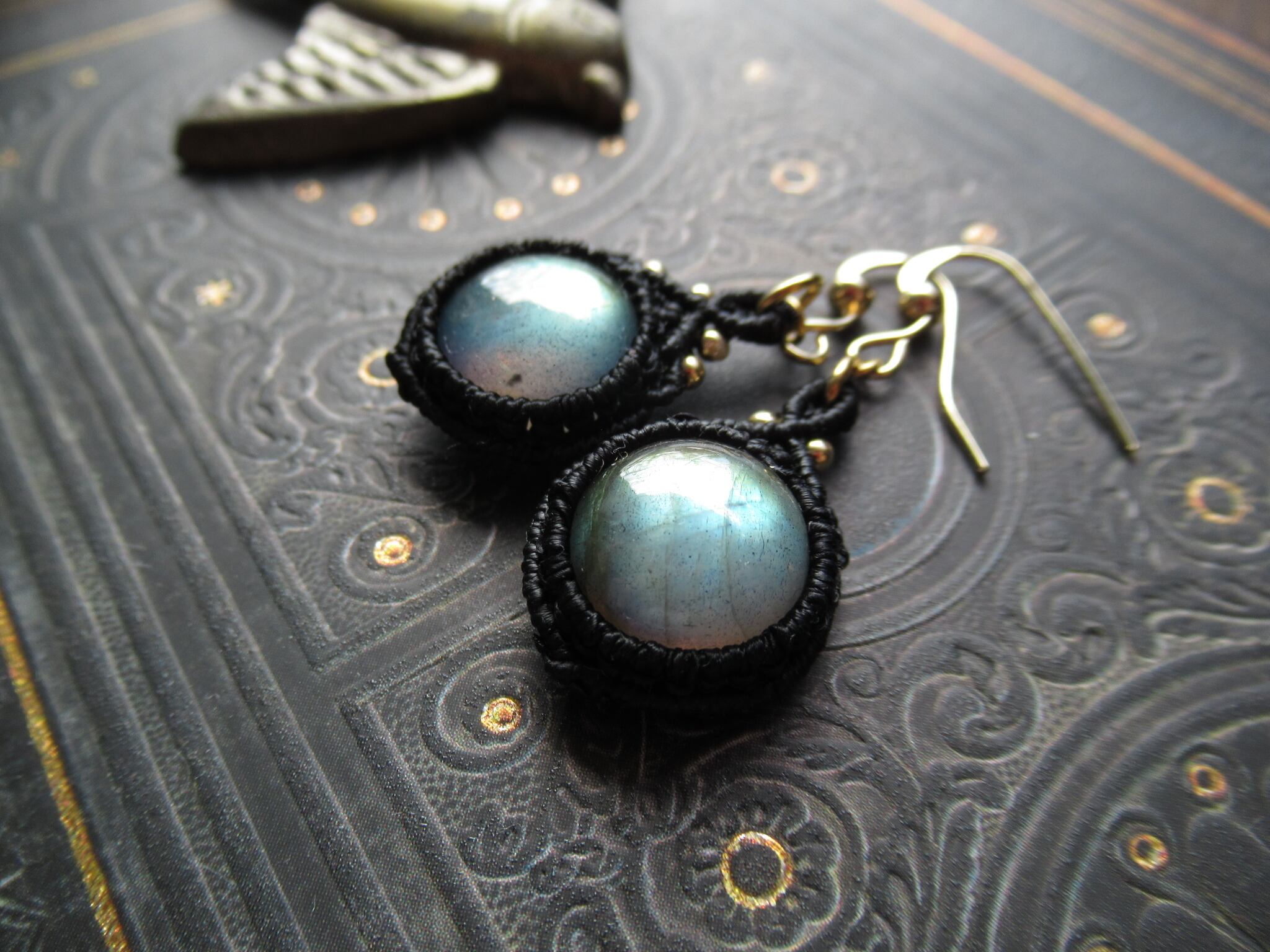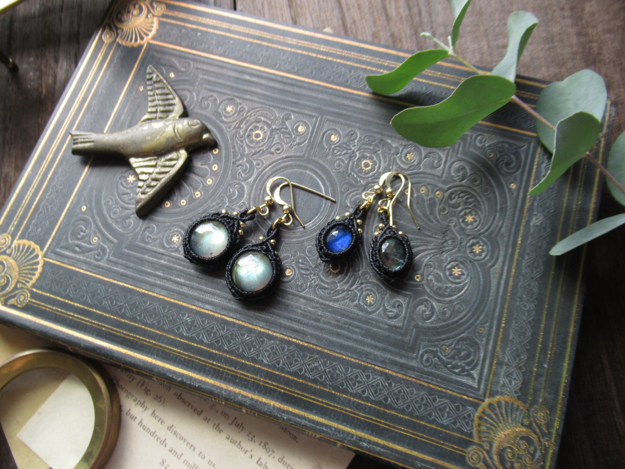 ころん、とまあるいラブラドライトで遠目からでもパッと印象的な耳飾りを製作いたしました。