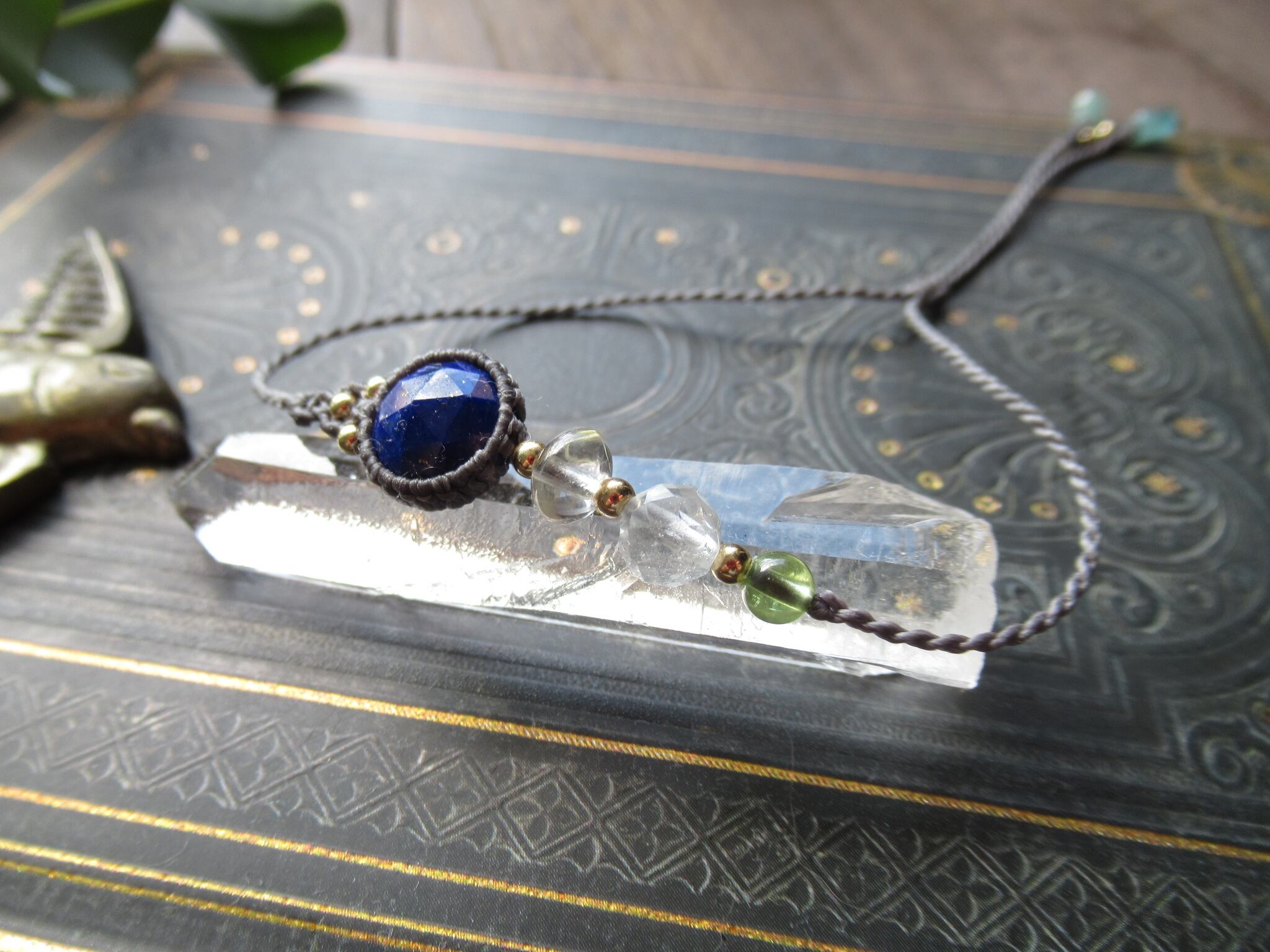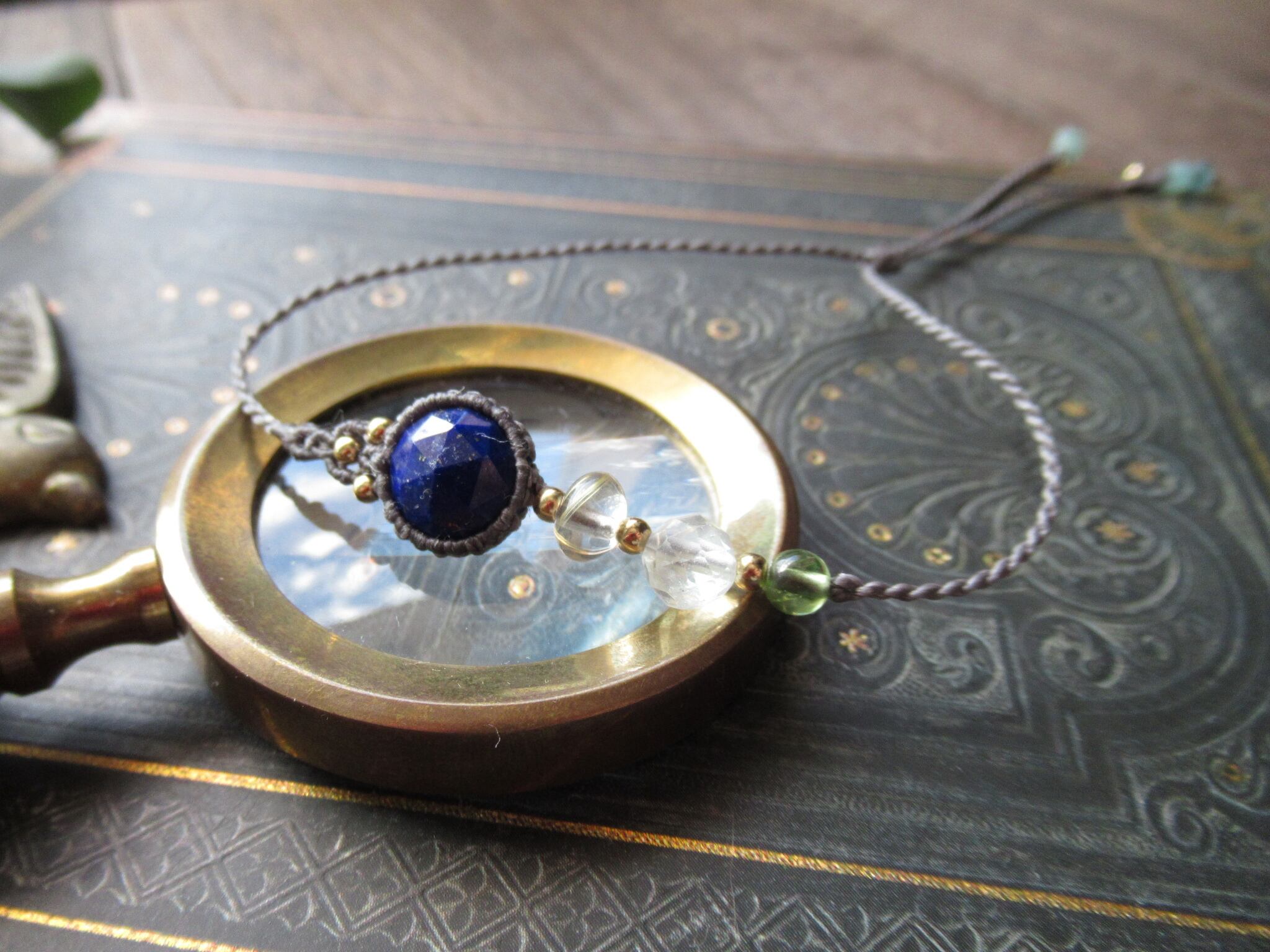 天然石ビーズにはブラジル産ルチルクォーツ、ホワイトトパーズ、ペリドットを編み込んでいます。結び石は宝石質のグランディディエライトです。