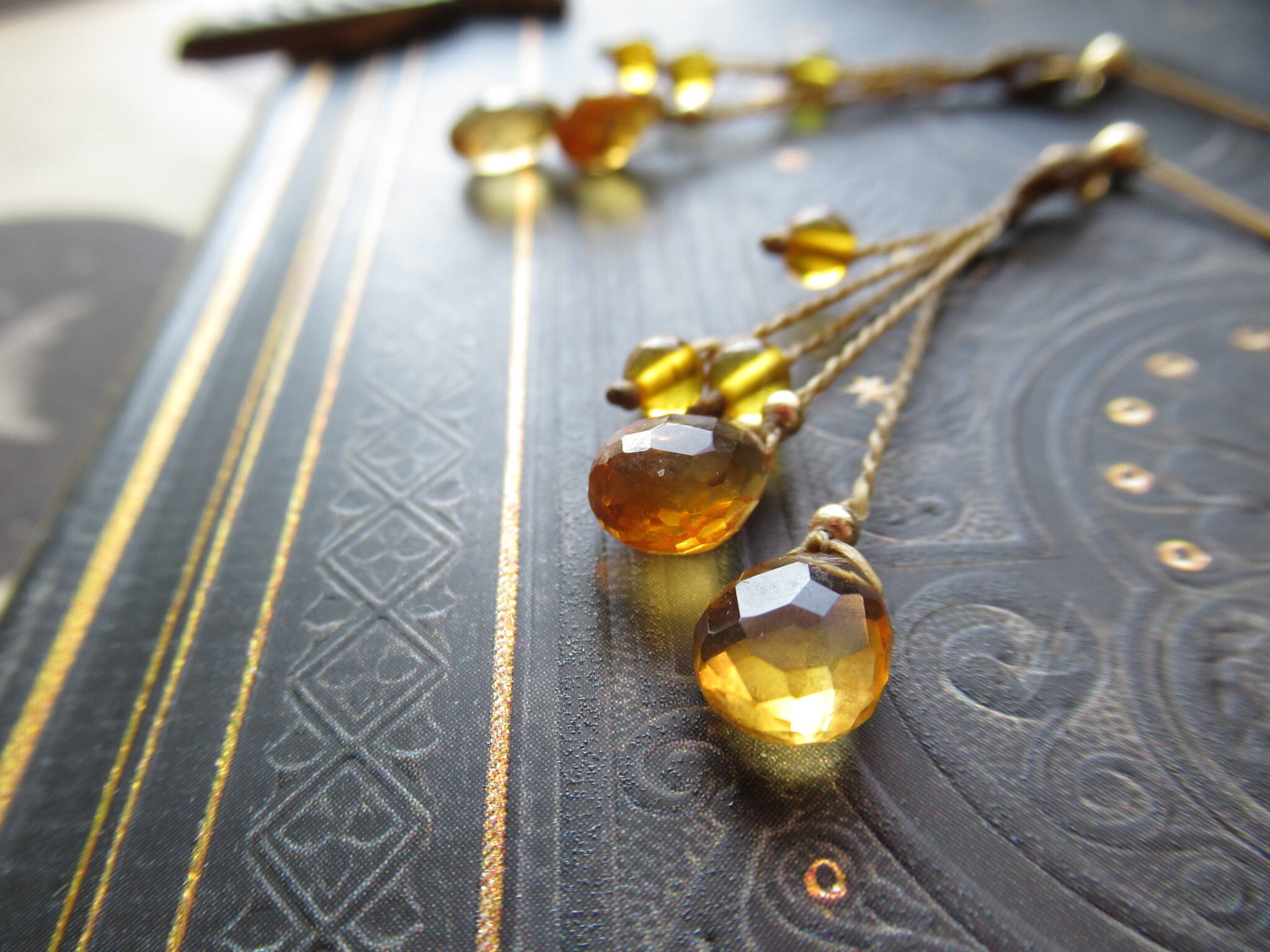 収穫したての黄金の麦や稲穂のようなイメージで雫型のシトリンを編み込み、ころんとしたバルティックアンバーのビーズと組み合わせています。
