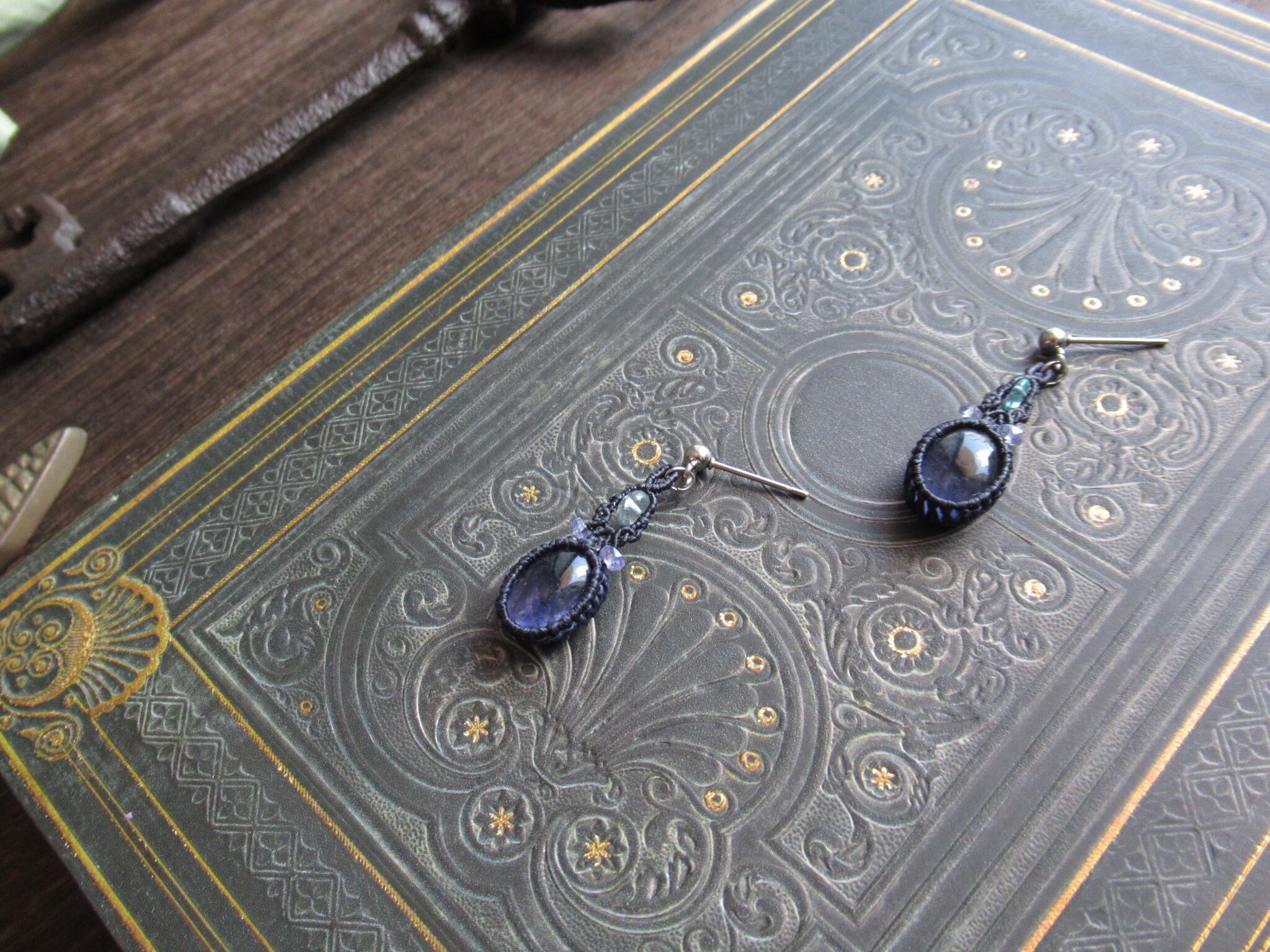 宵空色のアイオライトとアパタイト、タンザナイトで、耳元で印象的に揺れる耳飾りを製作しました。