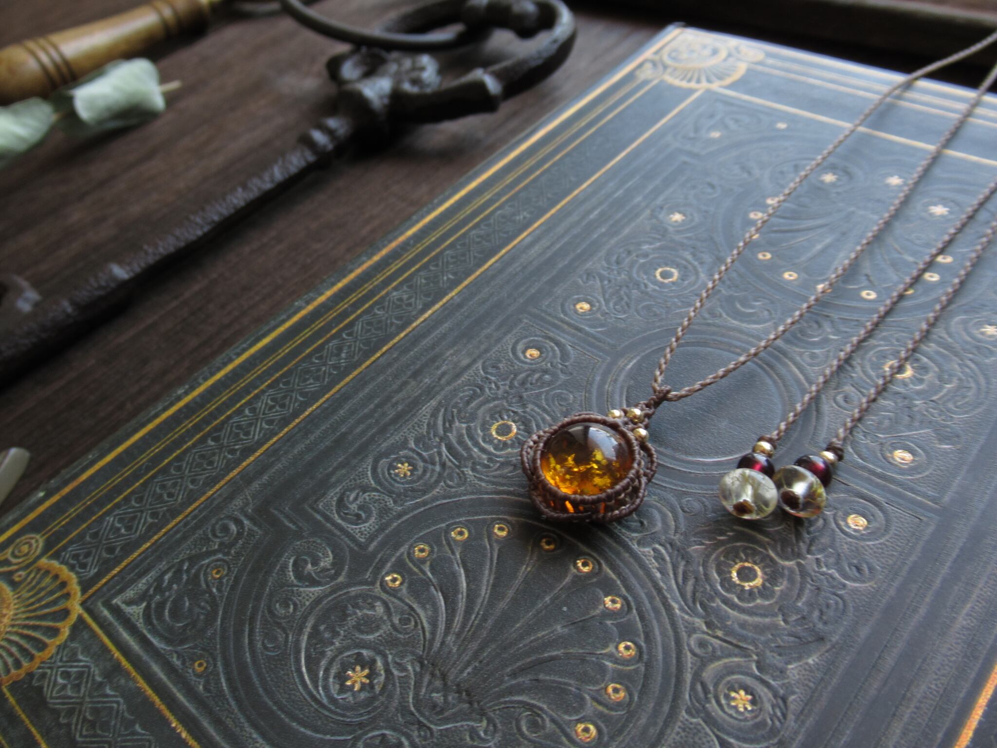 光を受けてキラキラと輝くバルティックアンバーで縁取りに編み込みを施したペンダントを製作いたしました。