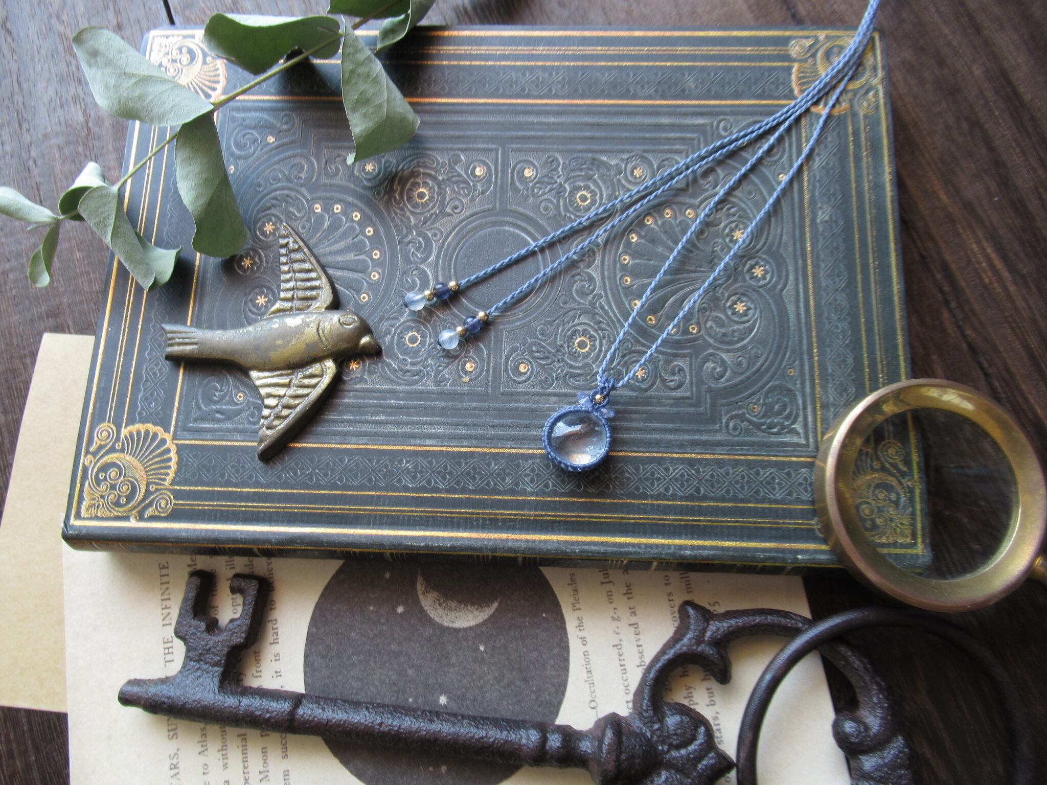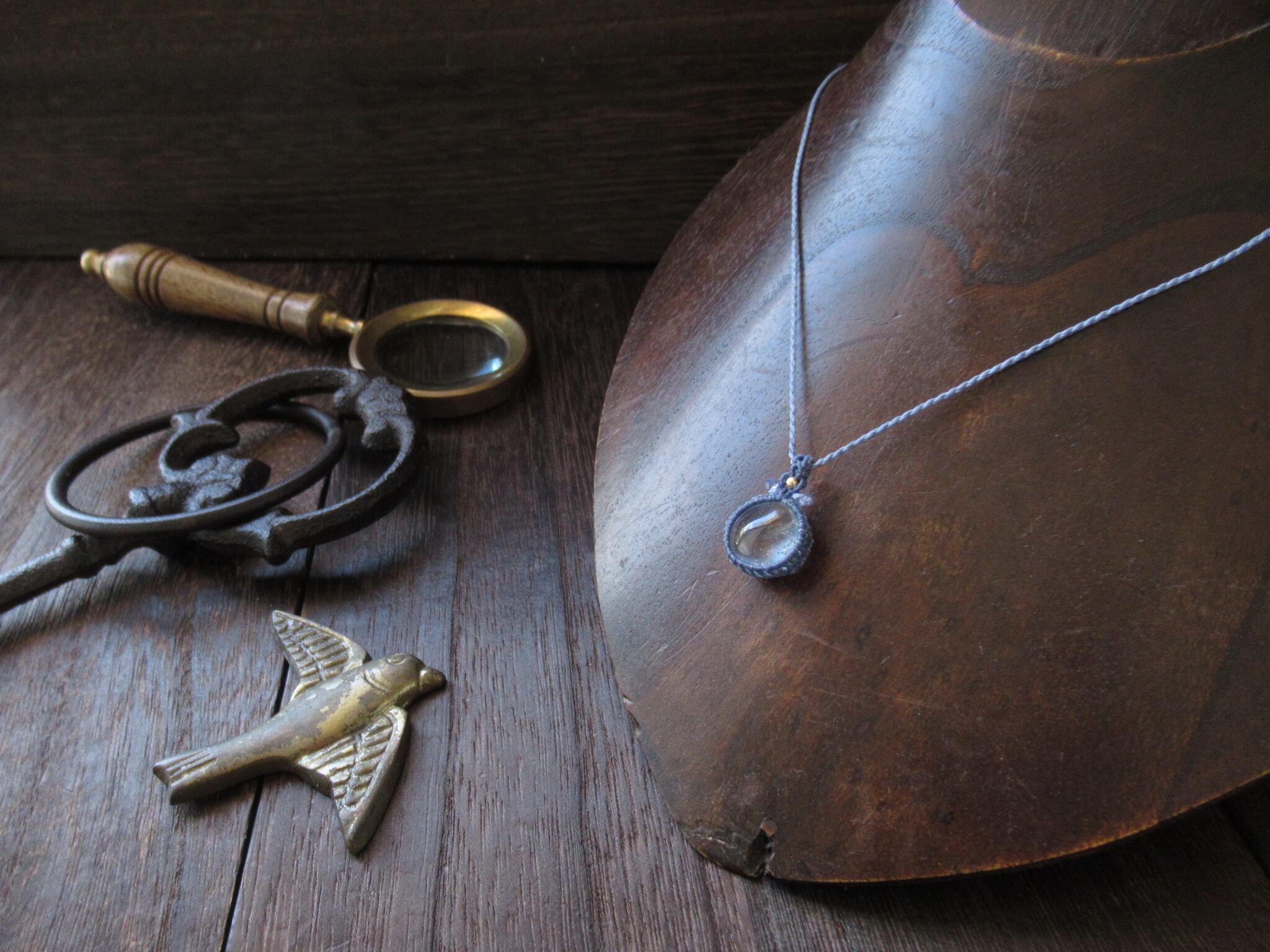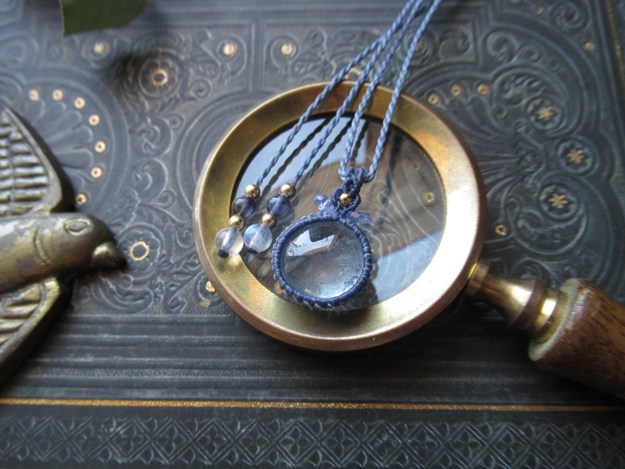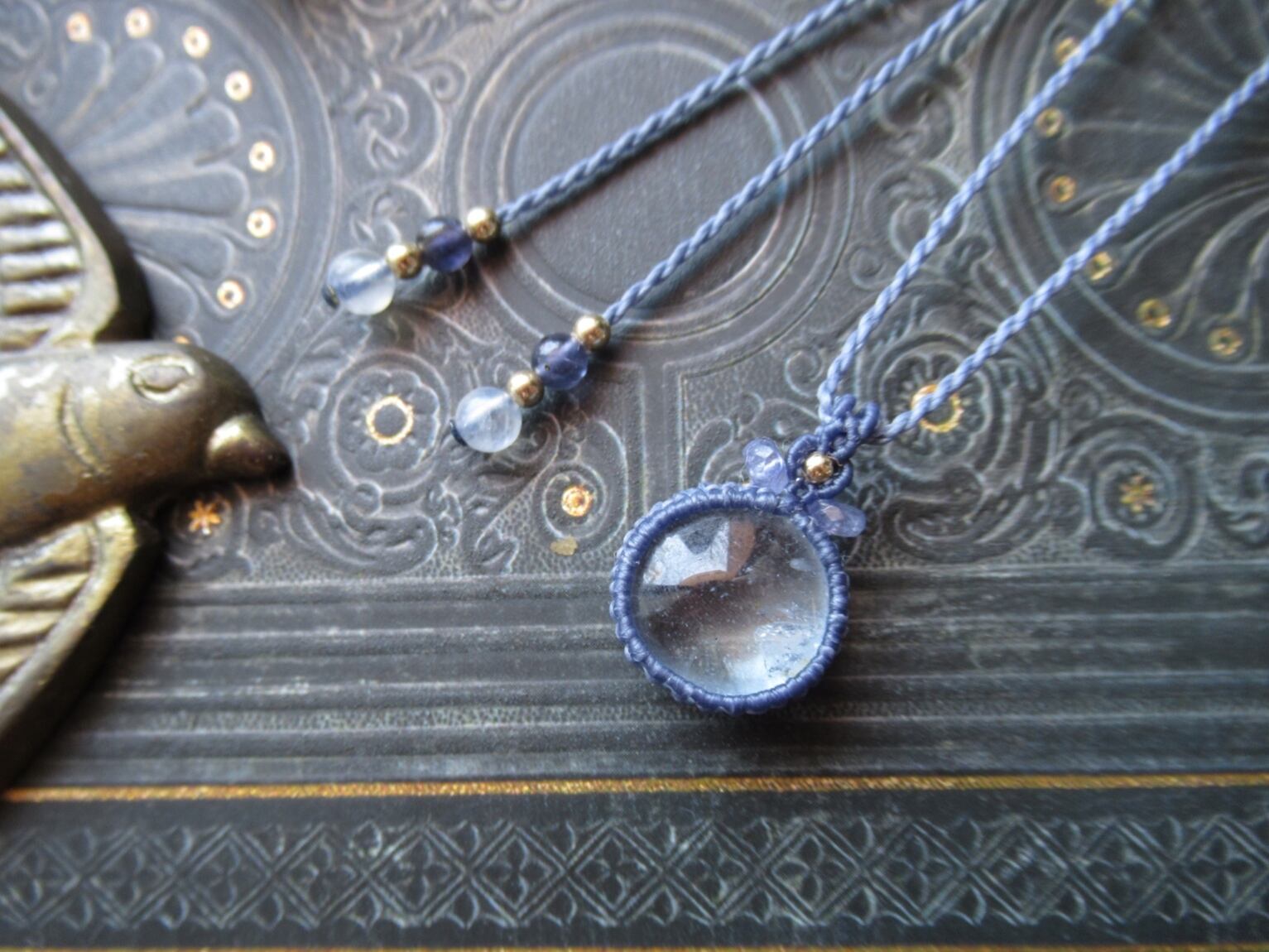 ペンダントトップには宝石質のタンザナイトの小さなビーズを編み込んでいます。