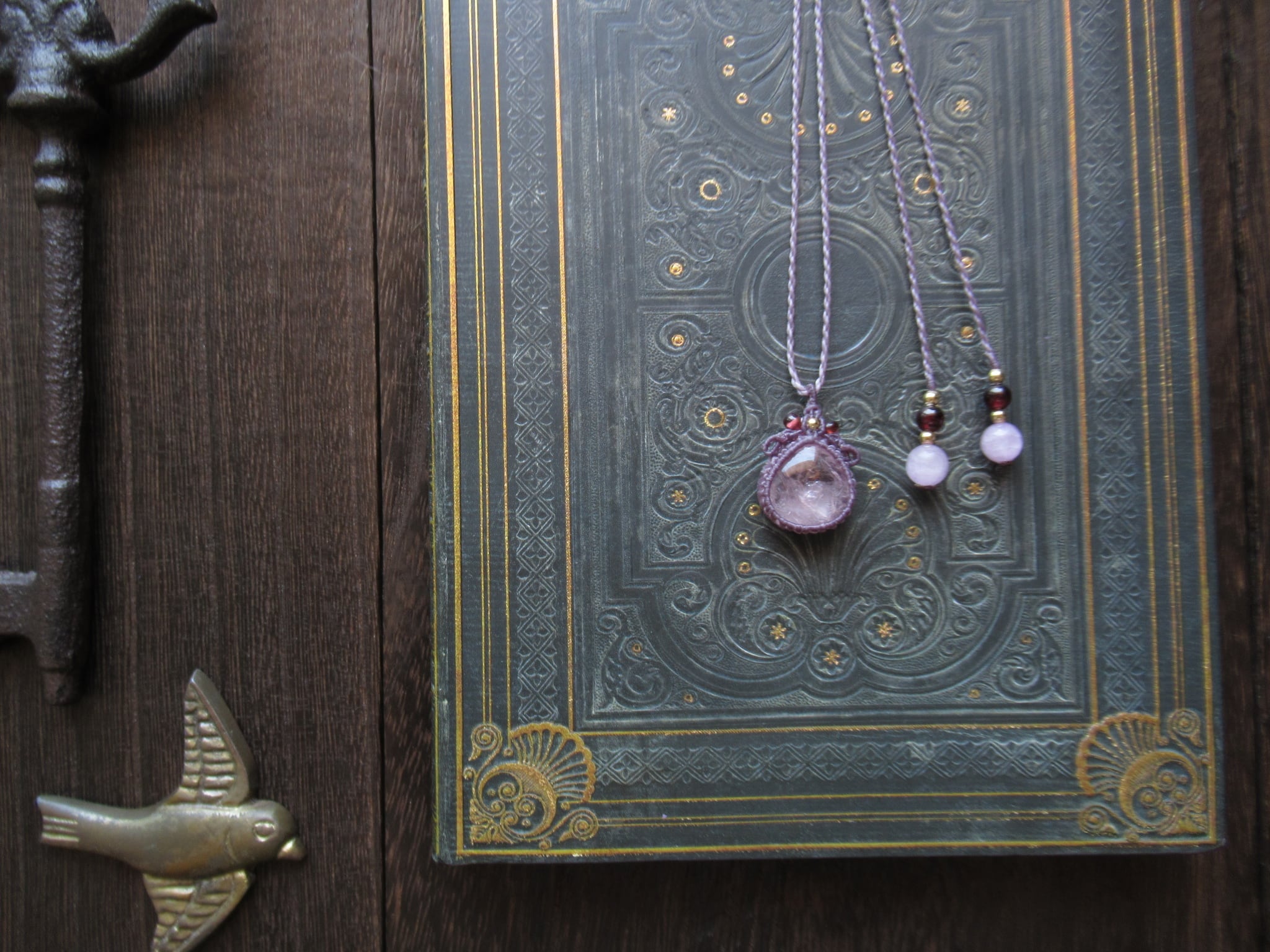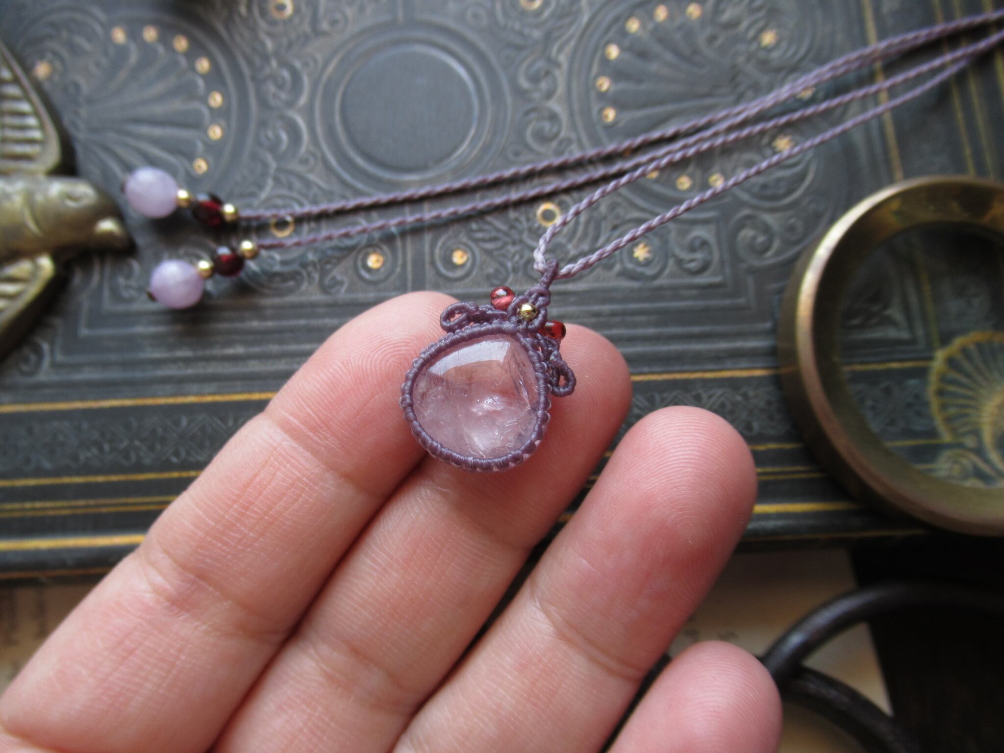 雫形の愛らしい上品なルースをモーヴパープルの落ち着いた紫色の糸で丁寧に編み込み、ペンダントに仕立てています。