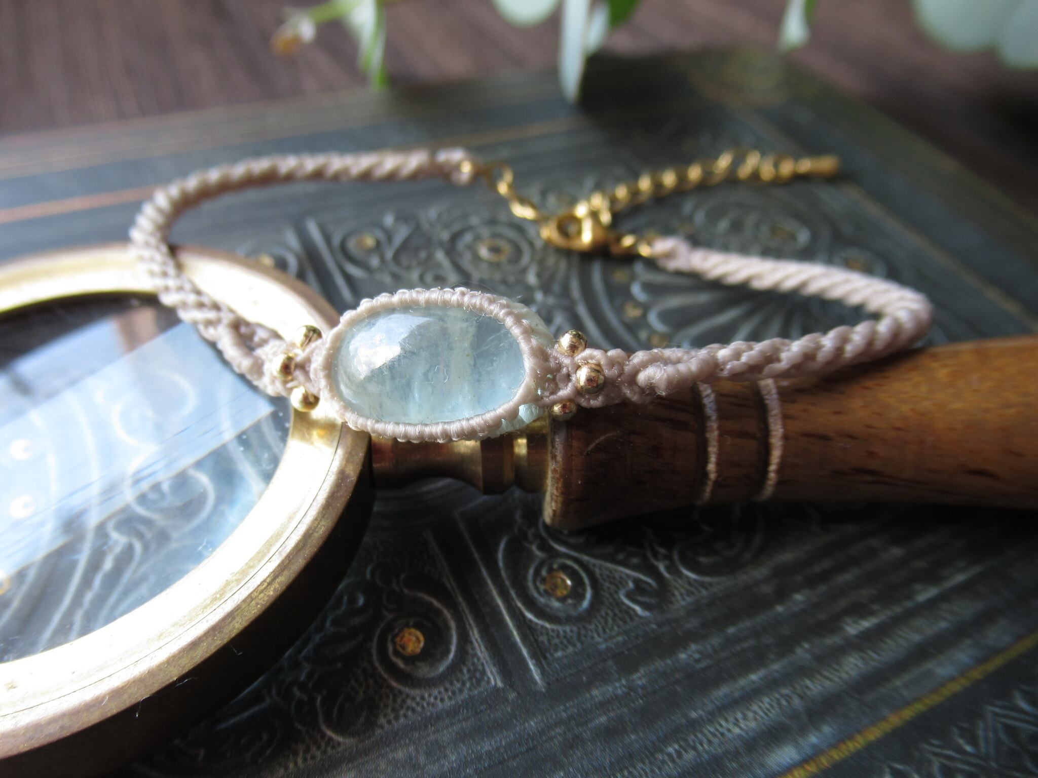 細長い四角形のルースを0.25mmの糸で丁寧にしっかりと編み込みました。左右は円筒形にすっきりと編み込み、チェーンと金具部分には医療用サージカルステンレスでチェーンブレスレットにお仕立てしています。