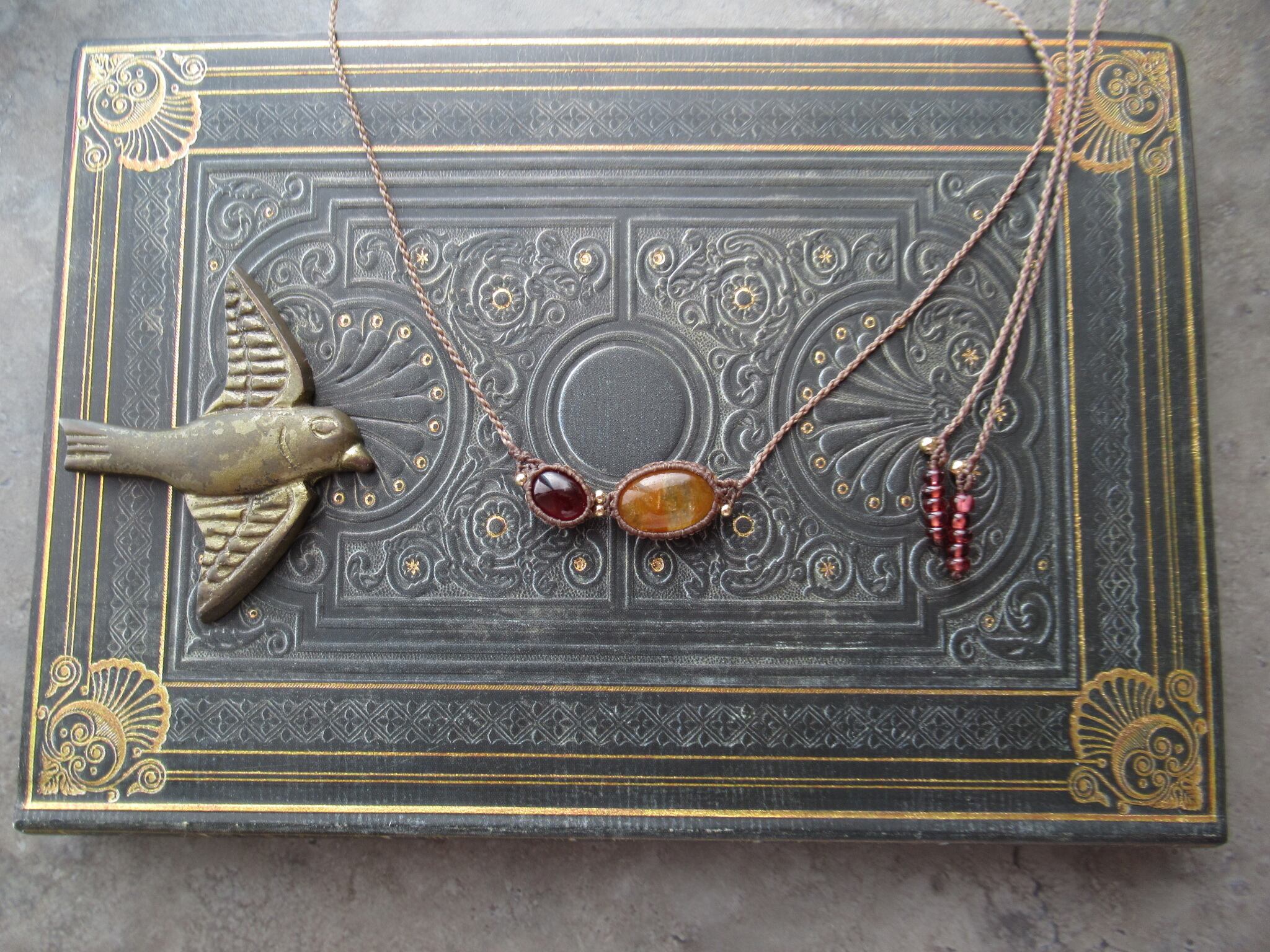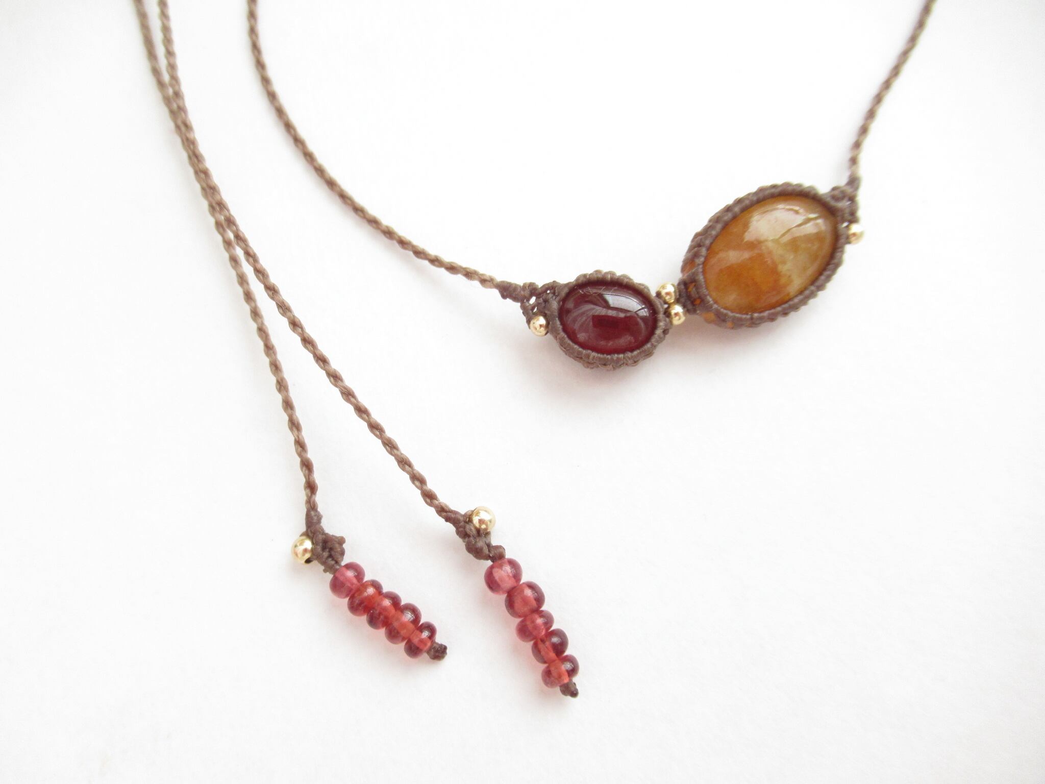 イエローオレンジベリル×ヘソナイトガーネットのマクラメフロントデザインネックレス / 0.25㎜仕上げ