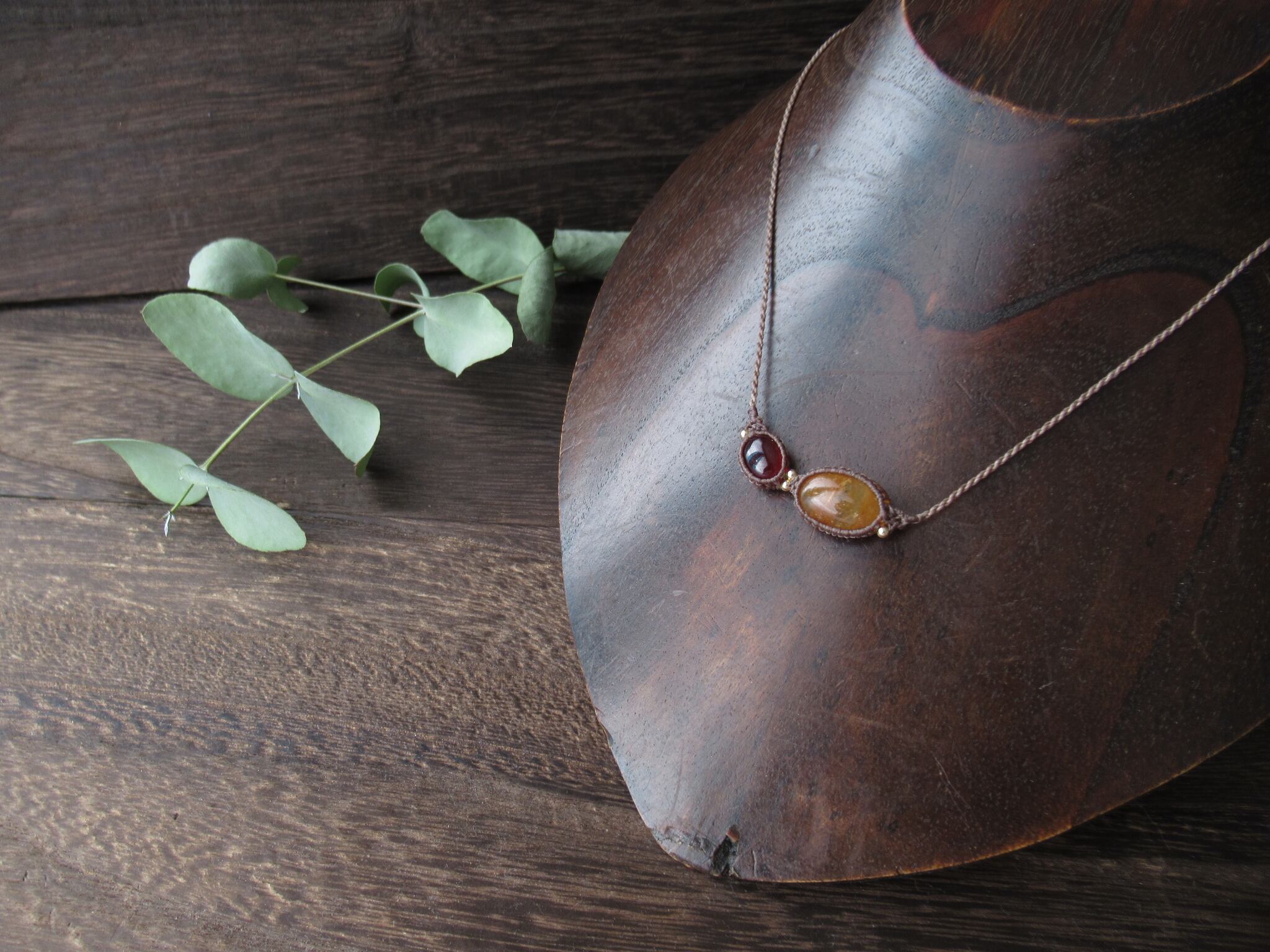 ふた粒の天然石を連結させ、デコルテで明るく目を引くシックなネックレスを製作致しました。コントラストにメリハリがあり、秋色のお洋服にマッチする温かみのあるデザインのネックレスです。