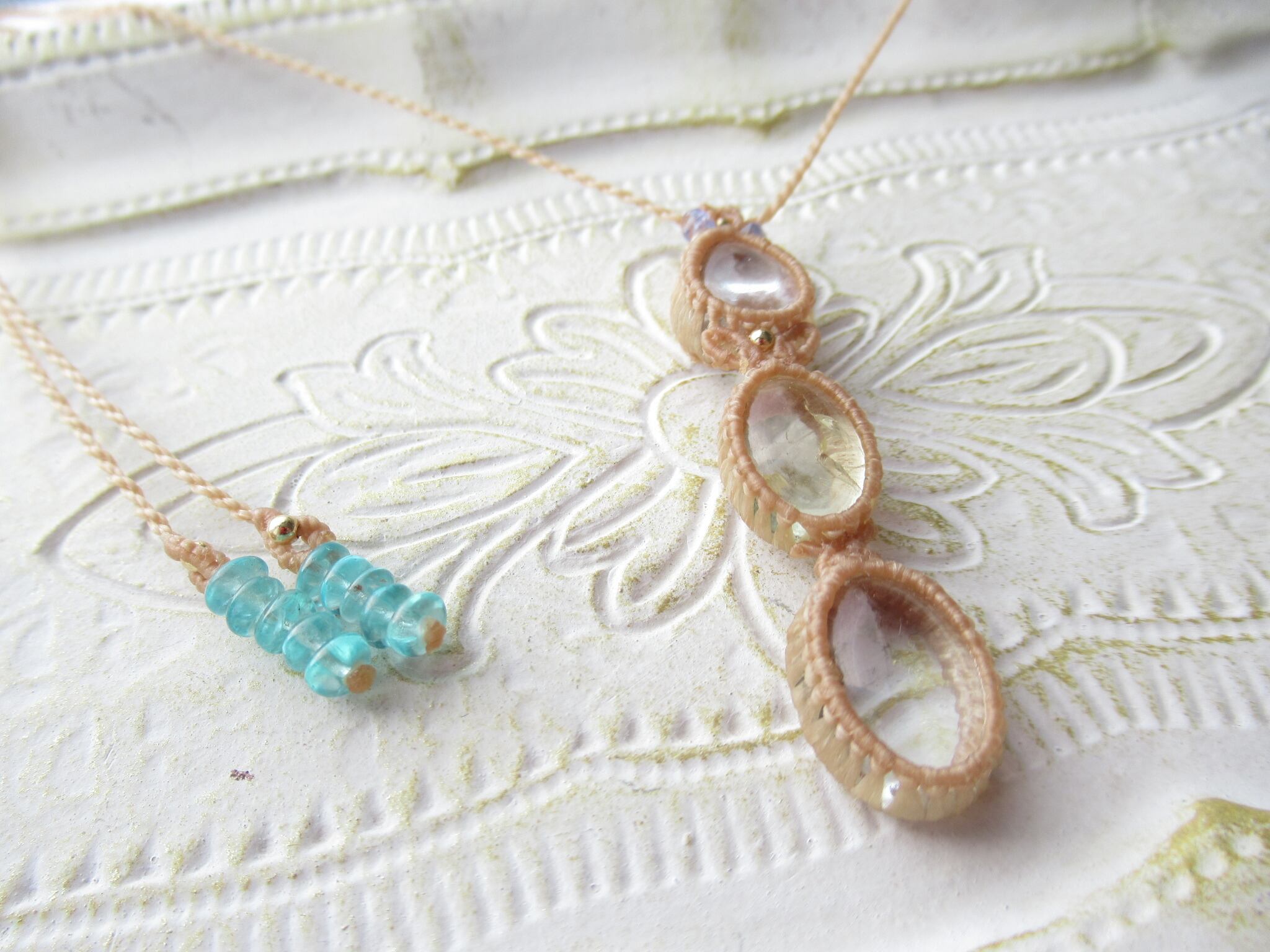 宝石質ナチュラルトパーズ×宝石質イエローベリルのマクラメペンダント / 0.25mm仕上げ