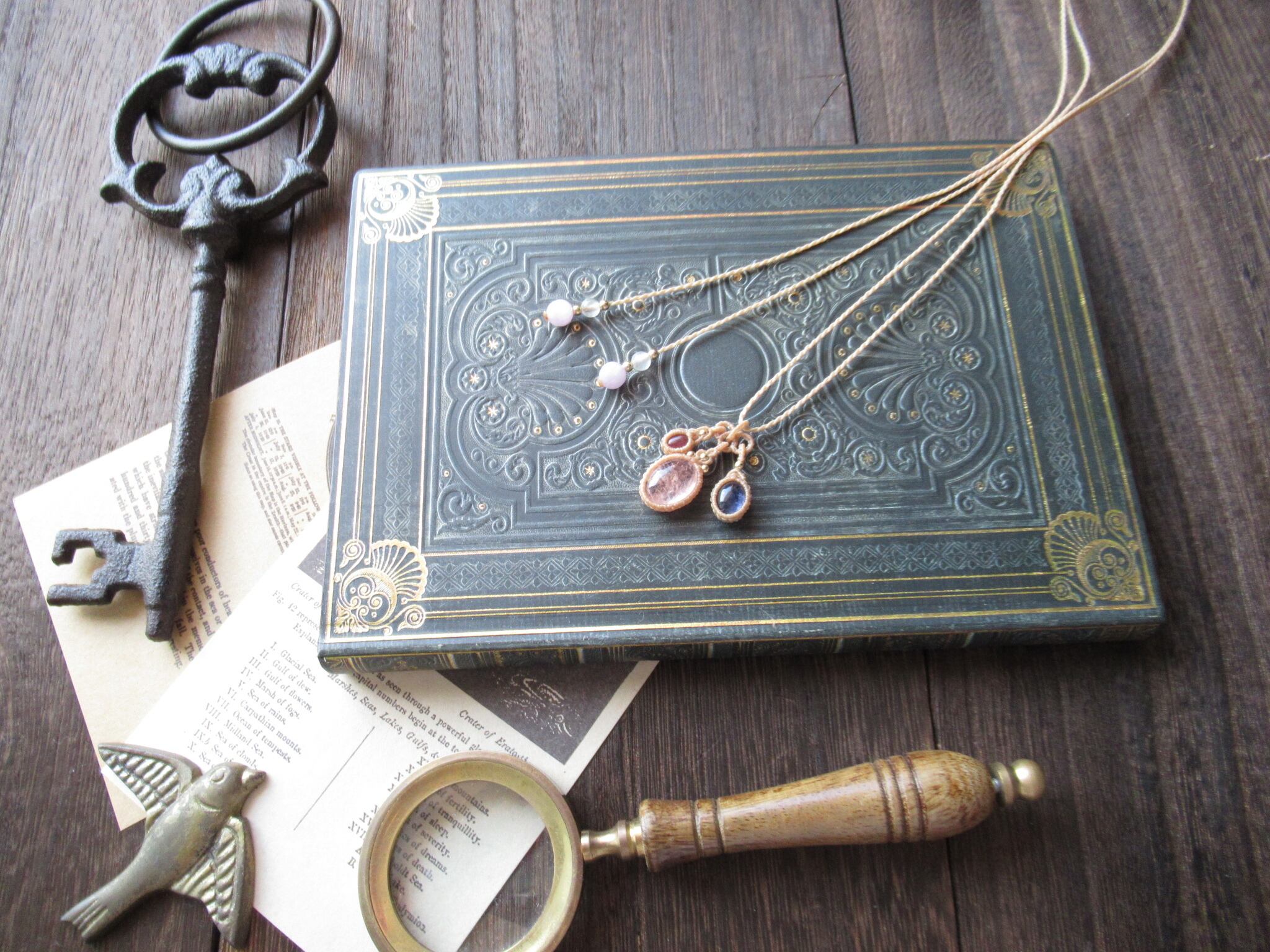 三輪のモチーフの中に、それぞれの天然石を丁寧に編み込んだフレームをそっと吊り下げて、シャンデリアのようなデザインに仕立てています。
