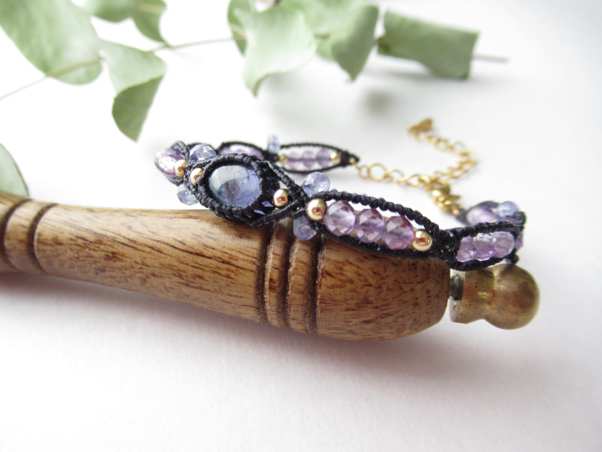 中央のアイオライトの両側に宝石質のタンザナイトのビーズを編み込み、手首に絡まる部分にピンクアメジストのビーズを丁寧に組み合わせました。立体的なデザインになっている他、光を受けるとデザインカットされているビーズの部分がキラキラと輝き、上品で華やかな印象です。