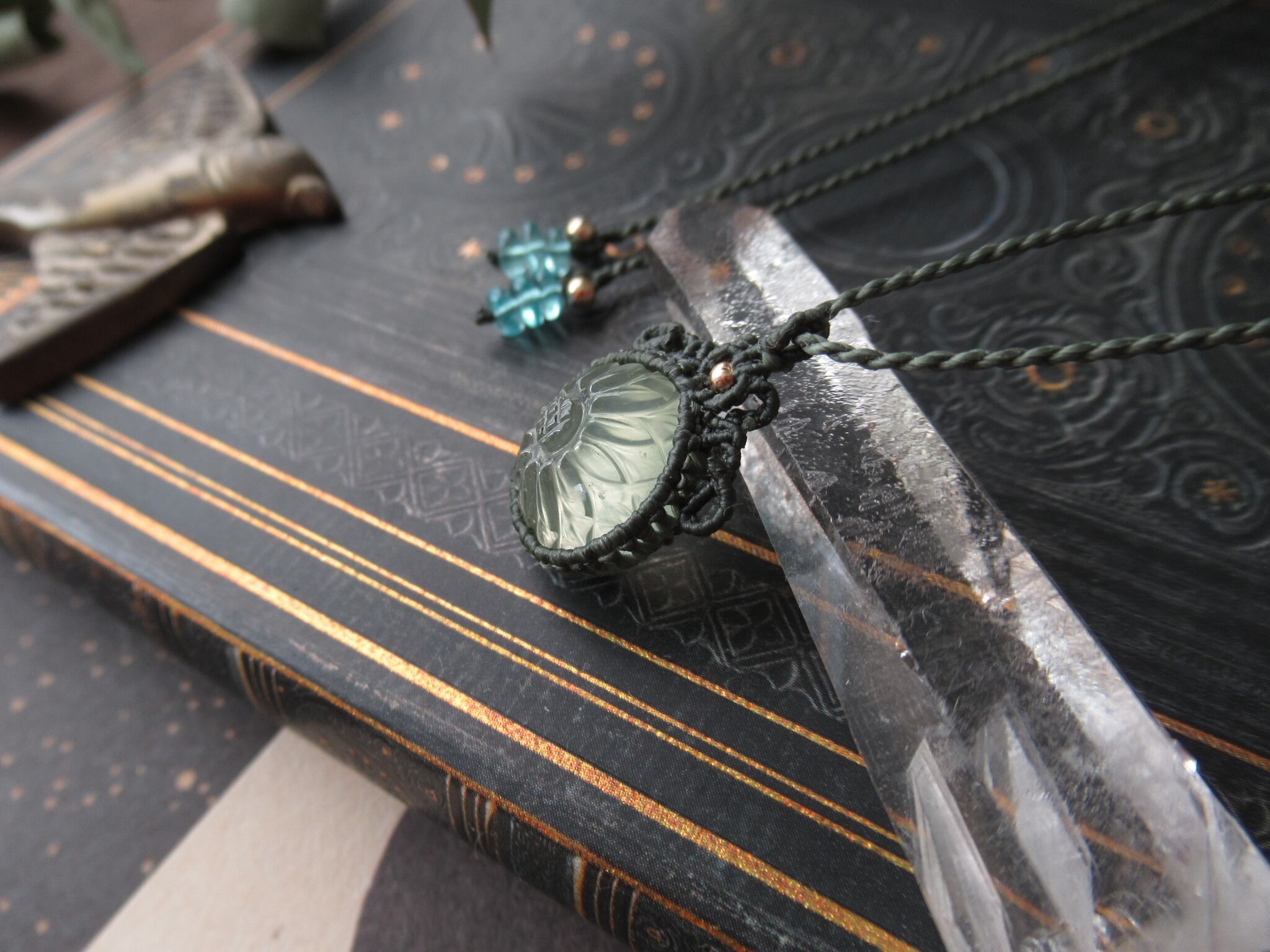 糸色はグリーンカーキで、マクラメらしい編み込みをトップにあしらっています。濁りや内包クラックのない美しいプレナイトで、裏側をみるとややインクルージョンが見られます。優しいグリーンの愛らしいお花を胸元でお楽しみいただけましたら嬉しいです。