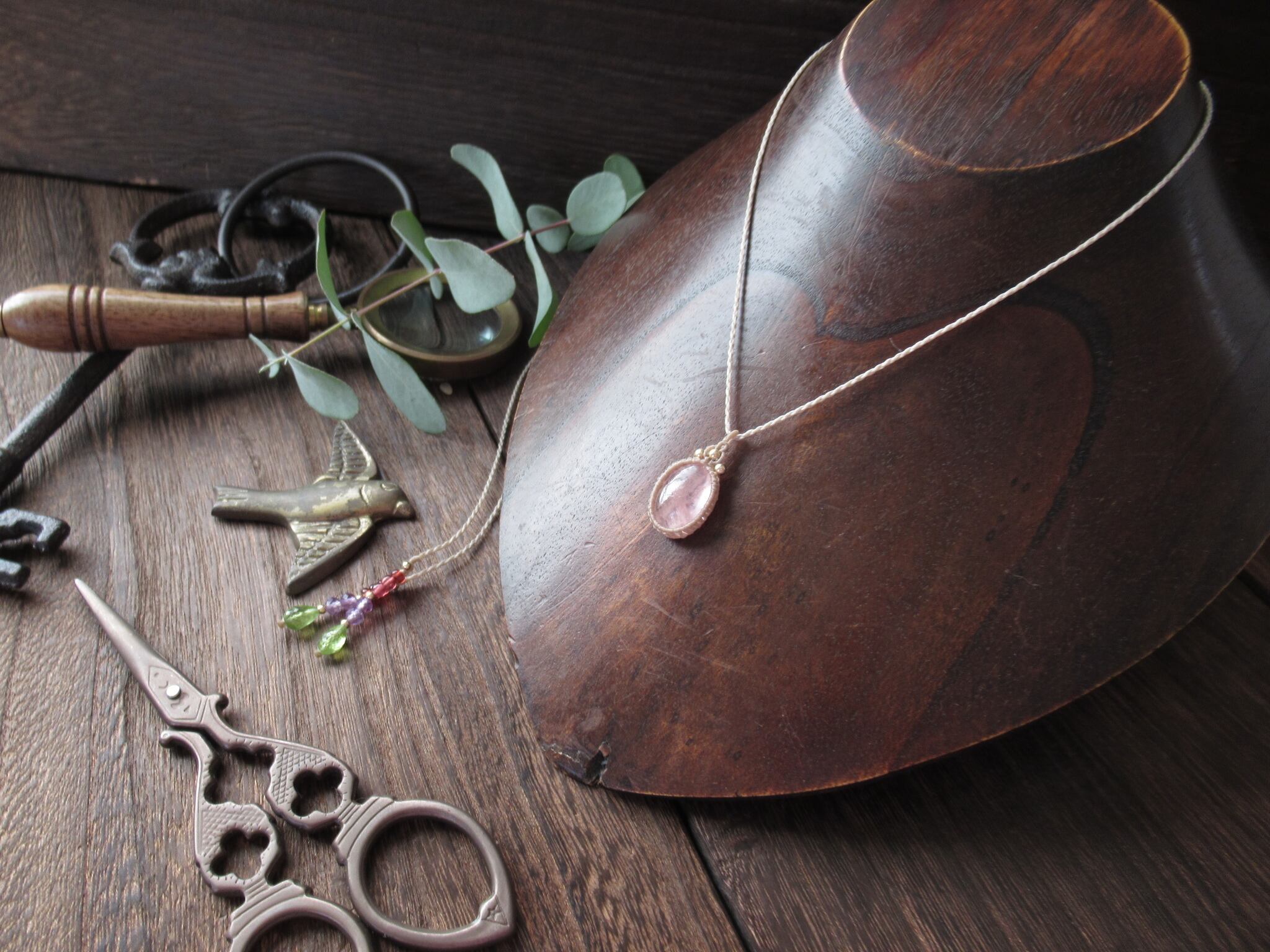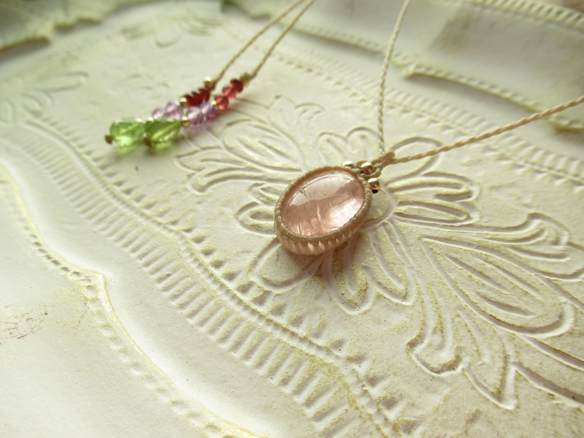 今回はペンダントトップがシンプルなので、結び紐に少し彩を加えました。軽量さを大切にしつつ、彩りも楽しんでいただけるように、粒感が美しくハイクオリティの天然石をセレクトしています。上から、モザンビーク産ガーネット、ピンクアメジスト、宝石質ペリドットです。