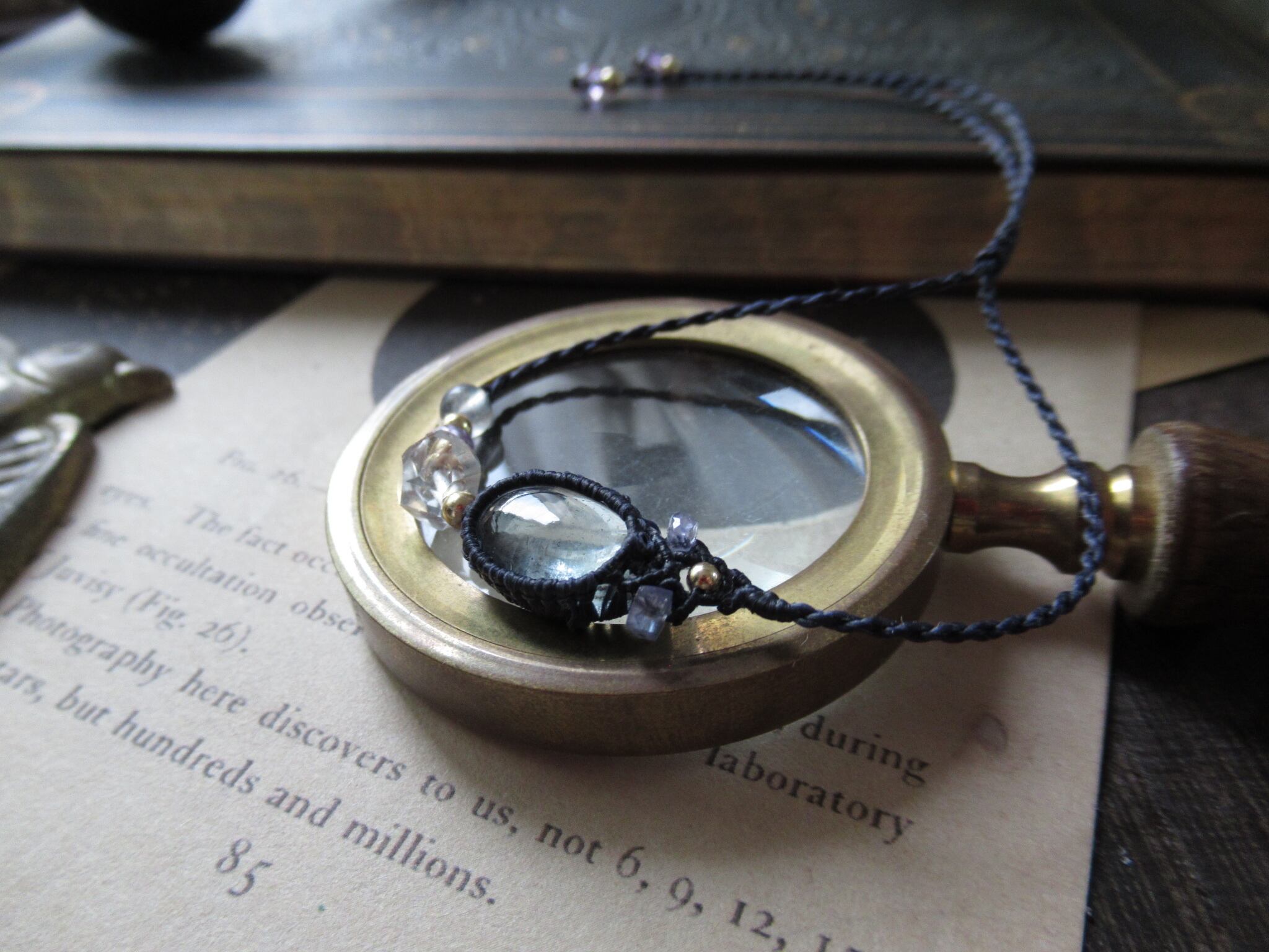 ごくごく淡く、透明に近い色合いのアクアマリンに、編み込みの部分にタンザナイトを編み込み、ダークネイビーの糸で丁寧に編み上げました。
