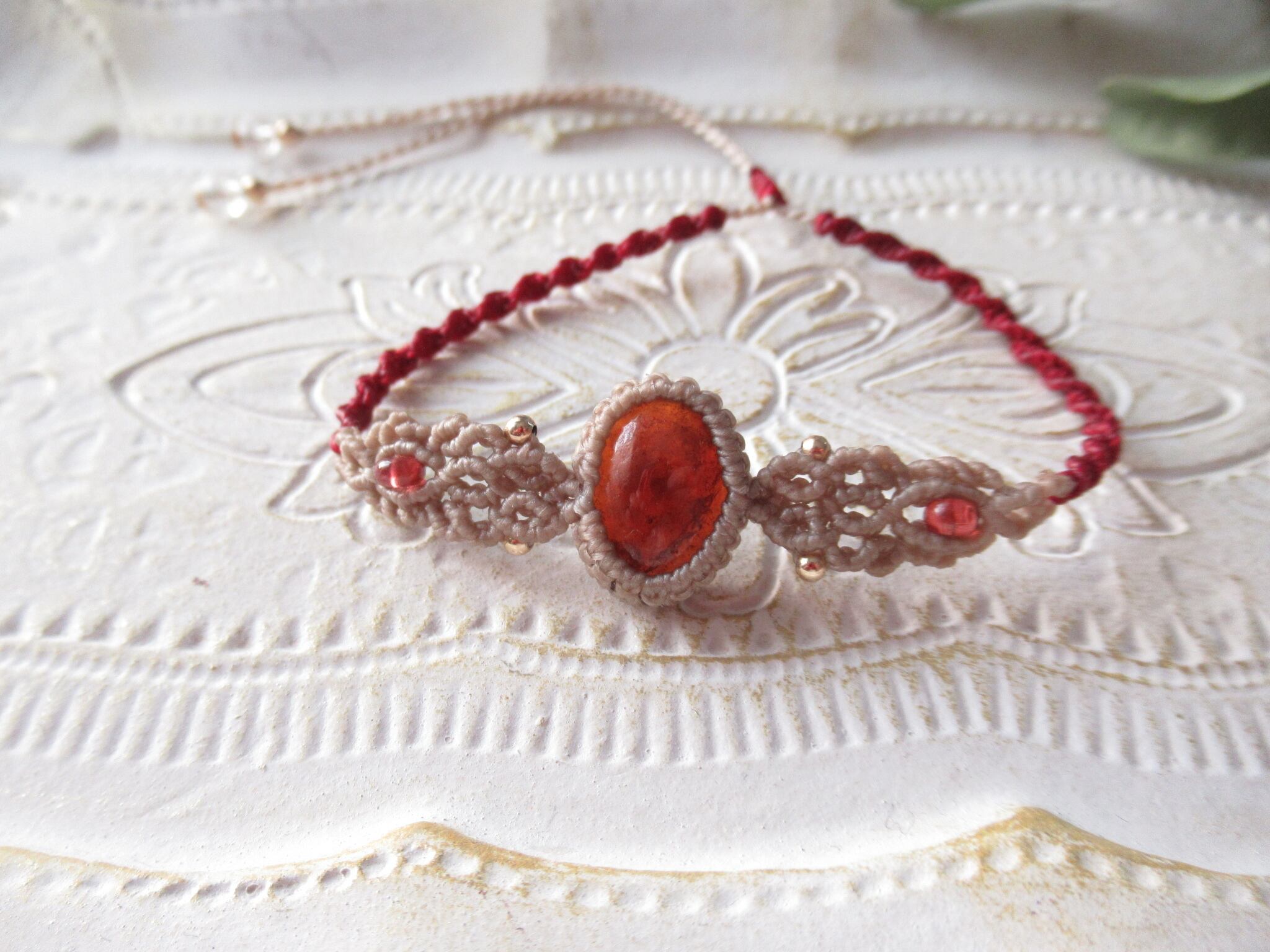 光に透かすとオレンジみを帯びるヘソナイトガーネットをマクラメブレスレットにお仕立ていたしました。左右対称のシンメトリーデザインです。