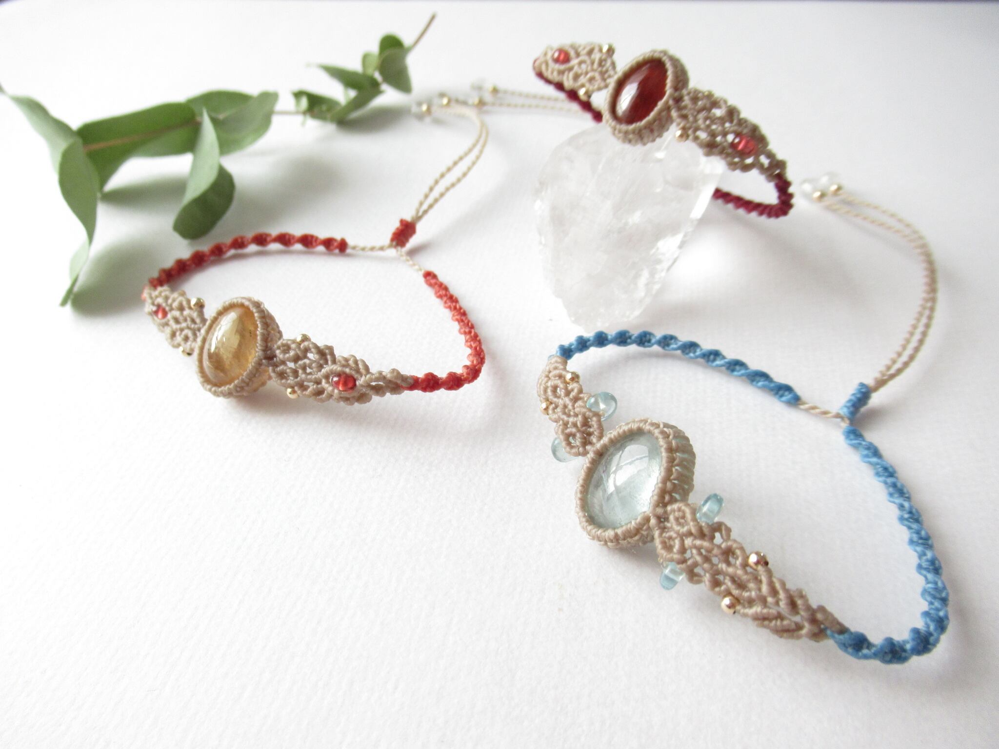 編み込みにはモザンビーク産ガーネットと14kgfビーズを編み込み、遠目からでも印象的に仕上げました。ブレスレットには濃い目の差し色でメリハリを加えているので、ボリュームはありますが濃い色のアクセントカラーの糸色がきゅっと手首を彩り、ほっそりと見える視覚効果を利用しています。