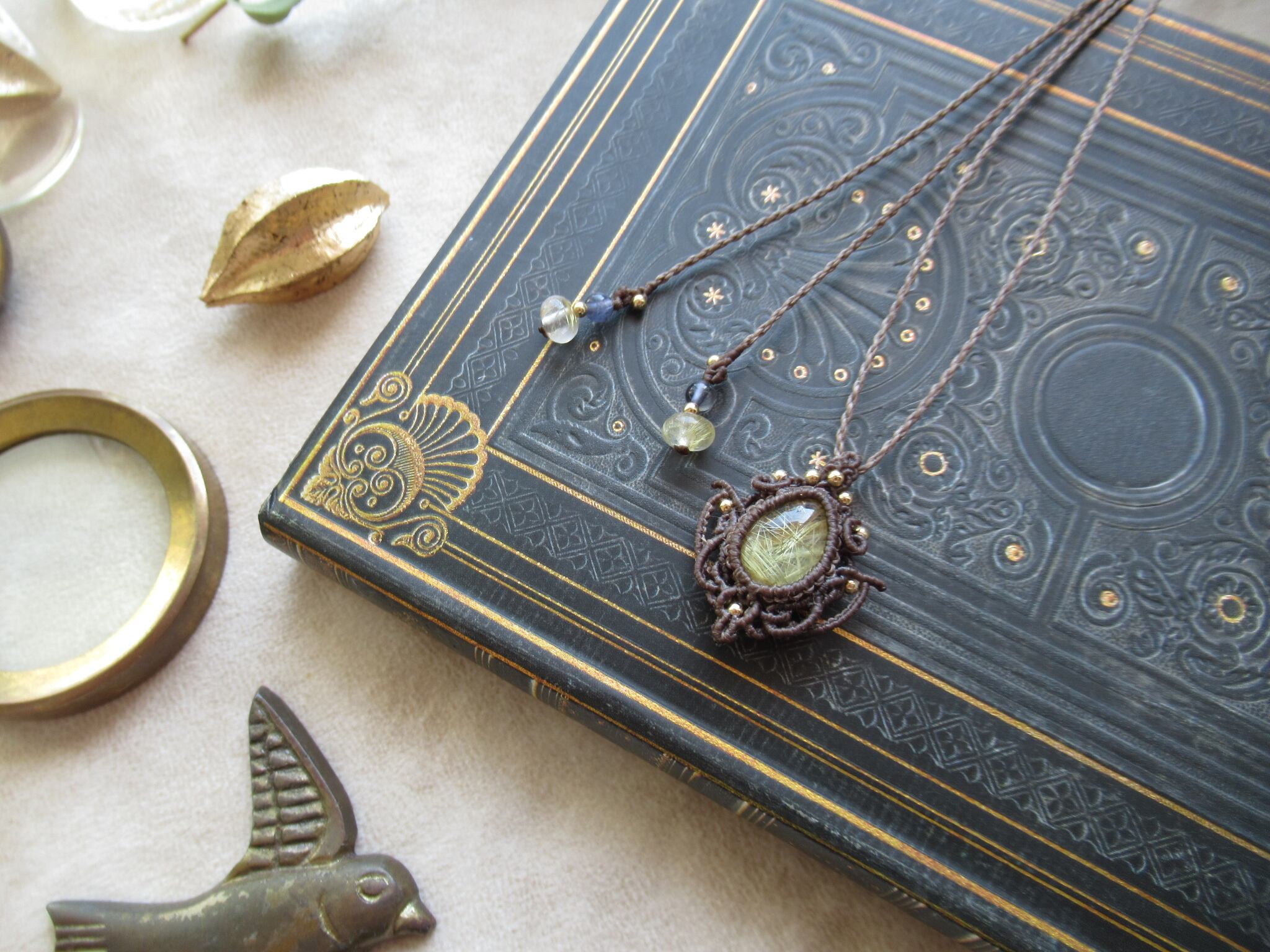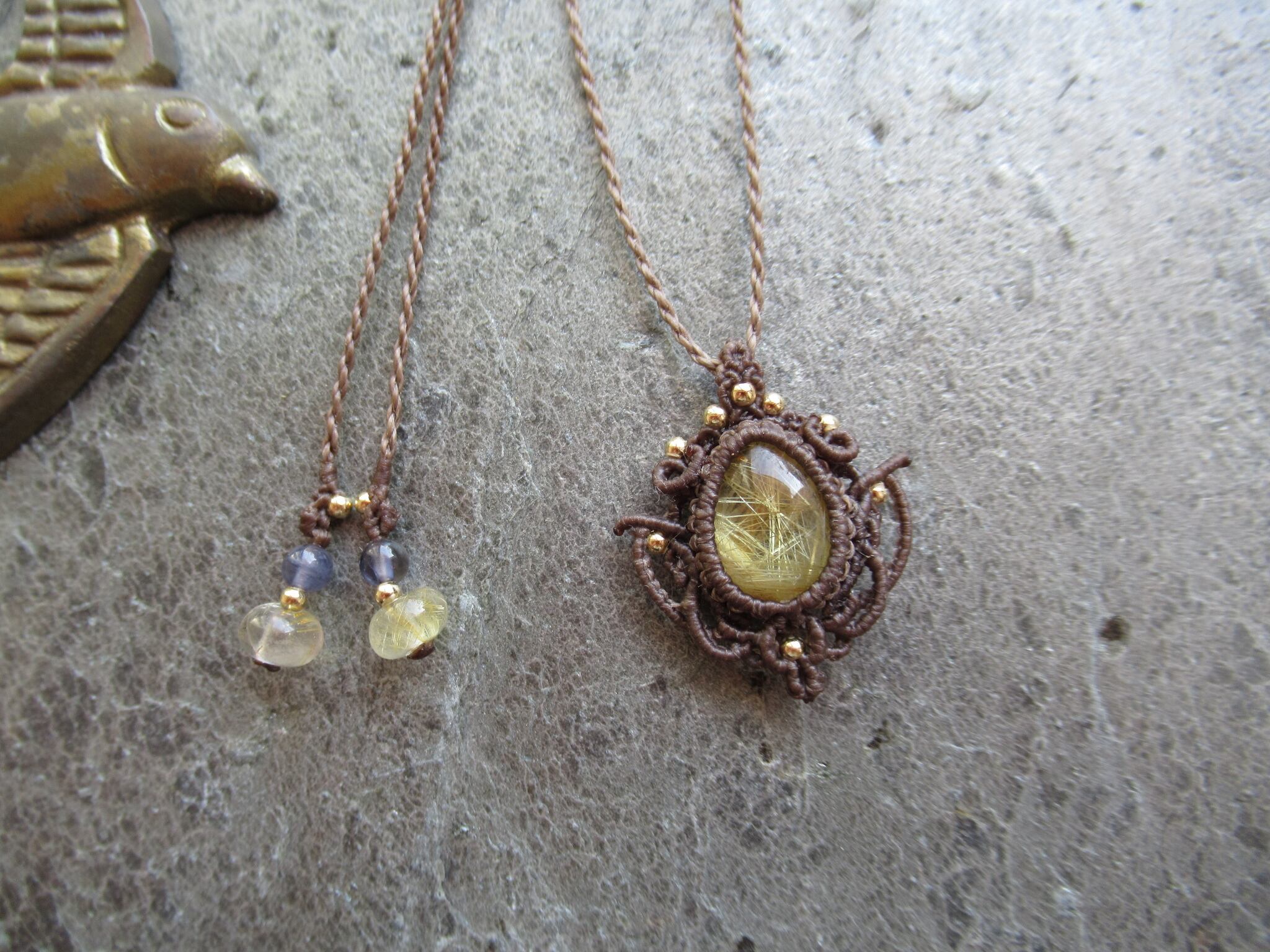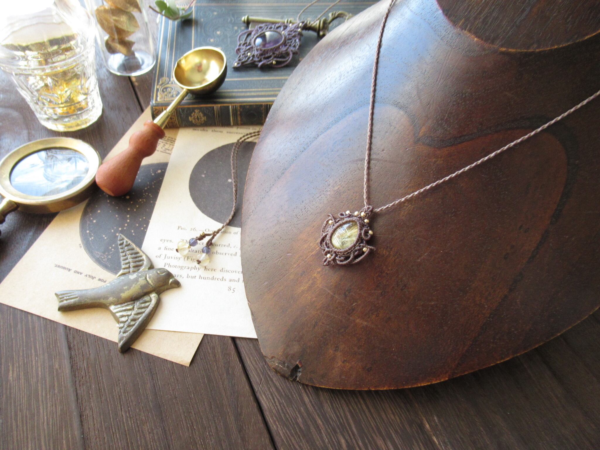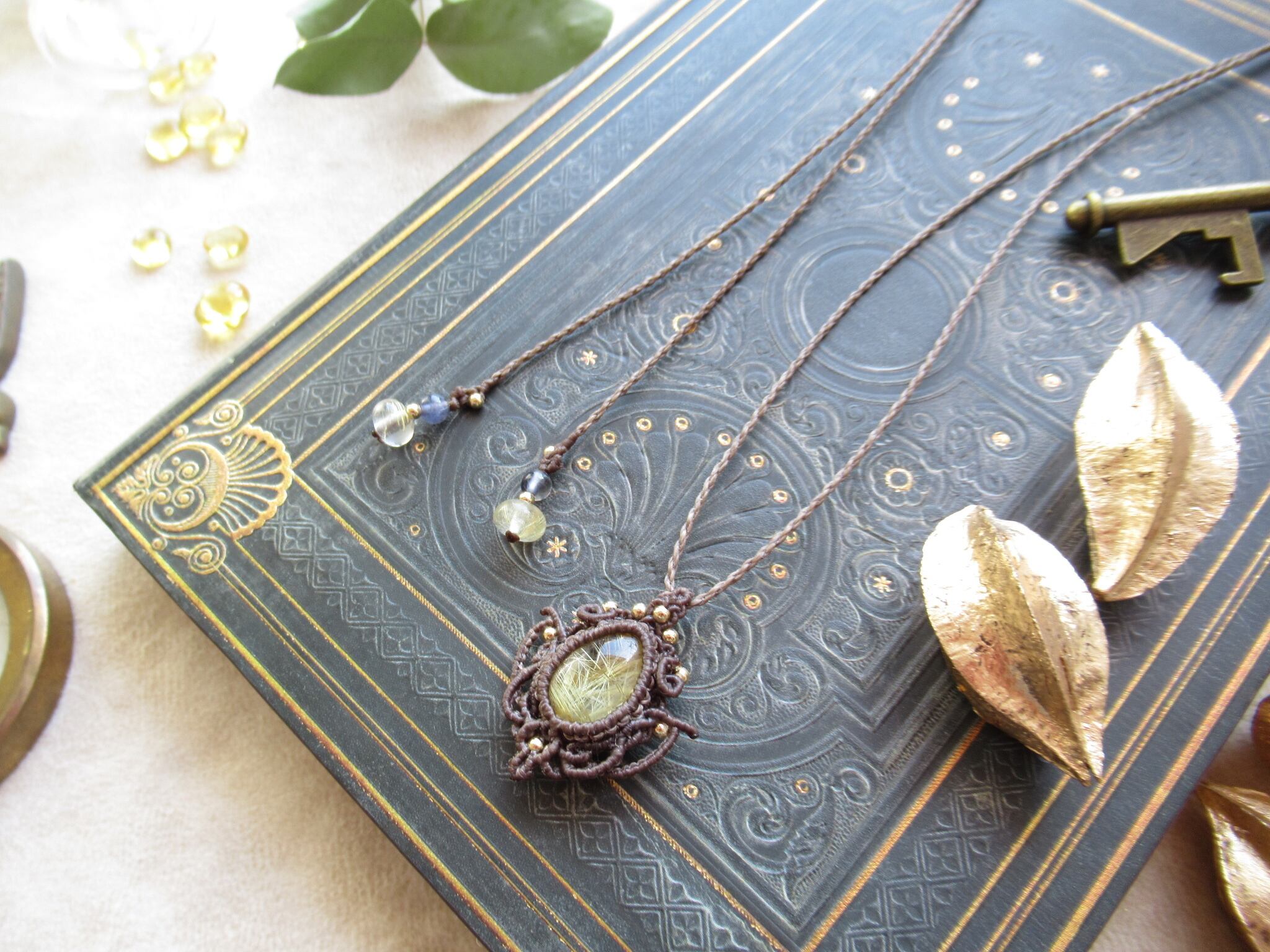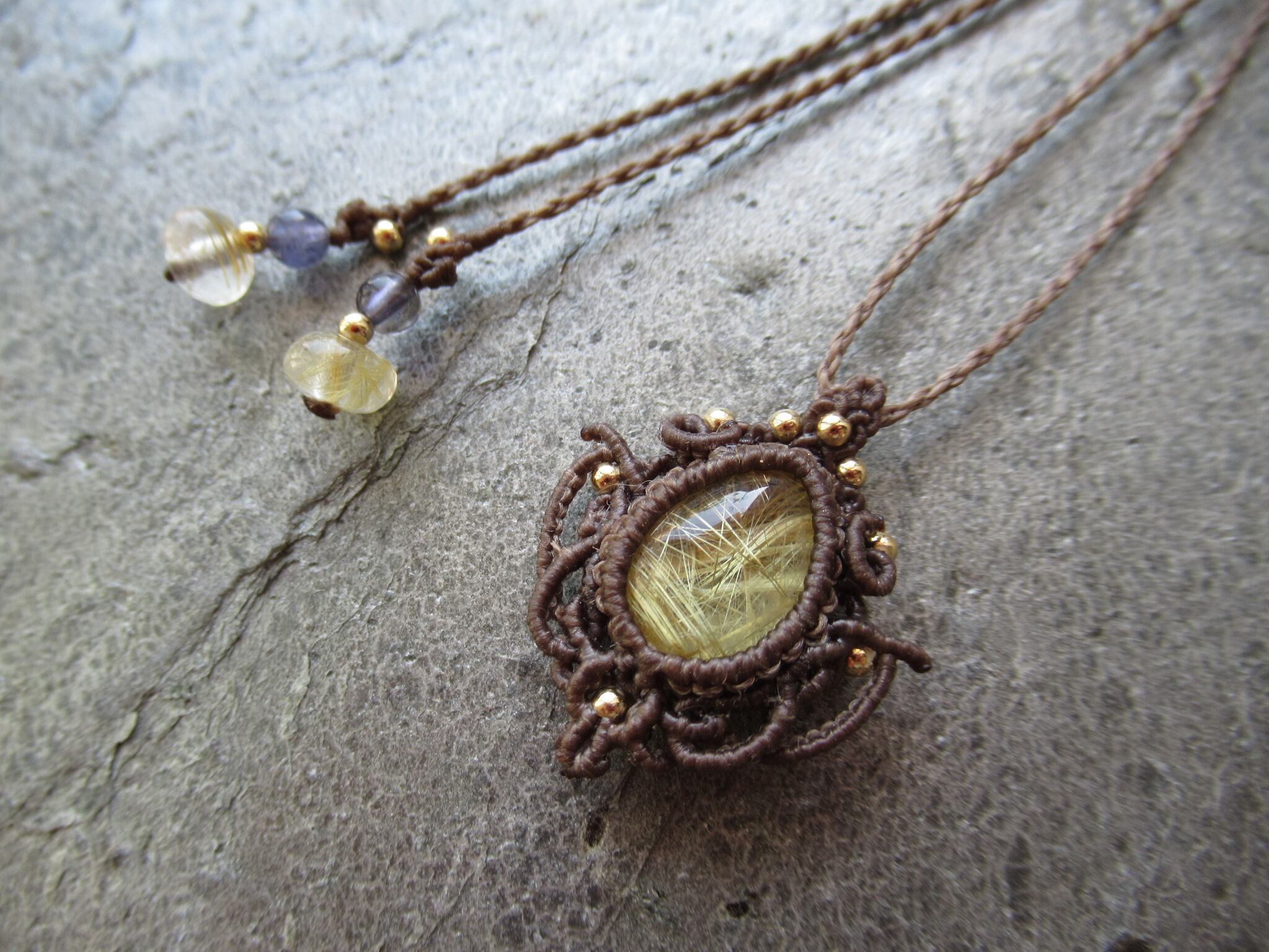 マクラメらしい流線形の編み込みが特徴的で、で立体的に見えるように糸の太さや技法を変えながら丁寧に編み込んでおります。ルチルクォーツの色合いが引き立つように糸を選び、日常使いしてもコーディネートに合わせやすいようにお仕立てしています。