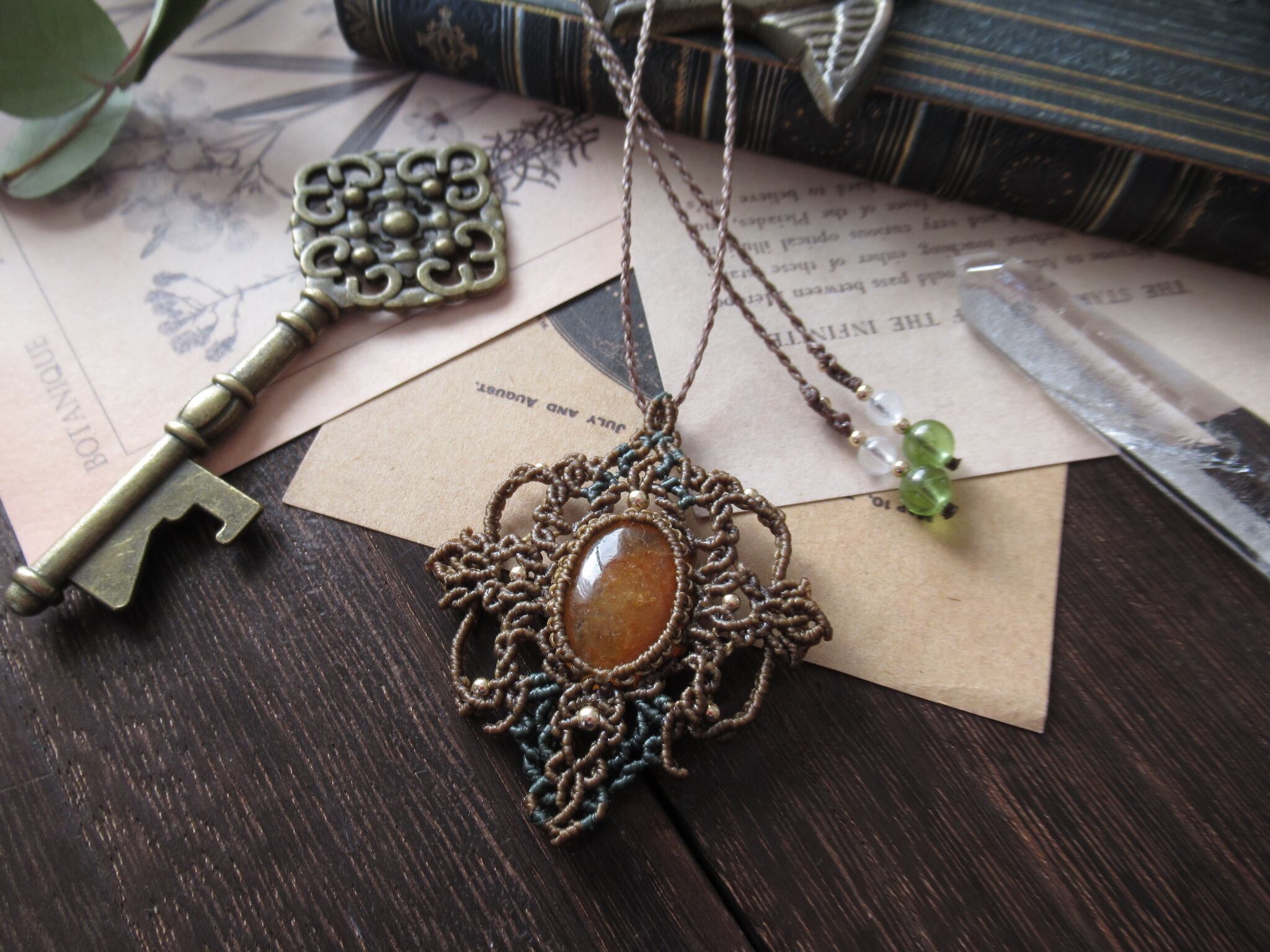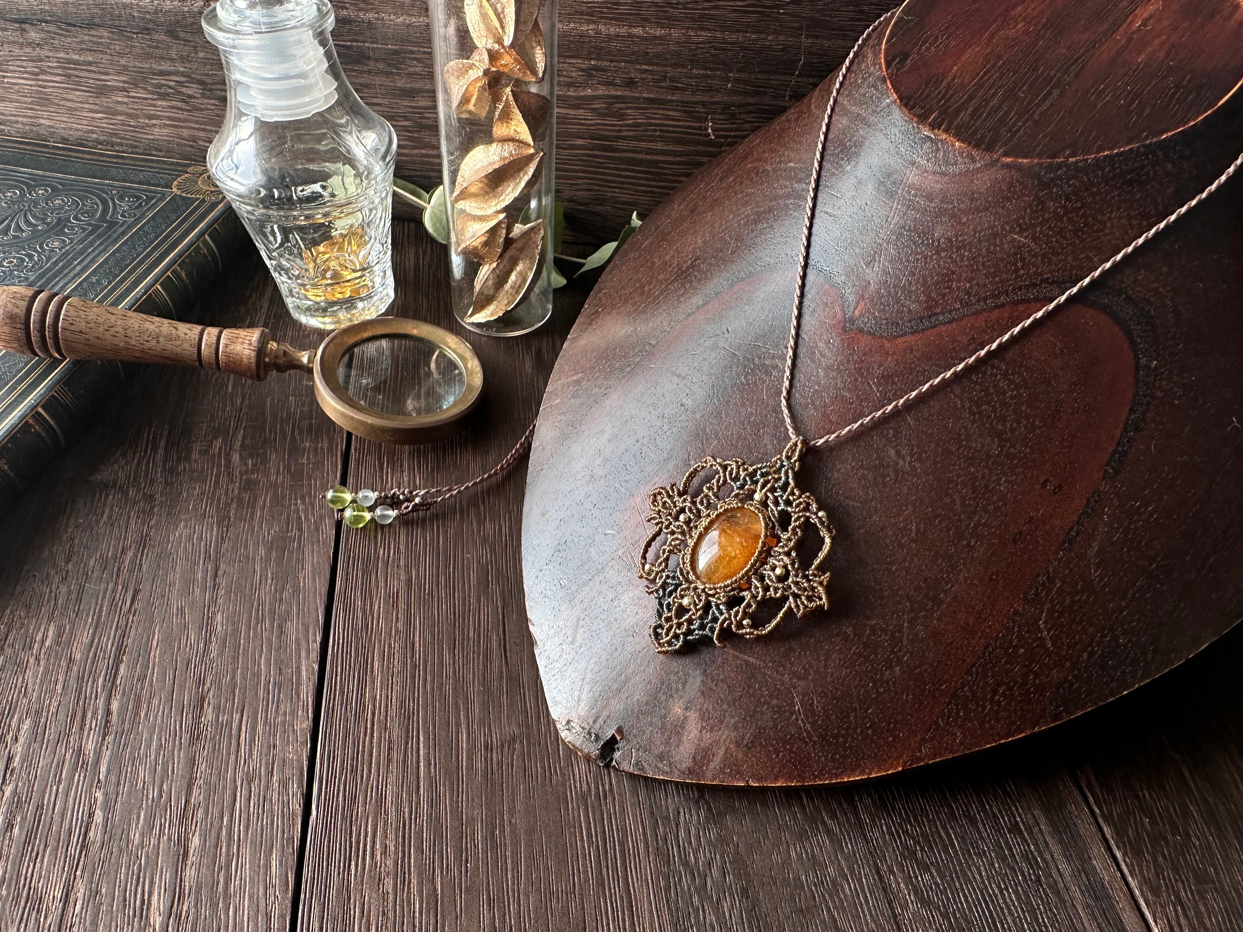 マクラメらしい編み込みを優美にほどこした紋章仕立てのペンダント。是非日常でたくさんお使いいただけましたら嬉しいです。
