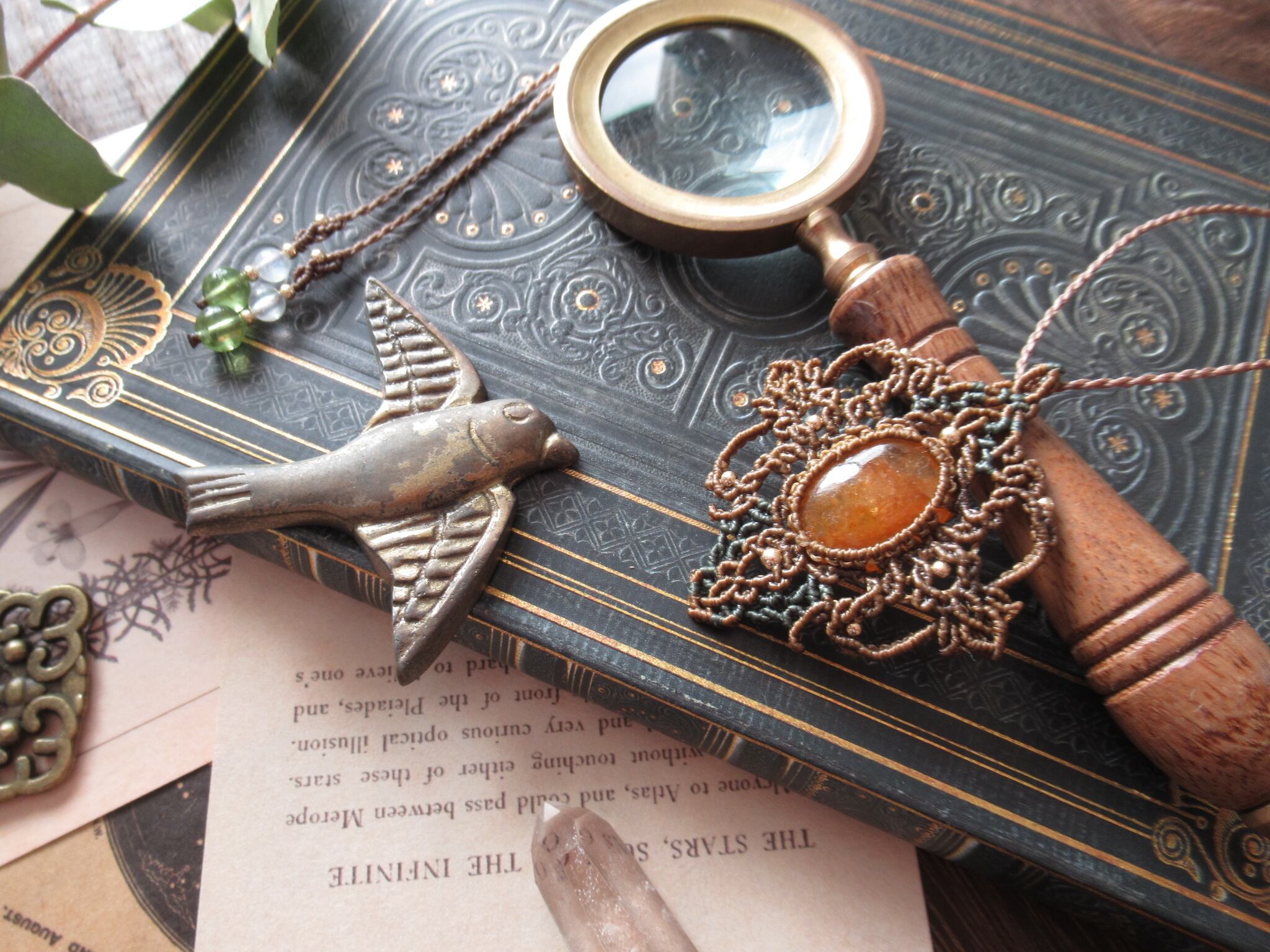 ブラウンの中にカーキグリーンを差し色で編み込み、縦横無尽に力強く成長する蔦をイメージして丁寧に編み込みを施しました。ペンダントに光が差すと影になった部分がレースのように浮かび上がります。