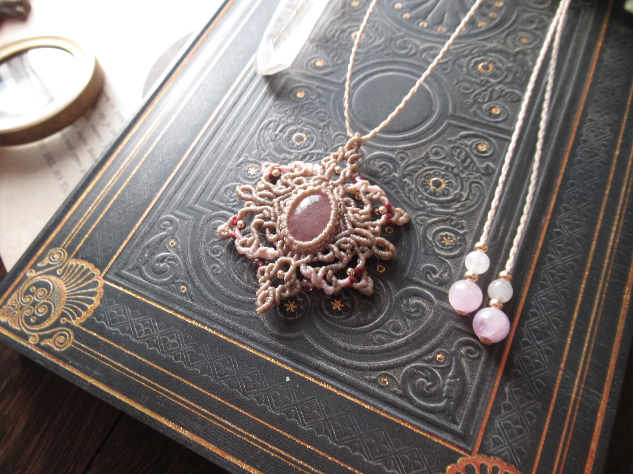 編み込みはモカブラウンを基調にアクセントとして桜色の糸とローズカラーの糸をわずかに編み込み、春を呼び込む魔法陣をイメージしながら丁寧に編み込みを施しました。ペンダントに光が差すと影になった部分がレースのように浮かび上がります。