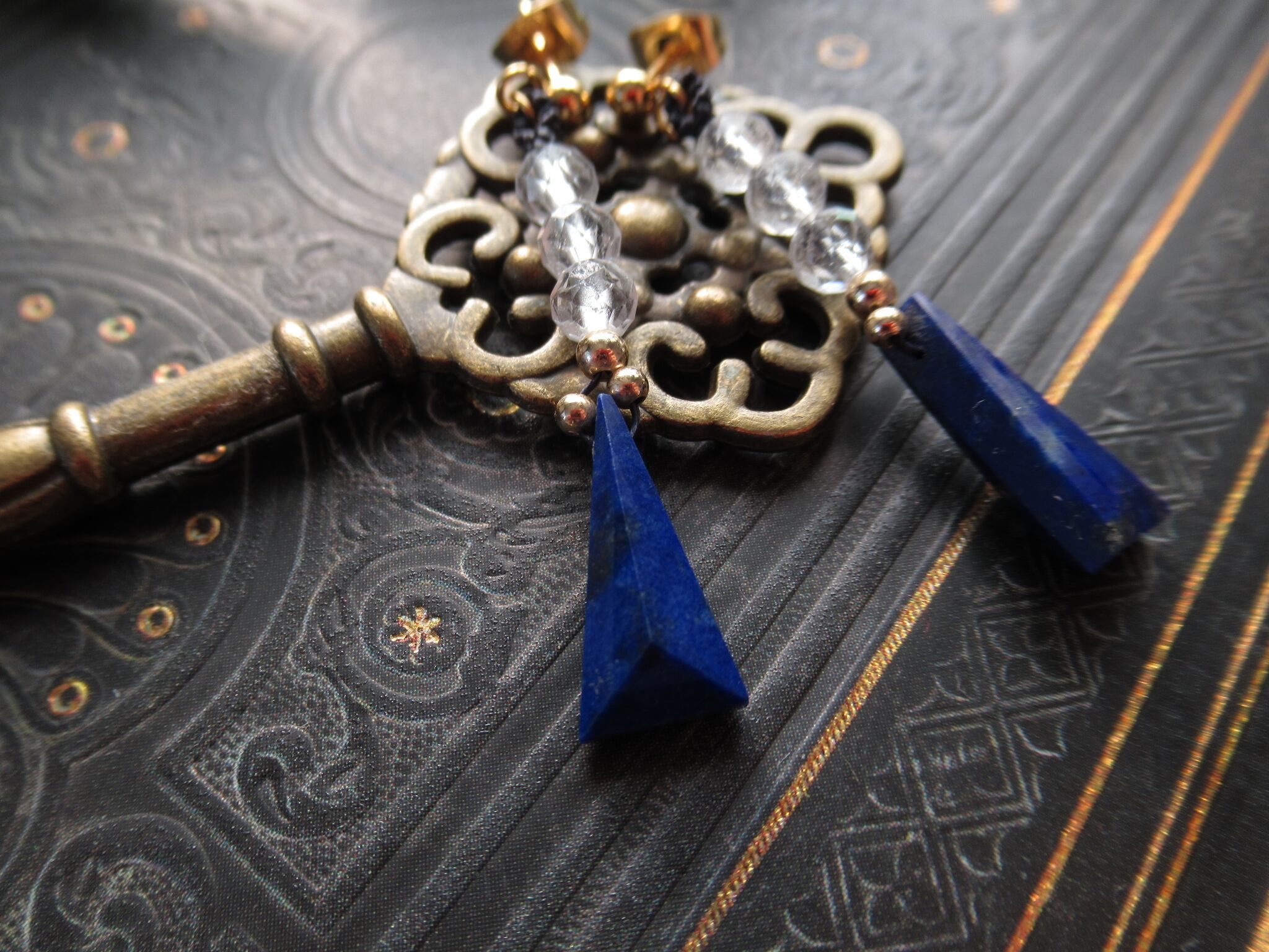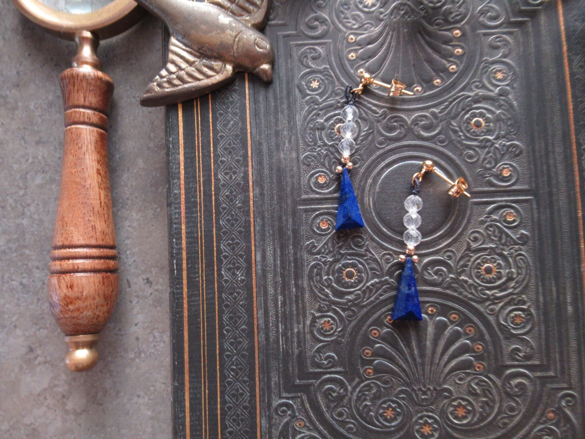 丁寧に美しく研磨された縦長のトライアングルデザインのラピスラズリに、ミラーボールのようにカットされたホワイトトパーズを組み合わせ、縦長の耳飾りをご用意いたしました。