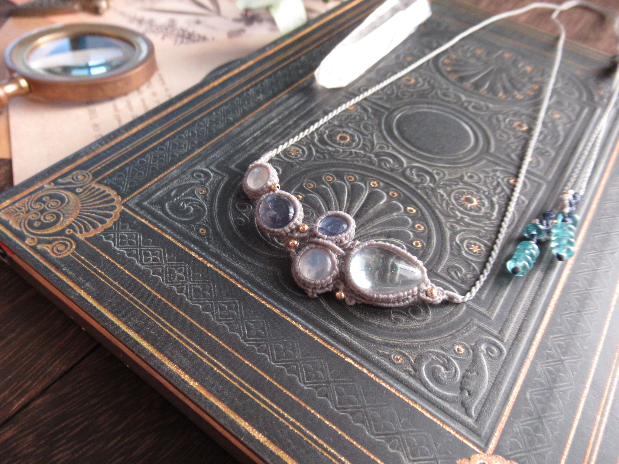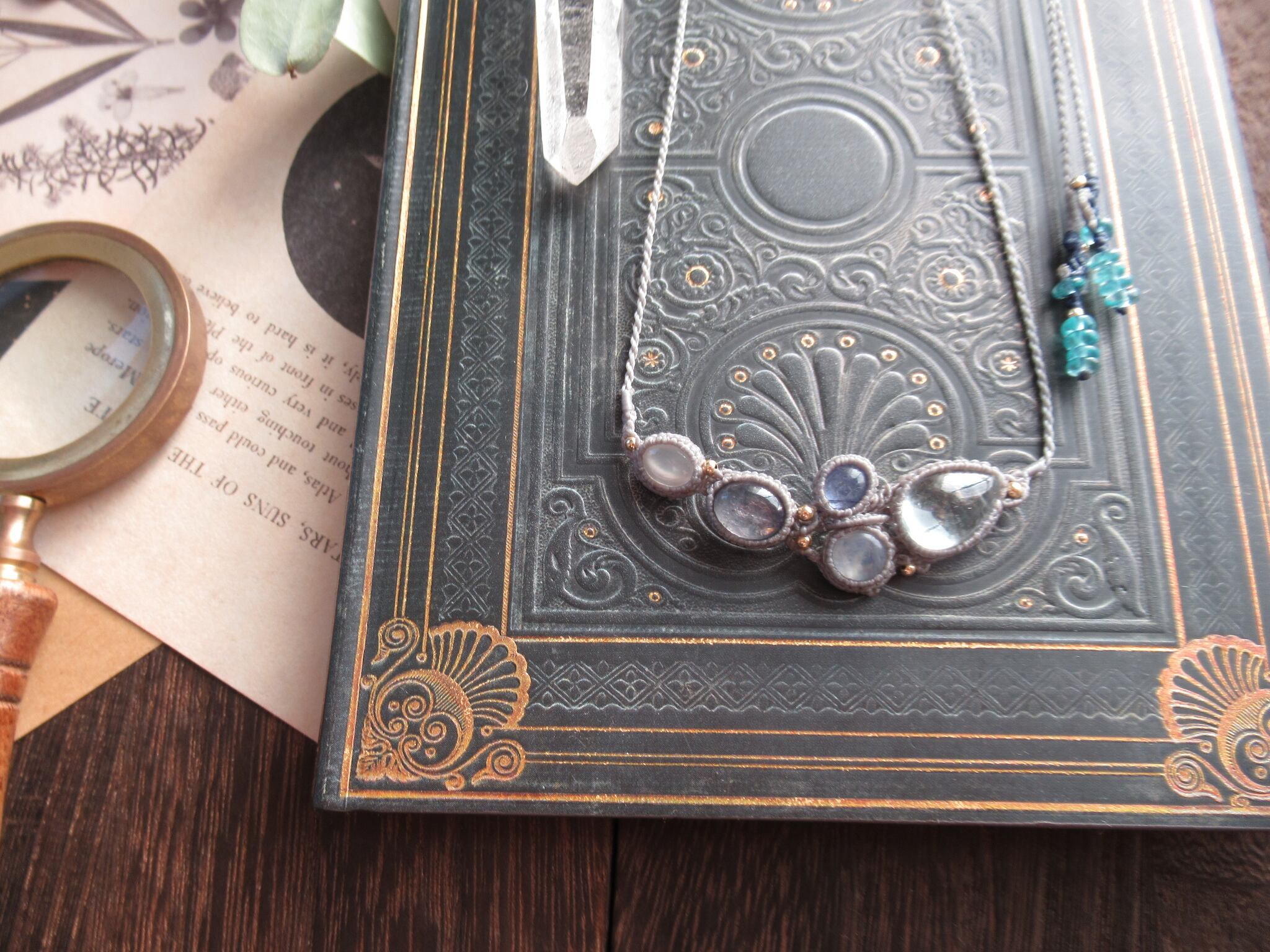 それぞれの美しい色合いを落ち着いたライトグレーの糸でそっと縁取り、丁寧に組み合わせています。緩やかにアールを描くデザインで、ネックレスの他、手首に巻き付けてブレスレットにしてお使いいただくことも可能です。