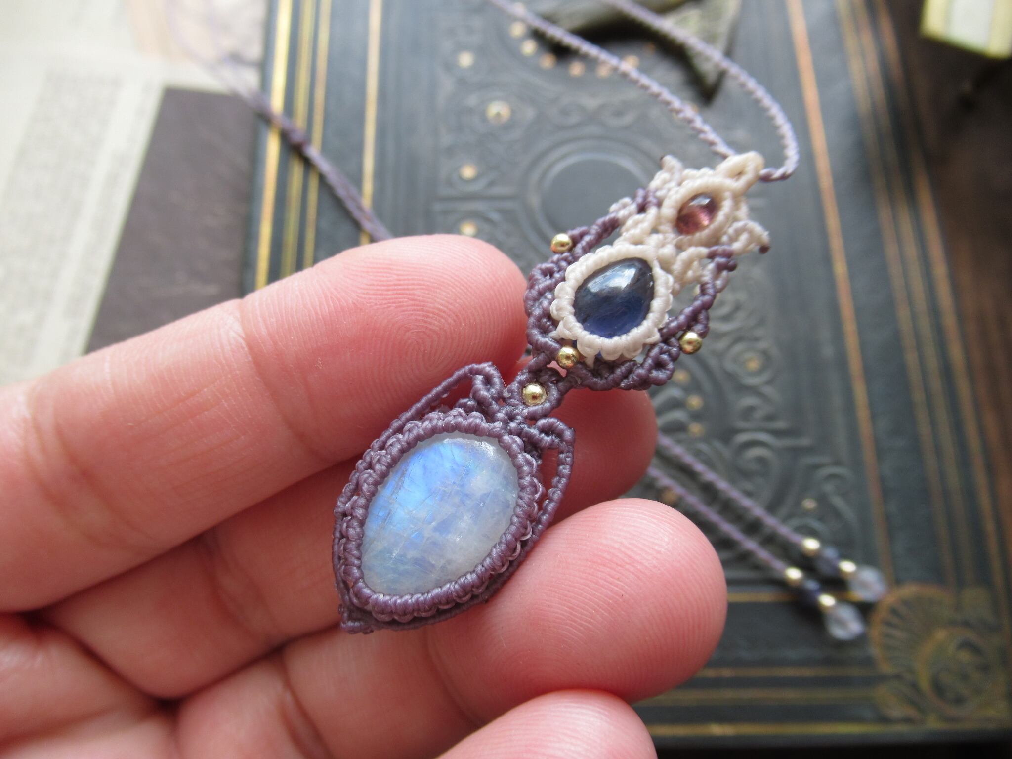 レインボームーンストーン×アイオライトのマクラメペンダント / 0.5mm仕上げ