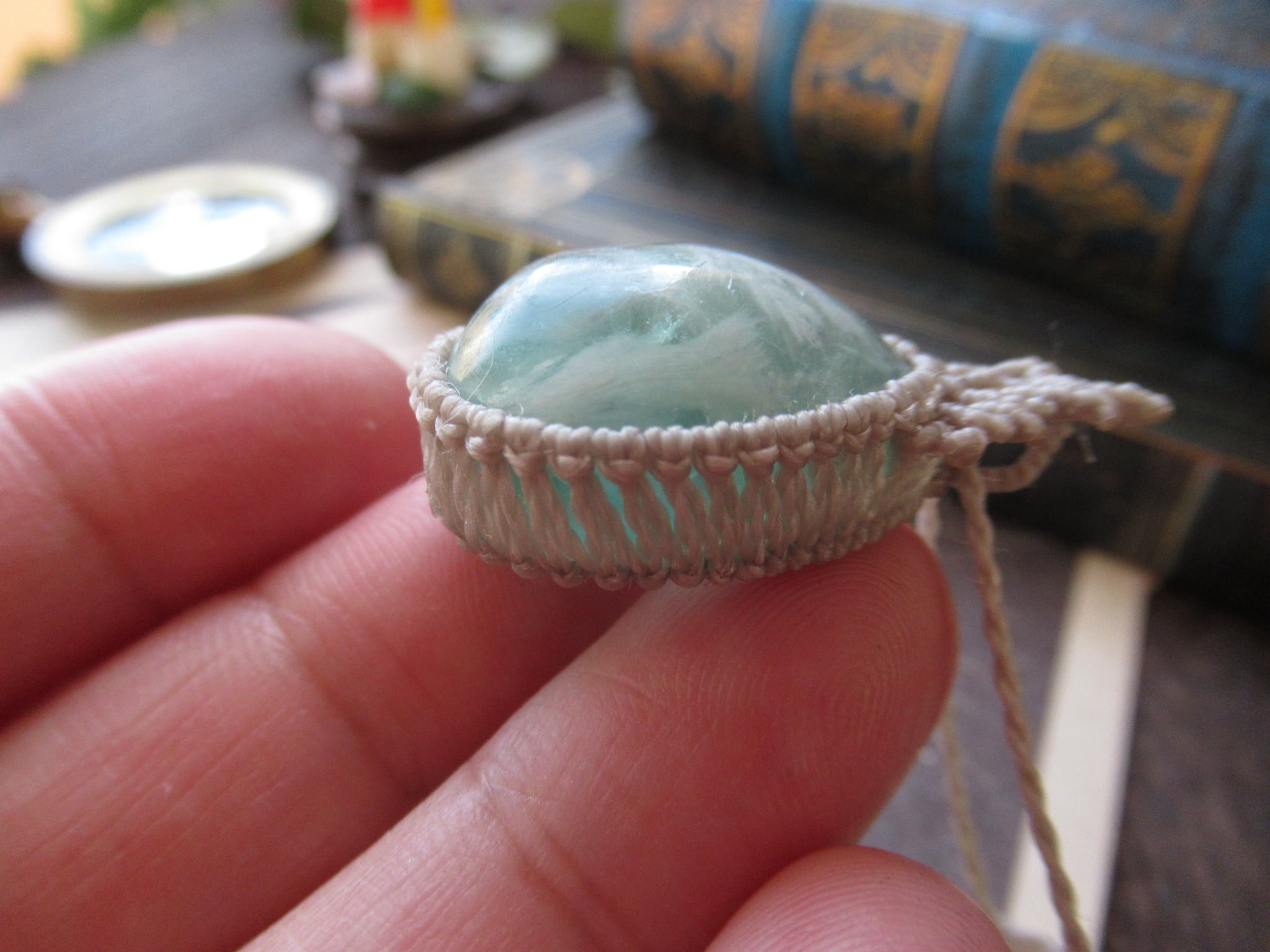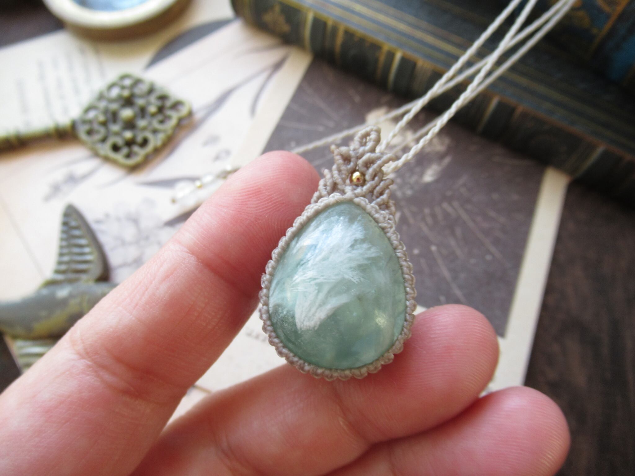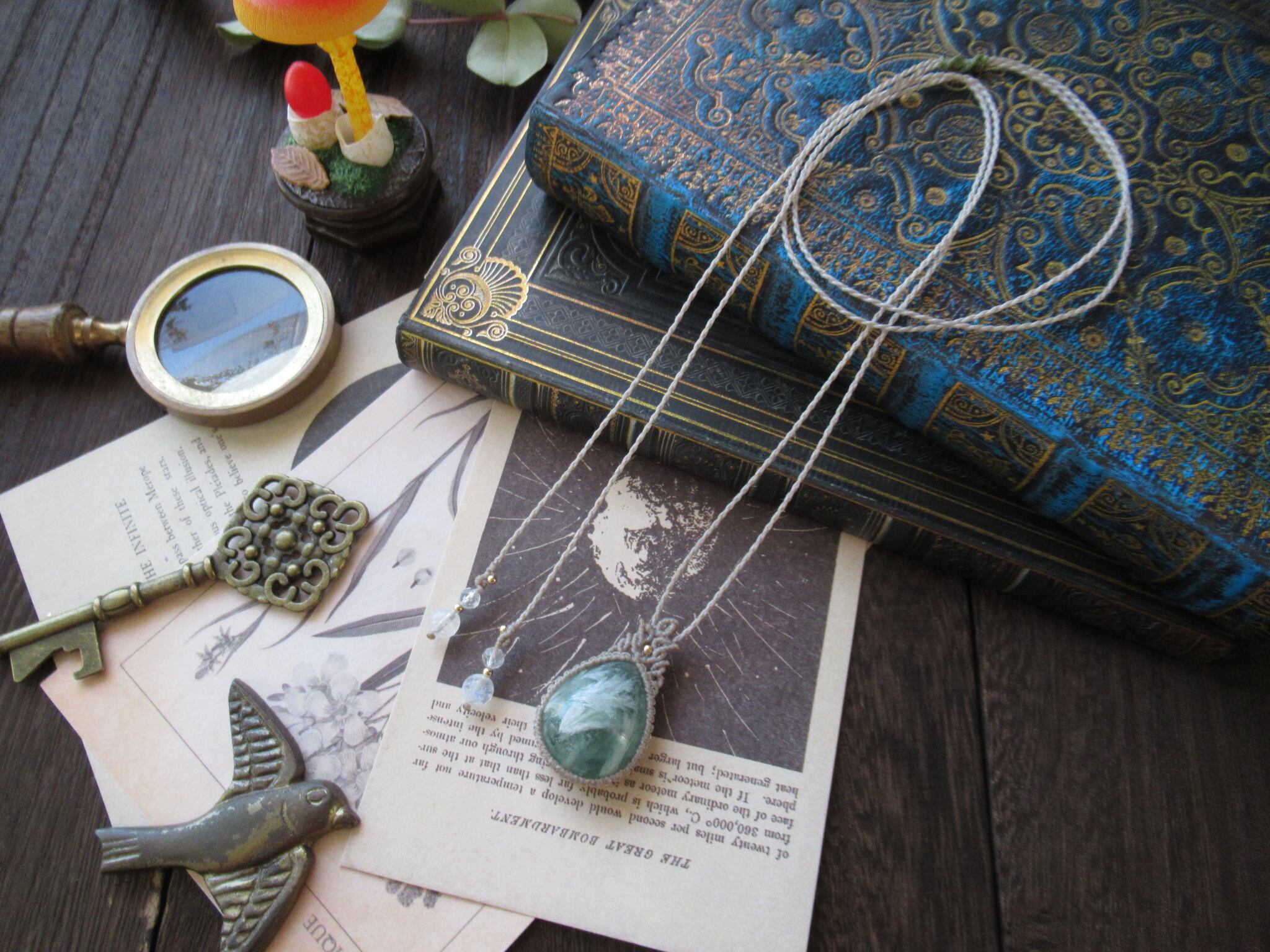 グリーンの色合いぽってりとした愛らしいフローライトの中に天使の羽根が浮かぶ、とても美しいルース。エンジェルフェザーフローライトでマクラメらしい編み込みを施してペンダントに仕立てました。