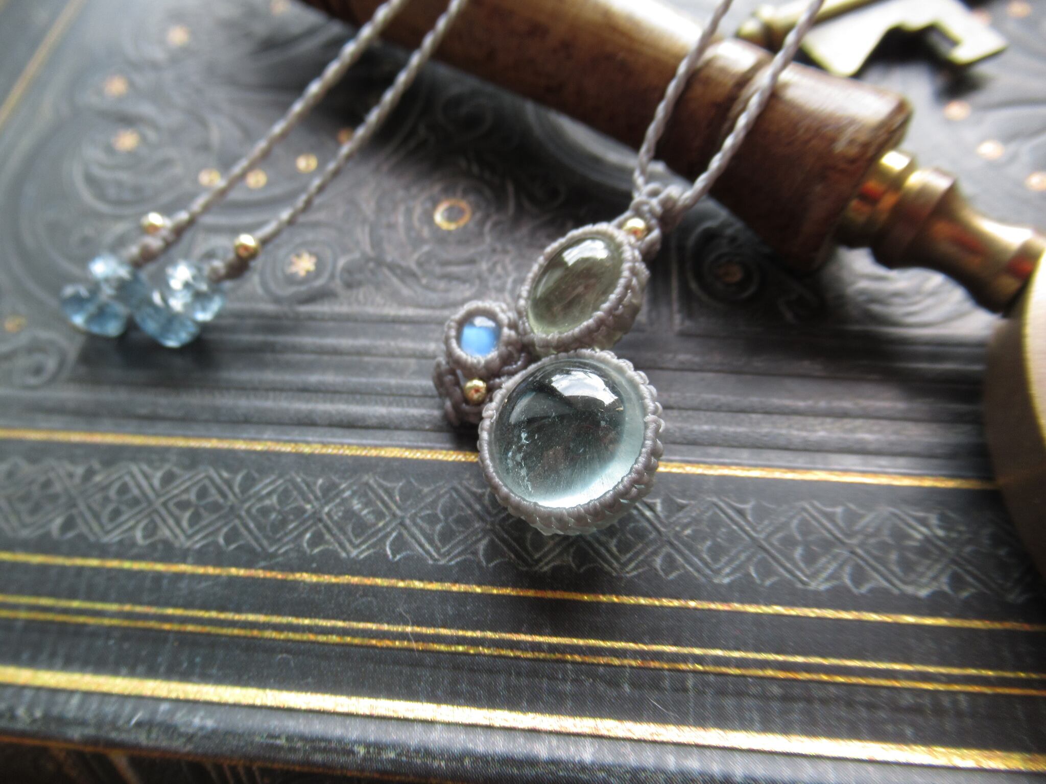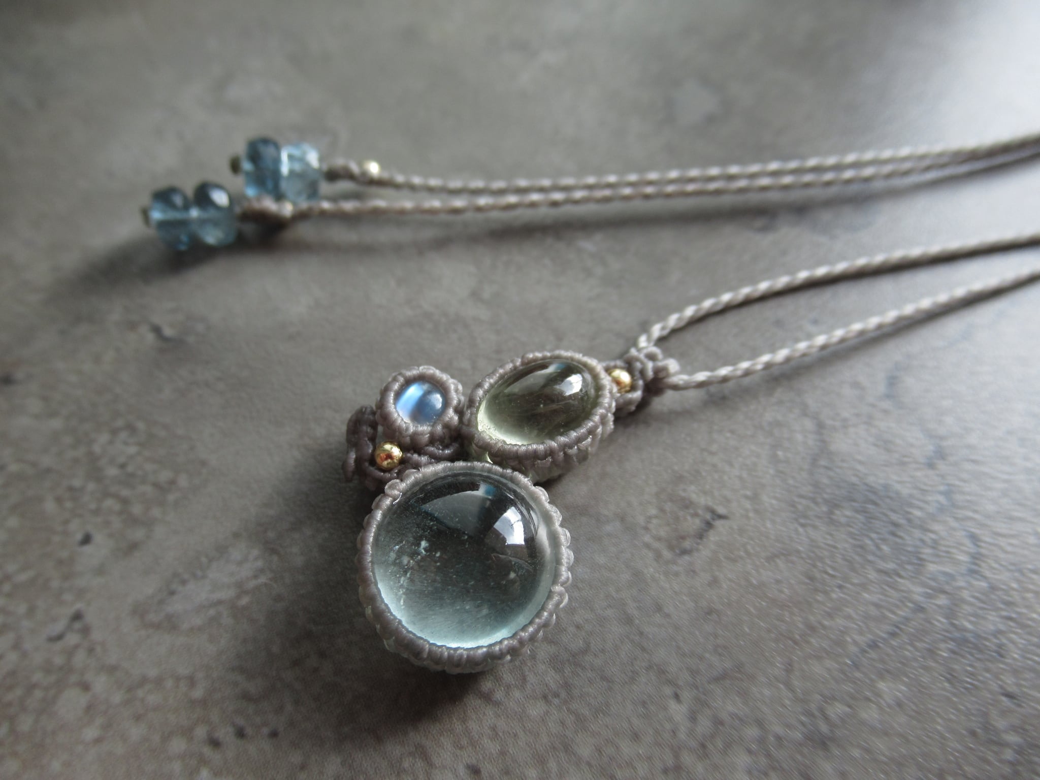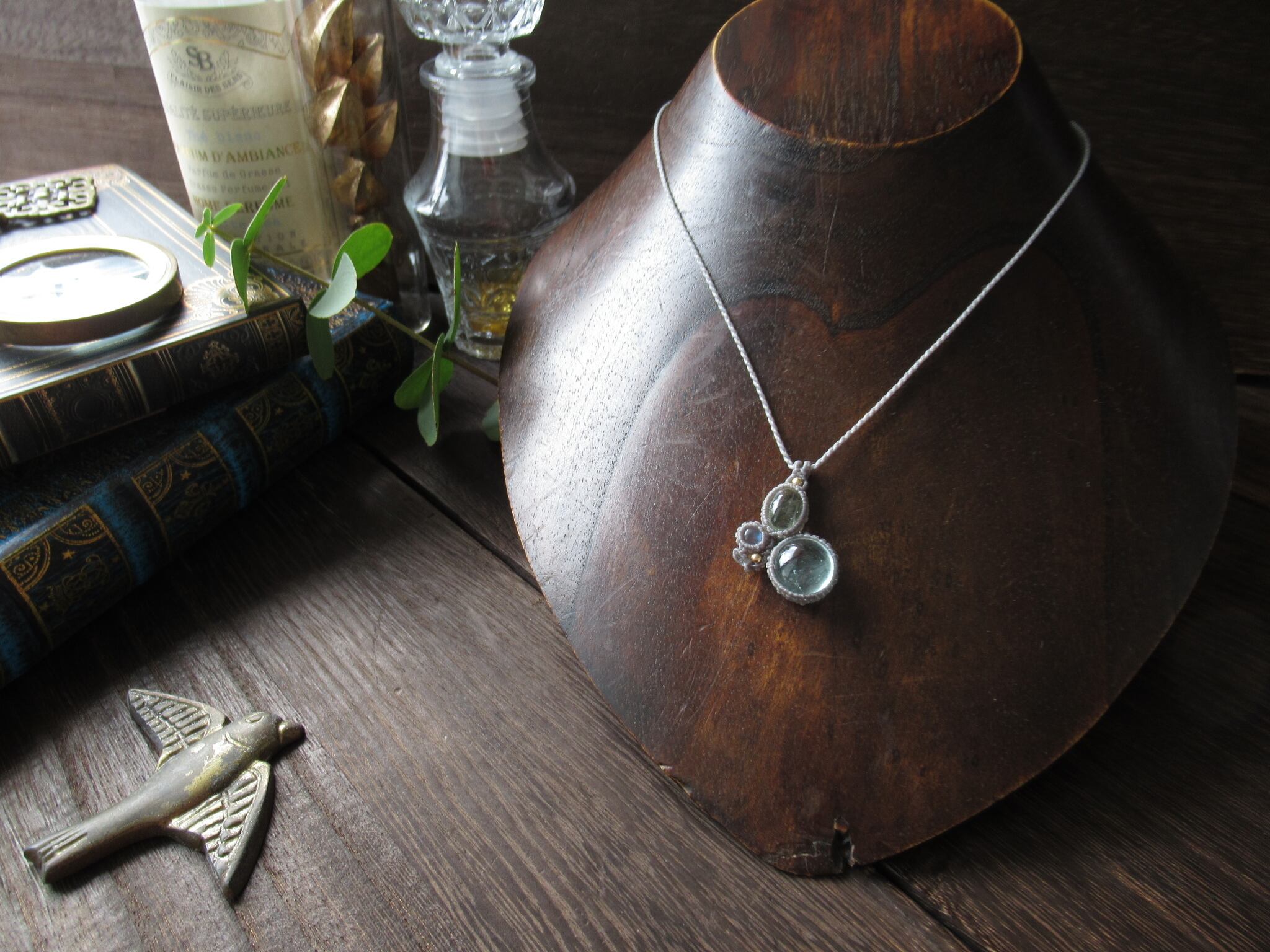 ちいさな泡が海底から光を纏ってふわりと浮かぶような情景を思い浮かべながら、丁寧に選び抜いた天然石を3粒セレクトし、ペンダントにお仕立ていたしました。