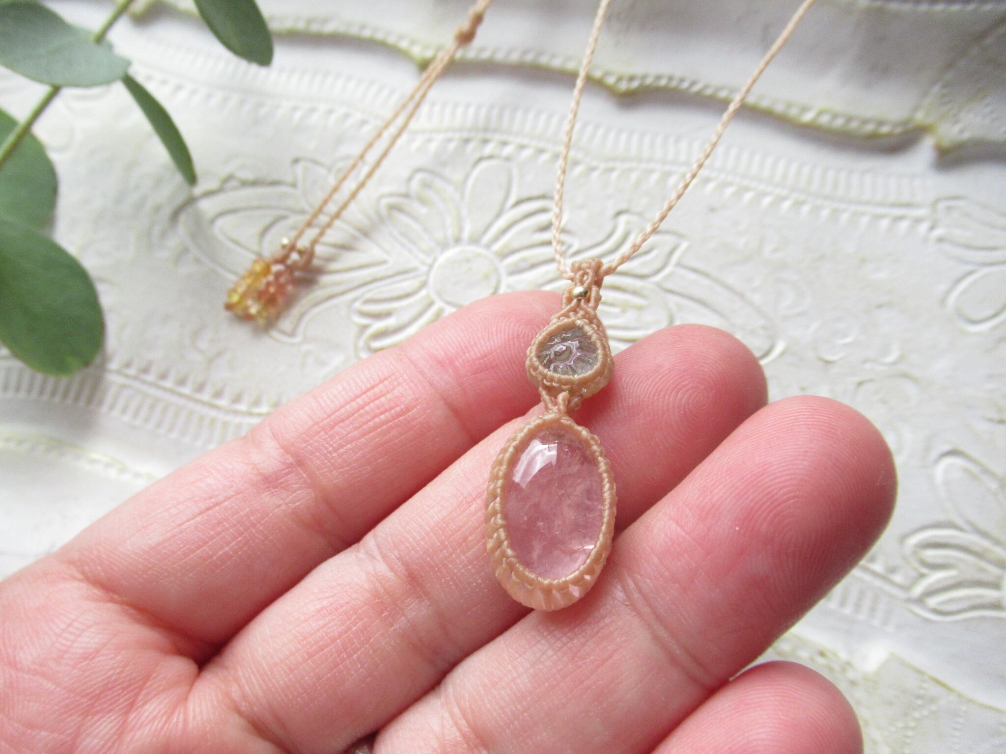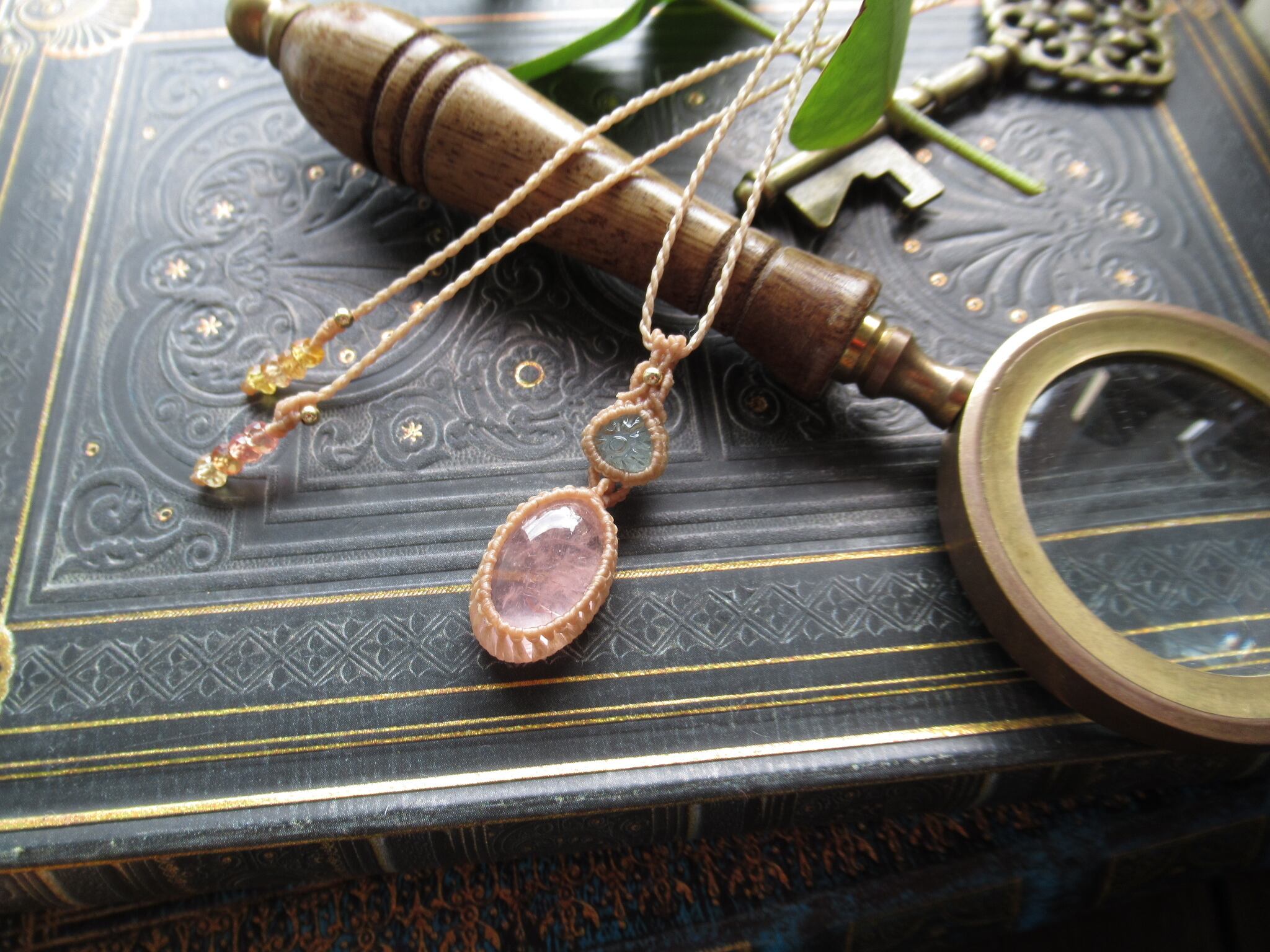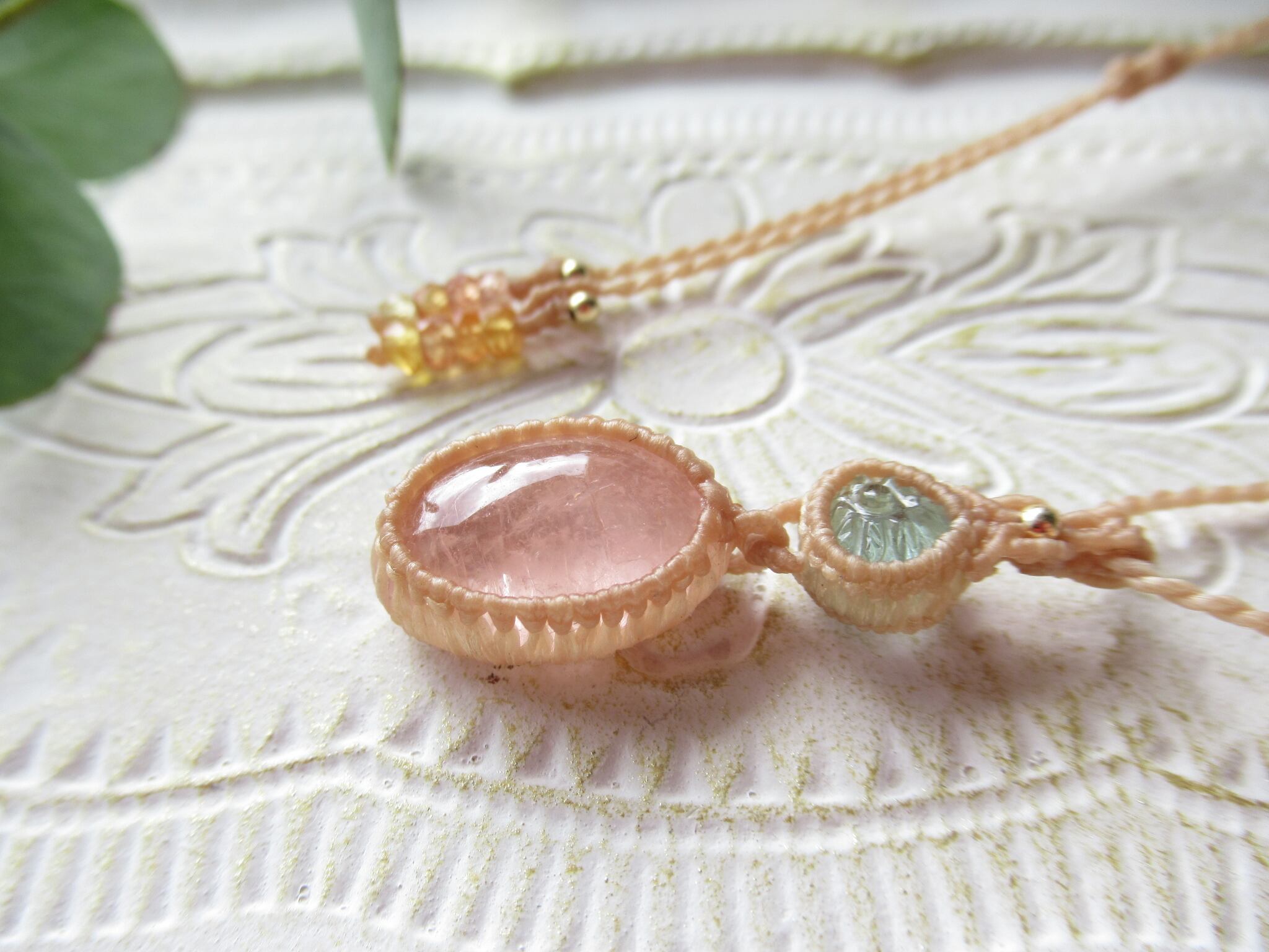 デザインはごくシンプルですが、アクアマリンの水色の優しい輝きとモルガナイトの桃色が優しいコントラストになっており、パッと明るく目を引くペンダントです。