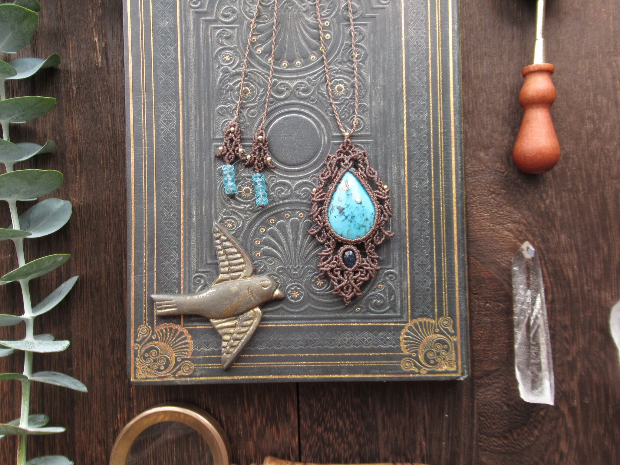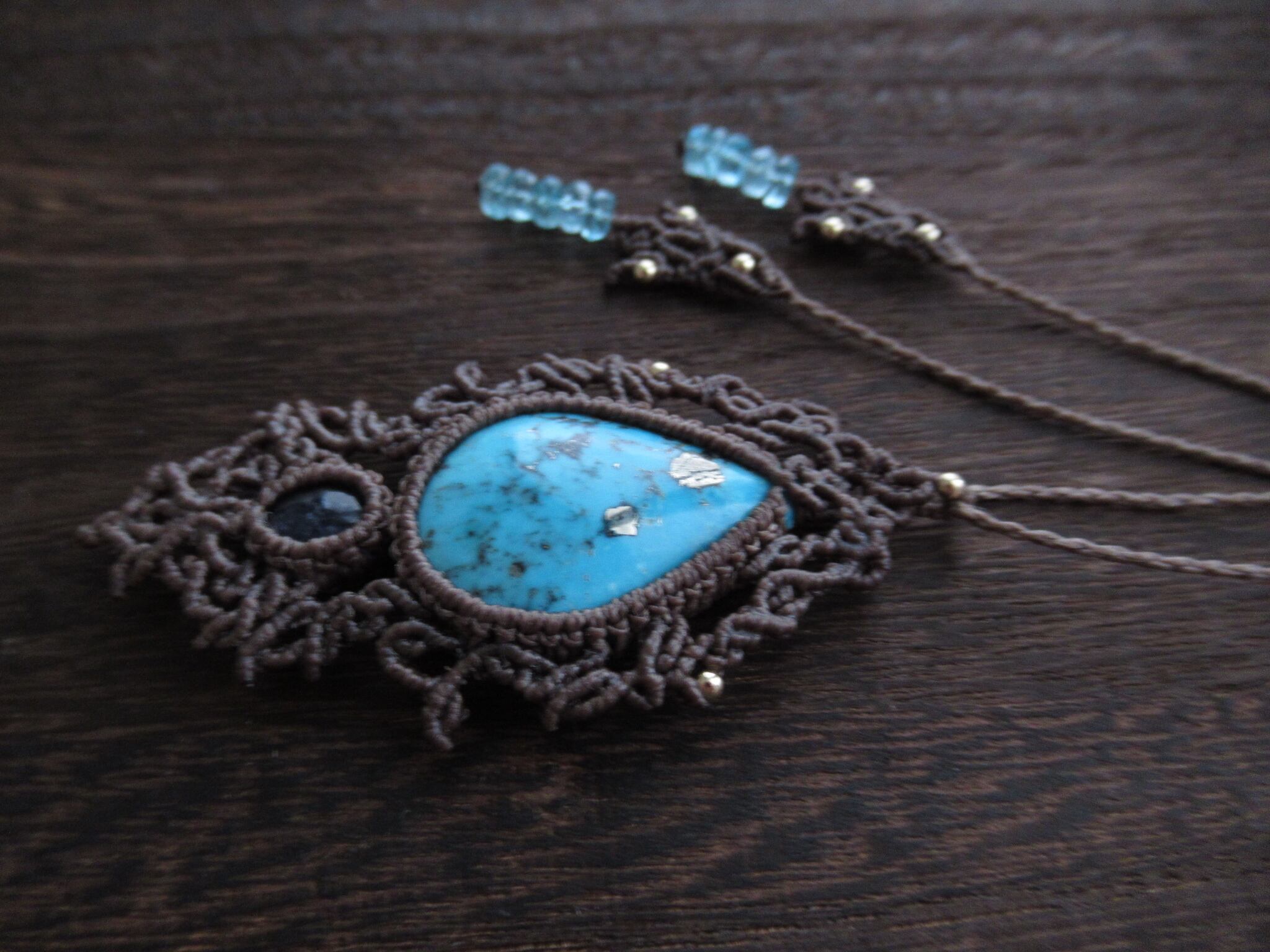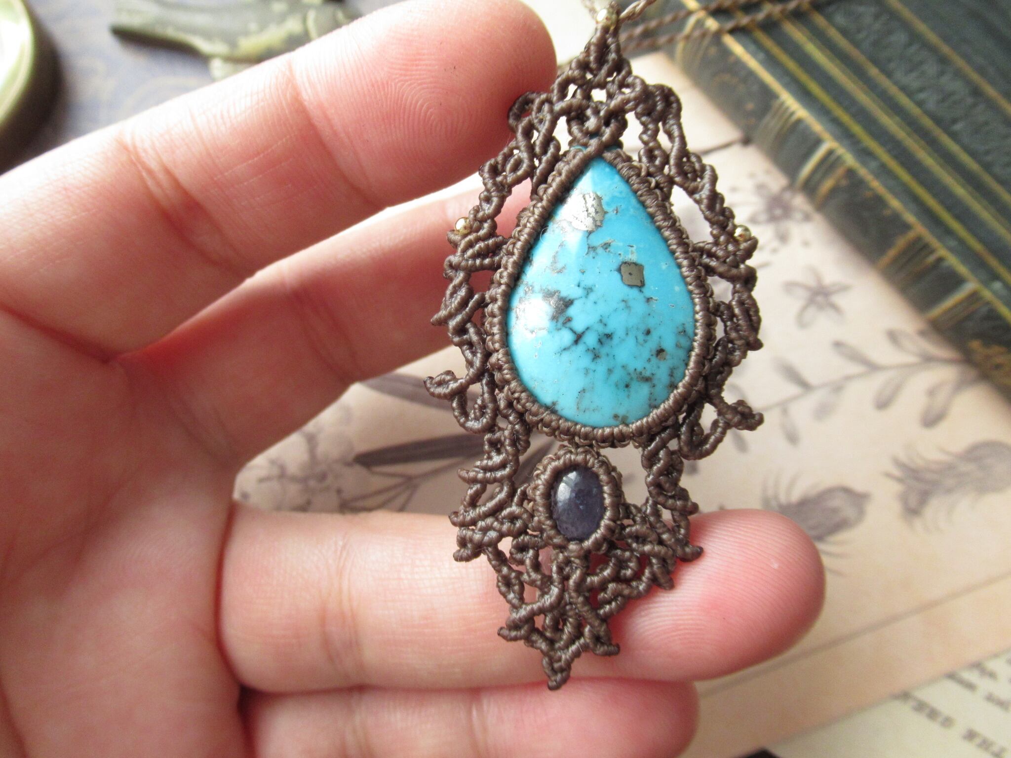 大粒ペルシャンターコイズとアイオライトのマクラメペンダント