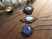 今回はこのターコイズにアイオライトを組み合わせ、縁取りを丁寧に編み込んだ大ぶりのペンダントを製作致しました。ペンダントトップの縦の長さは約6cmです。