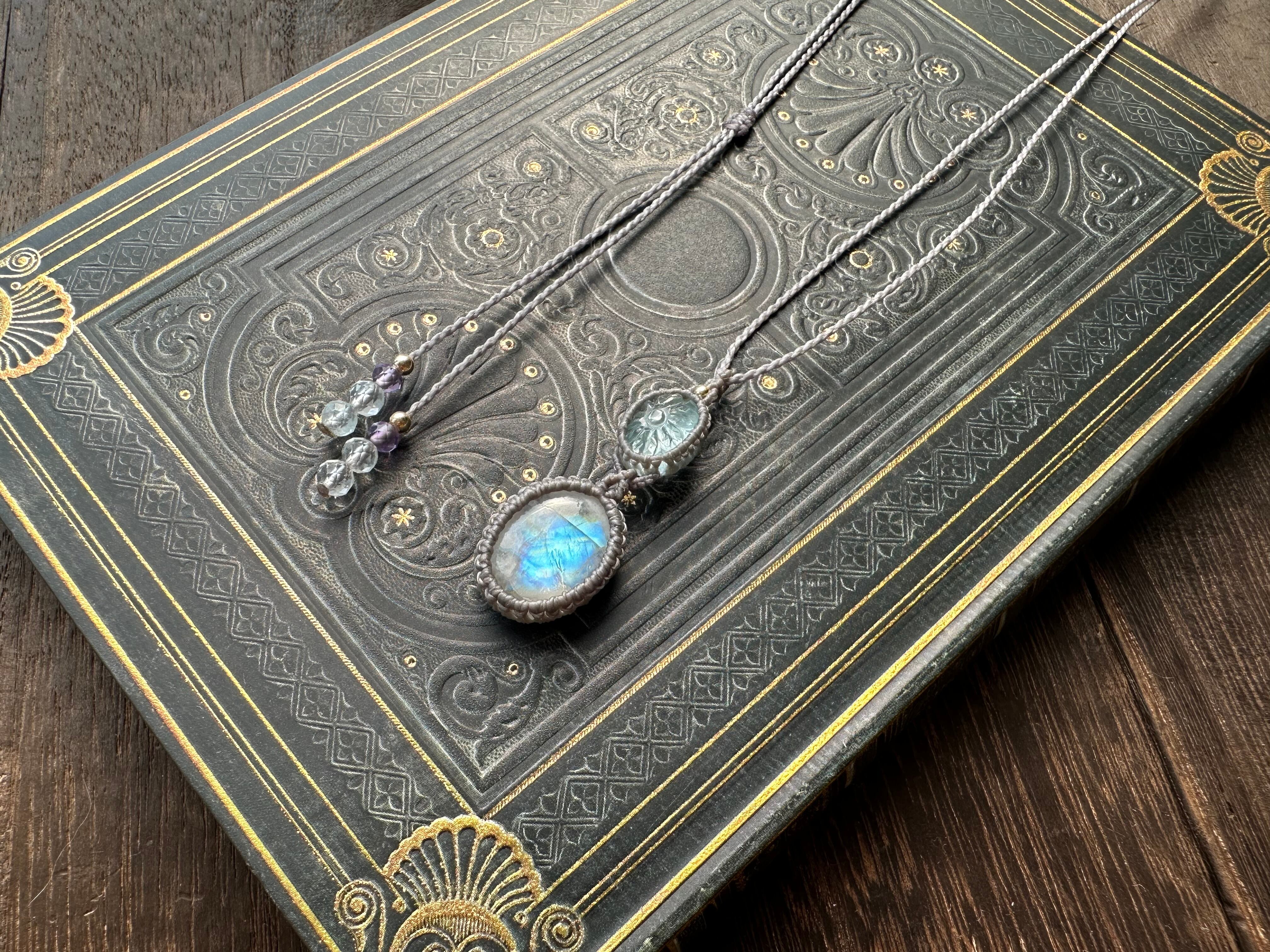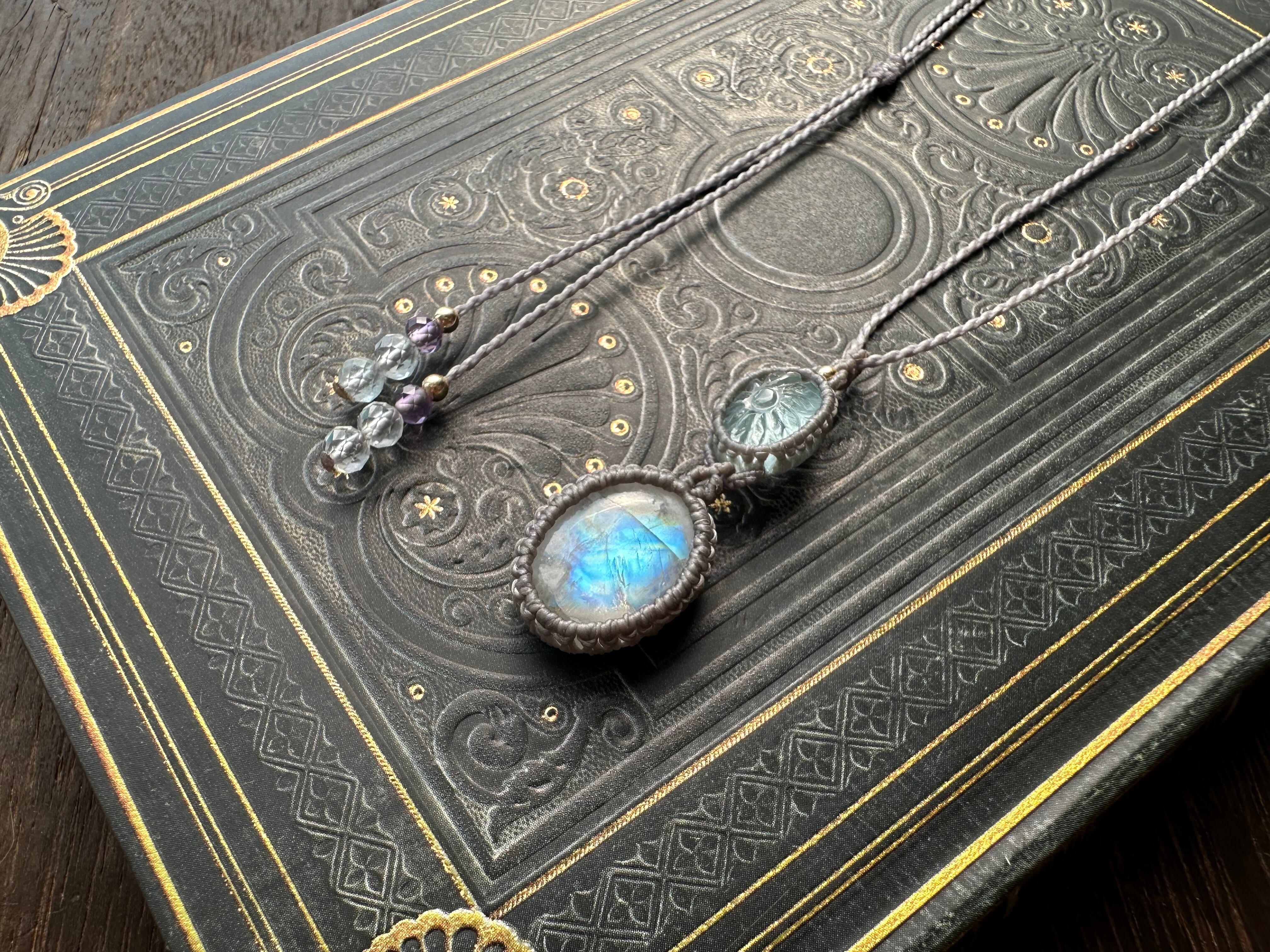 スッキリとした水色のアクアマリンと虹色の輝きが美しいレインボームーンストーンを組み合わせ、連結部分でゆらゆらと揺れるペンダントを製作致しました。